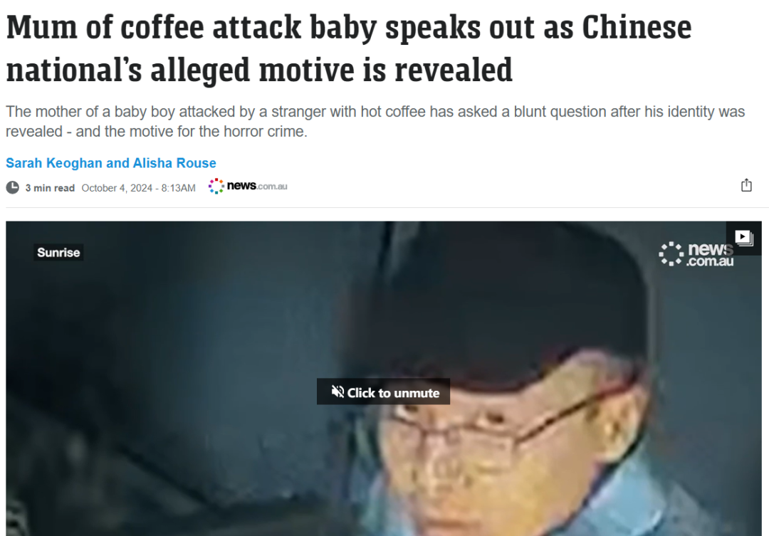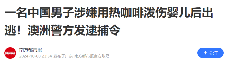 一名中国男子用热咖啡泼伤婴儿后出逃 综合澳洲和国内媒体报道,涉嫌在布里斯班Hanlon Park向一名婴儿倒热咖啡的中国男子,澳洲警方发出逮捕令。 ![]() ![]() ![]() 8月27日中午时分,澳妈带着9个月大的Luka在布里斯班东南部的Hanlon Park内野餐,突然一名男子走近他们,将滚烫的咖啡倒在Luka身上,然后逃跑。 ![]() Luka的脸部、上身和手臂被烧伤,生命垂危,在昆士兰儿童医院接受了4次手术。 ![]() 然而,澳洲警方在案件发生后反应较为迟缓,迟迟不公布嫌犯的身份,导致他的逃脱较为容易。 警方只是以故意造成严重身体伤害罪对该男子发出逮捕令,该罪名最高可判处终身监禁。然而,嫌犯在被确认身份后仅12小时就逃离了。 出入境记录是非常好查的,警方一定知道他离开澳洲后第一个目的地是哪,但始终没有公布。 据报道,该男子在袭击事件发生后迅速换了一身衣服,第二天驾车前往新州,然后于8月31日从悉尼飞离澳洲。 代理助理警察局长Andrew Massingham表示,媒体已公布嫌疑人的名字。 ![]() 警方称,这名33岁男子在澳洲没有家庭或犯罪记录,曾在昆州、新州和维州工作过,是一名流动的工人。警方调查了他的工作场所,和一些他曾经的同事取得了联系。 警方称,这个人“了解警方的方法,而且肯定在进行反监视活动”,这使得调查变得相当复杂。 在小红书上,也有网友称,认识这个人,他“很奇怪”,不好打交道,长期持有学生签证在肉厂打工。 ![]() 另有报道称,该男子来自中国杭州。此前,曾有人发现疑似该男子的Facebook账号,上面显示该男子疑似叫做“Huang Yue”,所在地为“Hangzhou”,但曝光后该页面被迅速删除。 持学生签证,长期打工,显然符合澳洲政府此前重点打击的对象,也就是“假的留学生”。为了打击这些“假上学而到处打工”的人,澳政府已经关停了大批“幽灵学院”,并且收紧了签证的申请。 Massingham说:“我们将继续在全球范围内寻找犯下这一可怕罪行的人...我们将全力以赴找到这个人,并让他承担责任。” “这名男婴受到的伤害伴随一生。” Luka的母亲表示,袭击者已不在澳洲,这让她松了一口气。 ![]() 部分中东航班恢复 据报道,伊朗民航组织发言人3日说,在确保有利、安全的飞行条件及限制措施结束的情况下,3日5时之后允许航空公司开展航班业务。 报道援引伊朗南呼罗珊省机场相关负责人的话说,航空公司已获准在3日5时后执行航班业务。其中一家伊朗航空公司往返德黑兰和比尔詹德的航线8时已重新开通。 伊朗民航组织发言人1日晚宣布,受该地区局势和可能的导弹袭击影响,直至2日10时前,取消伊朗所有航班。2日,伊朗又将领空关闭时间延长至3日5时。 ![]() 10月3日,德国汉莎航空表示,将从周四起恢复飞往部分中东地区的航班,但将避开伊朗和伊拉克大部分地区的空域,直至另行通知。汉莎航空表示,其航班将通过伊拉克北部走廊飞往埃尔比勒市,但会避开伊拉克其他地区的空域。恢复飞往埃尔比勒的航班的同时,也将恢复飞往约旦安曼的航班。汉莎航空此前曾暂停飞行需要通过约旦领空的航班直至本周三。 目前,卡塔尔航空米兰飞多哈,正在经过约旦上空。 ![]() ![]() Travel Radar 最及时的实用旅行资讯 欢迎关注我们小号:旅行雷达助手 突发特价,新鲜特惠,BUG发布 喜欢,就点个「在看」吧~~ |