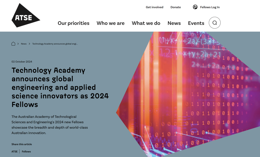 ![]() ![]() 内容来源:时代学者(仅转载,不代表本号或本单位观点) 2024年10月2日,ATSE(澳大利亚技术科学与工程院)公布新增32位院士。ATSE院士由同行选举产生,在应用科学、技术和工程领域有重大影响力。 ![]() 澳大利亚技术科学与工程院是澳大利亚应用科学领域的一个非政府组织,内部人员分布在应用物理科学与技术、应用生物科学与技术、工程,管理开发和领导等4个大的专业领域。 入选华人学者简介
