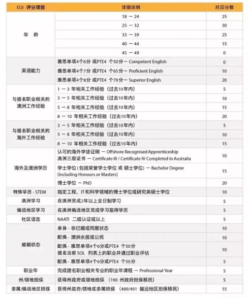 以下是技术移民EOI算分表: ![]() 无论是打分制技术移民哪个类别,满足65分仅仅是申请起步分,并不代表肯定会获邀。EOI递交后有效期为两年,两年期满内申请人未被获邀则需要重新提交EOI。 技术移民的获邀优先权大方向上是分高者得,但各州的优先邀请标准差异也比较大,有的侧重工作经验,有的侧重州内紧缺职位,甚至是配偶是否优秀或单身,而且这些规则并无规定规律,不定期变更。 因此,在充满变数的打分制技术移民政策中,只有北领地MINT技术投资类是确定性的,除了满足技术类的最低申请分,还需要在获得配额占位后投资52.5万澳币。