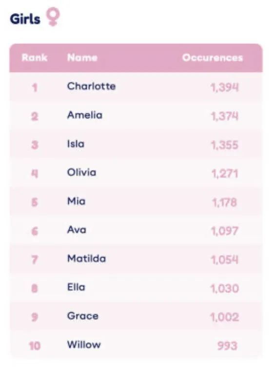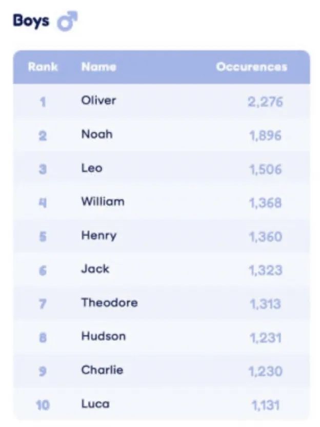 ![]() ![]() 就在最近,McCrindle Research发布了澳大利亚今年最受欢迎婴儿名字的年度调查结果。 谁能想到, 都2024年了, 名字之间都有了竞争... 而在各州和地区统计了新生儿名字后,斩获胜利的名字分别是Charlotte和Oliver!让我们恭喜一下这两个名字受到了全澳洲人民一致的喜欢! 快来看一下今年你的名字有没有进入到排行榜中呀。 ![]() 不过,在社会调查员的统计后发现,现在越来越多的澳洲人都“抛弃”了传统的澳大利亚名字。 受欢迎的男生名字居然变成了这些! 往年名列前茅的男孩名字Matthew,在2024年居然下降了38个名次! 还有Jaxon(下降了34个名次)、Joshua(下降了28个名次)、Caleb(下降了26个名次)和Ryder(下降了25个名次)。这简直是大大洗牌了啊! ![]() 而Oliver已经连续第十年 成为澳大利亚最受欢迎的男孩名字! 今年,1,896个男生叫Noah,1506个男生叫Leo,1,368个男生叫William,1323个男生叫Henry。 Theodore今年首次进入前10名,将Lucas和Thomas赶出了榜首... ![]() 小悉帅每天第一时间跟大家分享悉尼最新的大事小事,记得关注悉尼生活资讯,接下来那些吃喝玩乐奇闻趣事跑不了的! ▼长按这个二维码▼ 悉尼新闻抢先知道! ![]() 女生的名字居然变化这么多! 不过说到女孩的名字,以前深受大家喜爱的Anna居然排名跌幅最大,下降了38个名次! Hannah和Eliza,也都分别下降了15名次和12个名次。 而Charlotte在2022年短暂跌至第二名后 重新夺回了榜首位置! 今年的第二名是Amelia,有1,374个女生叫Amelia,有1,355个女生叫Isla,有1,271个女生叫Olivia,有1,178个女生叫Mia。 ![]() 好多新的名字正在出现! 不过根据统计来看,在未来的几年里,澳大利亚人将会有越来越多好听的新名字,男孩是Reuben、Remy和Theo,女孩是Margot、Thea和Maeve。 最近正在思考给自己取个英文名的小伙伴们可以参考一下~ ![]() 好多90后的新生代父母,现在都喜欢特立独行,将传统名字加上创造力,变成一个和别人看起来不同的名字。 比如:Sophia变成了Sofia,Holly变成了Hallie。 还有好多家长,甚至偏向于给自家的宝宝取个中性风格的名字。 Charlie、Riley、Jordan、Casey、Jamie和Taylor等名字越来越受欢迎。 只能说新生代的家长们果然想法更多! Perfect Lover 澳洲最大华人婚恋交友平台 如果单身的你在澳洲苦苦找不到幸福,那你一定错过了Perfect Lover,因为这是你找到爱情的最“完美”捷径。 这里有最庞大的澳洲华人单身男女数据库 这里有最专业的红娘一对一服务 这里有最高效的配对机制 这里有最丰富的交友活动 最最重要的是: 这里有最高的脱单率! ![]() Perfect Lover公众号 每周都会推荐心动男生/女生 关注Perfect Lover公众号 给自己一次心动的机会! ![]() 如果你真心想要寻找心中的“Perfect Lover” 如果你正好在 澳洲或新西兰 如果你 年龄在20-50岁 那就先从Perfect Lover开始! 扫码添加小红娘微信 ![]() 说出你的要求和条件 为你匹配Perfect Lover! (本文图片来自网络) ![]() ![]() ![]() ![]() ![]() ![]() ![]() 告诉大家一个了解悉尼生活资讯的小诀窍。现在只要点亮一个小星星🌟,每天就能在第一时间看到各种最新鲜的资讯!悉尼哪里打折💰,哪里有好玩的活动🎉,哪里的餐厅最实惠🍰,哪里有同乡聚会👬,还有悉尼各种政策福利、隐藏技能,全都知道啦! ![]() 悉尼人都爱看的 悉尼生活资讯 ![]() 惋惜!澳洲最长寿110岁老人突然离世!如果不是这个可恶的凶手,他本可以活得更久…![]() 澳洲躺平以来最大好消息!变异毒株开始稳定,确诊大幅下降!疫情宣告尾声!多国彻底放开国境!![]() 国际巨头预测:2023年中国开放国门!3个月,7条重磅利好消息!距离国境解封,可能真的不远了 ![]() 澳洲街头惊现大量恶霸!可能就藏在你家拐角!上千人被突然袭击,有人头破血流,险些毁容… ![]() 高传染性!消失几十年的病突然卷土重来!澳洲专家称病毒已变异!悉尼开始检测污水! ![]() 悉尼女老师确诊新冠2天内去世!7岁女童确诊3天去世,心脏、大脑都肿了!恶化速度突破认知…![]() 震撼全世界!澳洲街头被红色大军瞬间吞没!浩浩荡荡向西北移动!看得华人都忍不住了…![]() 今天才知道,澳洲人原来真的这么穷… ![]() 文章好看就点这里 ![]() |