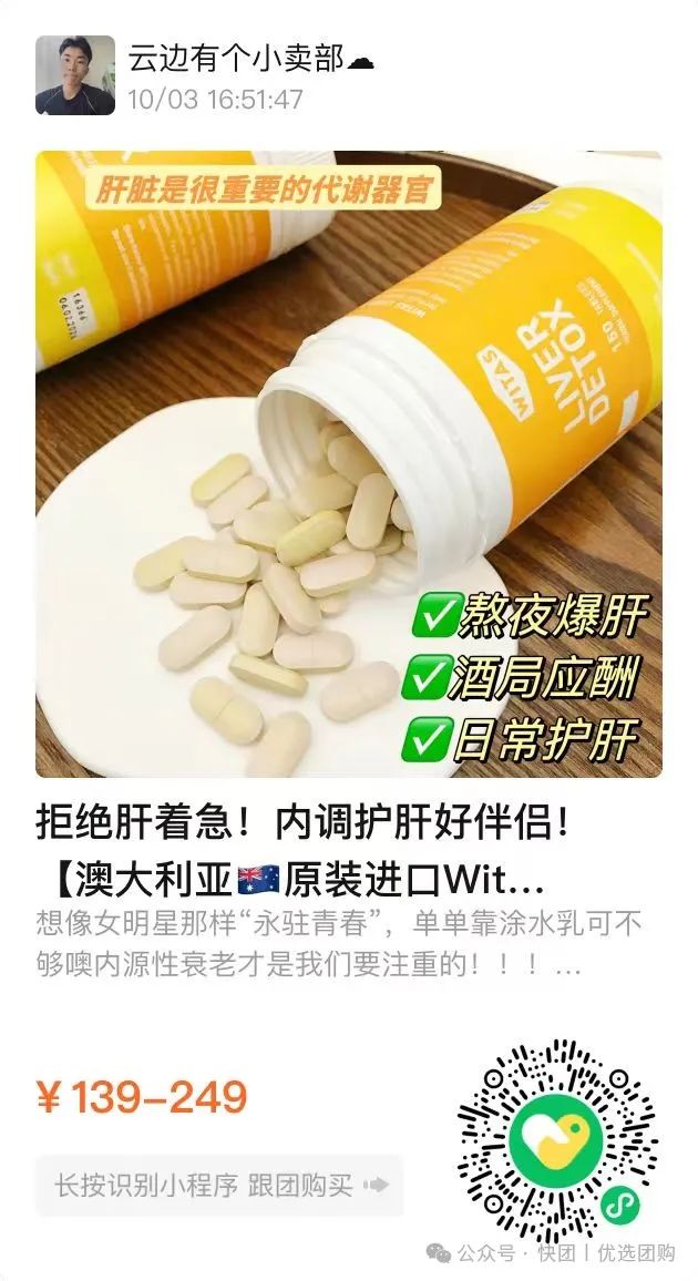 【澳大利亚🇦🇺原装进口Witas复合护肝片】 团购秒杀:139 (直接图一扫码下单即可) ![]() 拒绝肝着急!内调护肝好伴侣!【澳大利亚🇦🇺原装进口Witas复合护肝片】 某猫1瓶218‼️ 开团1瓶低至💰139❗2瓶仅需249‼️ 👉三重草本🌿成分奶蓟草➕朝鲜蓟➕姜黄,内服调理绝绝子!👉70倍浓缩工艺提纯!!每一片都是满满的水飞蓟素精华!👉每天吃2粒,清肝+护旰一步到位👍#日常养生# 版本:一般贸易 📅日期:2026年1月 快递 团管理订单管理商品核销 今天 发布 跟团中305天20小时31分54秒后结束 ![]() ![]() ![]() ![]() 想像女明星那样“永驻青春”, 单单靠涂水乳可不够噢 内源性衰老才是我们要注重的!!! 澳大利亚🇦🇺进口Witas复合护肝片🌀 添加护肝大佬水飞蓟 ,以及多种天然草本成分 ✔️抗自由基✔️抗氧化✔️降脂✔️保肝利胆 自由基被控制住后, 我们脸上的肝斑、黄气暗沉、就会满满消失‼️ 还能够降低因为自由基反应引起的器官退化 它就是女明星抗衰的秘密武器 一天两片,净化肝脏,充盈气血!延迟自然衰老 |
