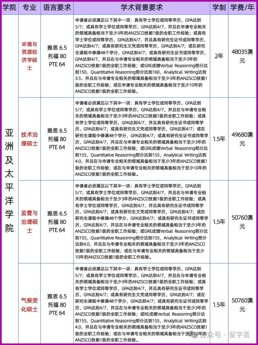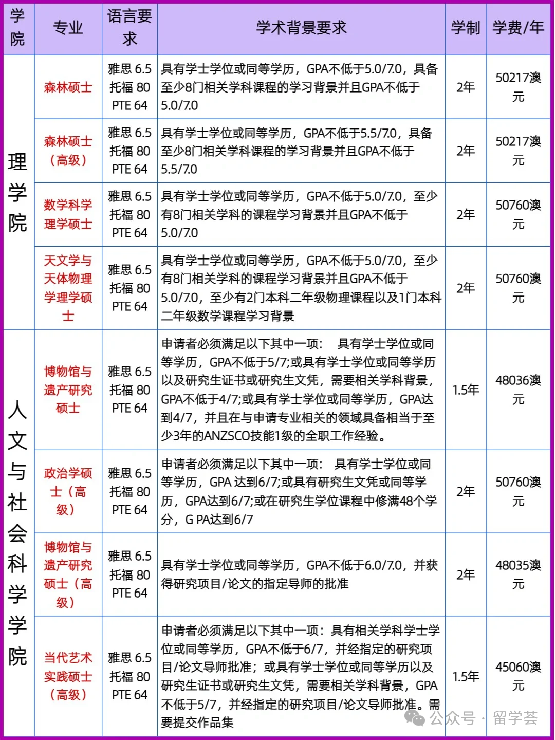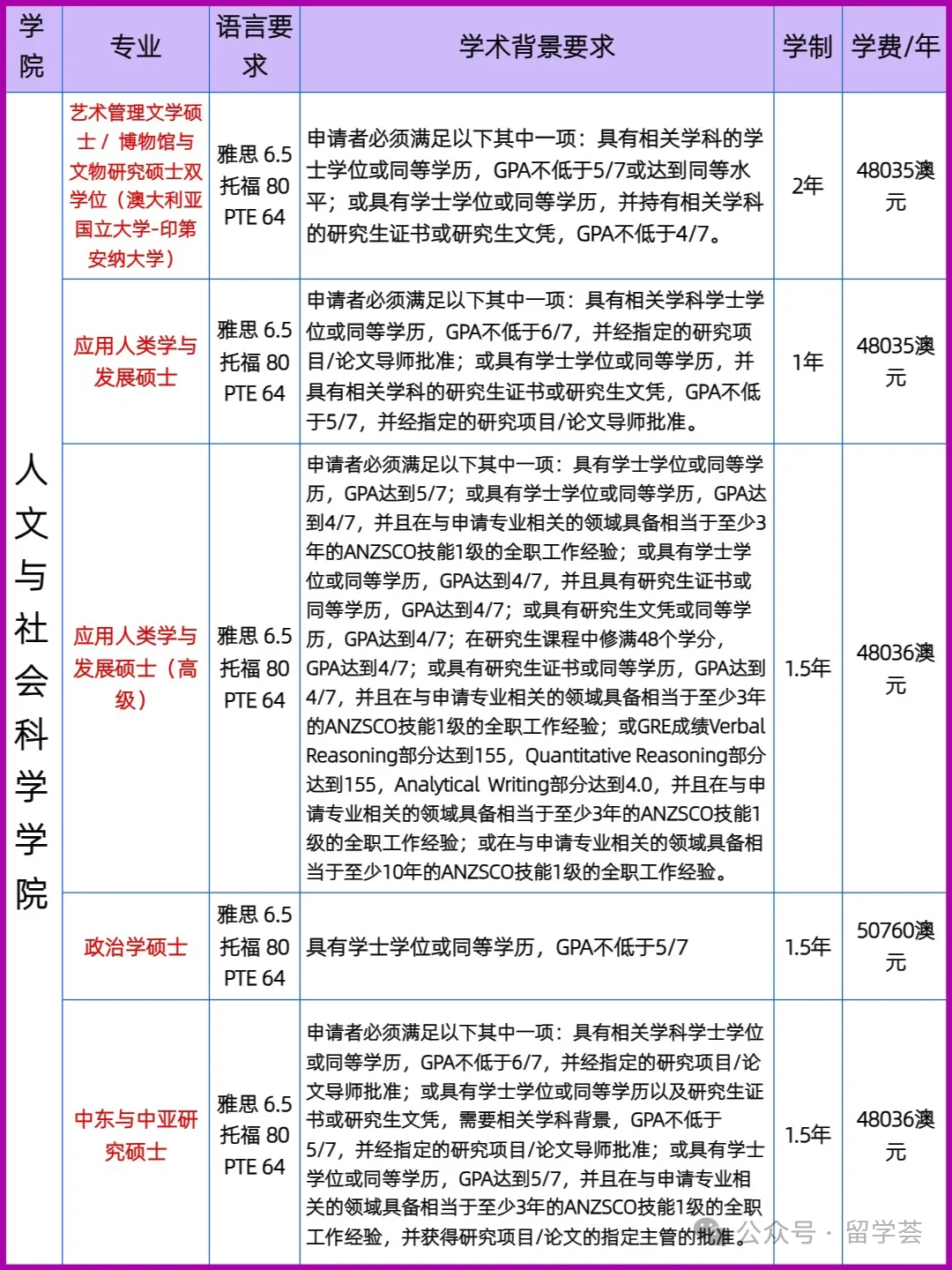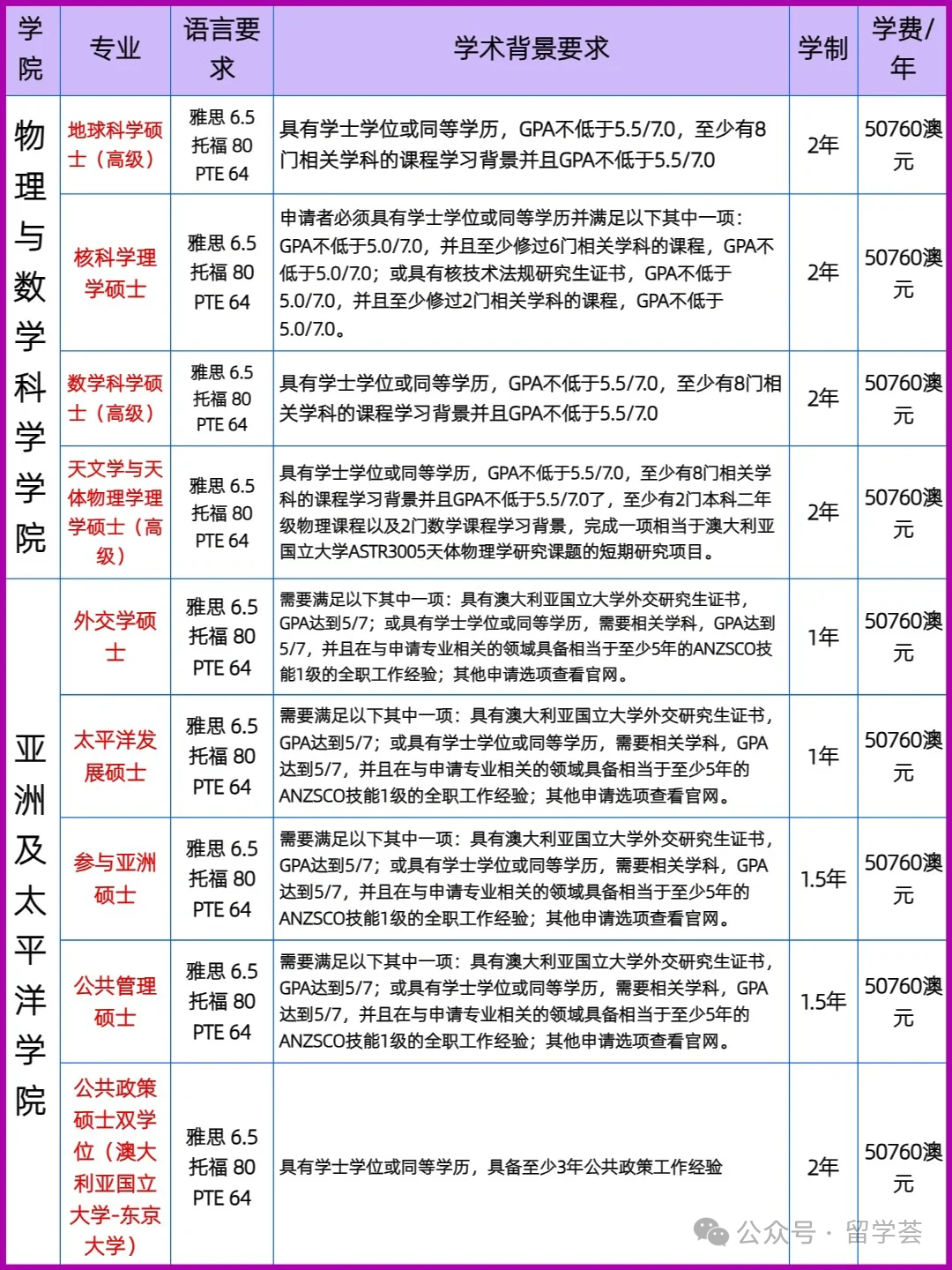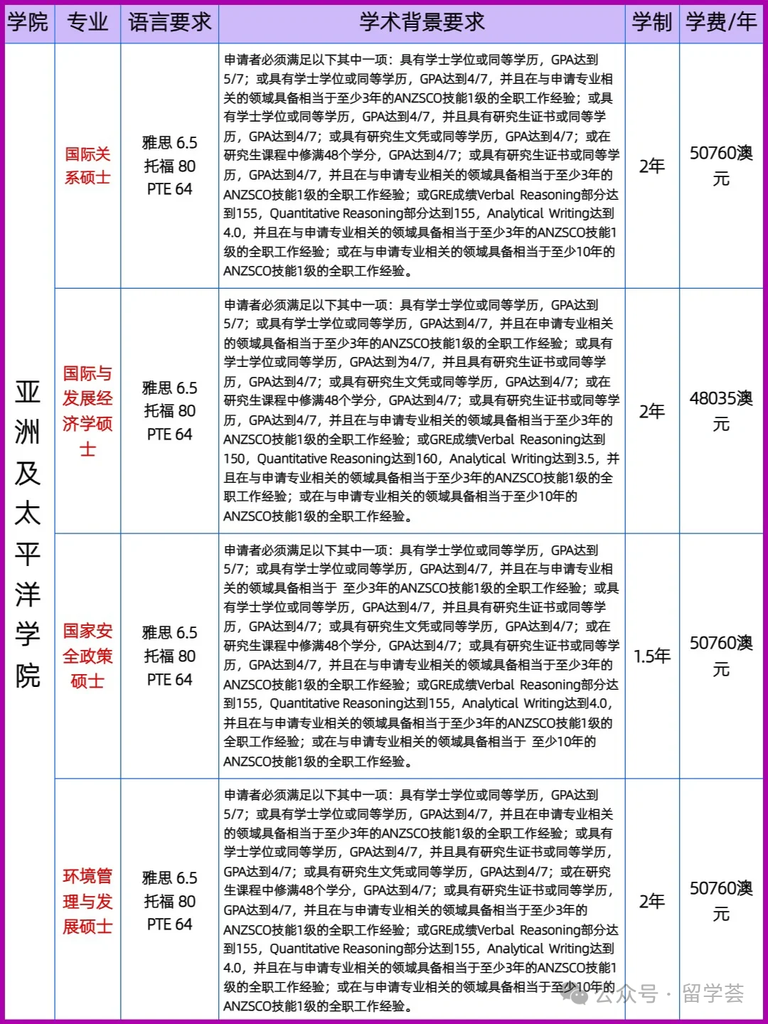 澳大利亚国立大学硕士申请条件及专业汇总![]() 澳大利亚国立大学简介 澳大利亚国立大学(Australian National University),简称ANU,是一所世界著名的公立综合性研究型大学。始建于1946年,是在二战后澳大利亚政府为了提升国家的科研和教育水平而创立。1960年,澳大利亚国立大学与堪培拉大学学院合并,开始招收本科生,学校规模进一步扩大。后续不断发展,1989年建立澳大利亚国立大学研究生院,1992年与堪培拉音乐学院和堪培拉艺术学院合并等。 主校区位于澳大利亚首都堪培拉的阿克顿(Acton)社区,校园总面积约150公顷,邻近堪培拉市中心,校园内设施齐全,有银行、邮局、书店、餐厅、旅行社等,还拥有南半球规模最大的图书馆。 ![]() 此外,还有赛丁泉天文台(位于瓦伦本哥国家公园内)、斯壮罗山天文台、科龙海岸校区(位于新南威尔士州南海岸)、北澳研究单位(位于北领地达尔文市)、偏远临床医学院(位于新南威尔士州东南方)、临床医学院(与澳大利亚首都特区的两大医院合作设立)等分支校区。 在国际上享有很高的声誉,是环太平洋大学联盟、国际研究型大学联盟、澳大利亚八校联盟、英联邦大学协会成员。在2025QS世界大学排名中位居世界第30位。 截至2021年,该校有在职教职工3056人,其中九成的教职员拥有博士学位,全澳三分之一的院士在此执教或从事科研工作。学生群体以研究生为主,本科生相对较少,学术氛围浓厚。 ![]() 澳大利亚国立大学优势学科 学校设有七个学院,包括人文与社会科学学院、亚太学院、商业与经济学院、工程与计算机学院、法学院、医学、生物及环境学院和物理及数学科学学院。学院下设多个研究中心,专业涵盖了人文、社科、理工、医学、商科等多个领域。 科研水平卓越,澳大利亚四大国家科学院均坐落于此。学校在诸多领域的研究成果显著,如医学、天文学、物理学等。诞生了世界第一支临床医用青霉素、光子瞬间转移技术等重要科研成果。 澳大利亚国立大学有很多优势专业,以下是一些较为突出的: 1. 艺术与人文领域: - 考古学:世界排名第7,澳洲第1。该专业为学生提供了丰富的考古学知识和实践机会,让学生能够深入研究古代文明、文化遗产等,对于对历史和文化感兴趣的学生来说是一个很好的选择。 - 历史学:世界排名第12,澳洲第1。澳国立的历史学专业拥有优秀的师资队伍和丰富的学术资源,学生可以深入学习不同时期、不同地区的历史,培养批判性思维和历史研究能力。 - 现代语言学:在该领域也有很强的实力,学校提供多种语言的学习和研究,帮助学生掌握语言技能和语言背后的文化内涵。 - 哲学:澳国立的哲学专业注重培养学生的逻辑思维、批判性思考和分析问题的能力,为学生提供深入探讨哲学理论和问题的平台。 2. 精算学:是唯一被澳洲精算师协会认定有资格授予精算学学士和精算学硕士学位的大学。课程设置完整且系统,涵盖了精算学的各个方面,包括风险评估、保险精算、金融数学等。该专业世界排名36位,澳洲排名第二,毕业生就业前景良好,在保险、金融等领域备受青睐。 3. 翻译专业:旨在为学生提供翻译实践,提升学生的分析和英语沟通技巧。不仅能够培养学生的翻译能力,还为学生提供了该领域翻译的历史和赏析关键问题。并且该专业有世界知名的语言专家任教,为学生提供高质量的教学和指导。 4. 法学:是澳大利亚最好的法学专业之一,全球排名靠前。专业提供了广泛的法律培训,包括澳大利亚法律、国际法、商业法、环境法等。毕业生成功就业率极高,学生在学习过程中能够接触到丰富的法律案例和实践机会,培养扎实的法律知识和实践能力。 5. 会计与金融:世界排名第23,澳洲排名第4。该专业旨在培养学生掌握会计技巧,能够独立进行会计相关的研究和评估,学生毕业后可以在政府机构、教育机构、各大企业从事会计、财务等工作,为学生提供了广阔的就业前景。 6. 计算机科学:该专业为学生提供了计算机领域的尖端课程,学院内设有世界顶级的研究中心和实验室,如 National Computational Infrastructure (NCI),为学生提供了优越的研究、学习和就业机会。专业旨在让学生掌握和计算机领域相关的知识,并提供了丰富的实践机会,还是移民专业,对有移民打算的学生比较有利。 7. 经济学:全球排名第15 位(根据 QS 排名或其他权威排名机构)。该专业以微观经济学领域的研究而著称,学生可以学到现代经济学和宏观经济学的基础,并通过实践和实际案例来增强技能和知识。 8. 地球科学:在地球科学领域名列前茅,包括地质、地理、大气科学、海洋学等多个子学科。学校拥有先进的实验设备和研究资源,学生可以参与到各种实地考察和科研项目中,为未来从事相关领域的工作或研究打下坚实的基础。 9. 国际关系:结合了政治学与社会学,是澳国立的强势专业。该专业培养学生对国际政治、外交关系、全球治理等方面的理解和分析能力,为学生在国际组织、政府部门、跨国企业等领域的职业发展提供了良好的基础。 10. 公共政策:提供高质量的公共政策教育和研究机会,培养学生对公共政策的制定、分析和评估能力,毕业生可以在政府、非营利组织、咨询公司等机构从事公共政策相关的工作。 ![]() 澳大利亚国立大学硕士申请指南 澳大利亚国立大学(ANU)的硕士申请是一个综合性的过程,以下是关键的申请细节和要