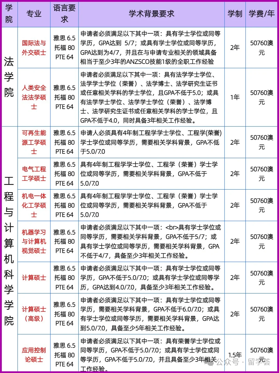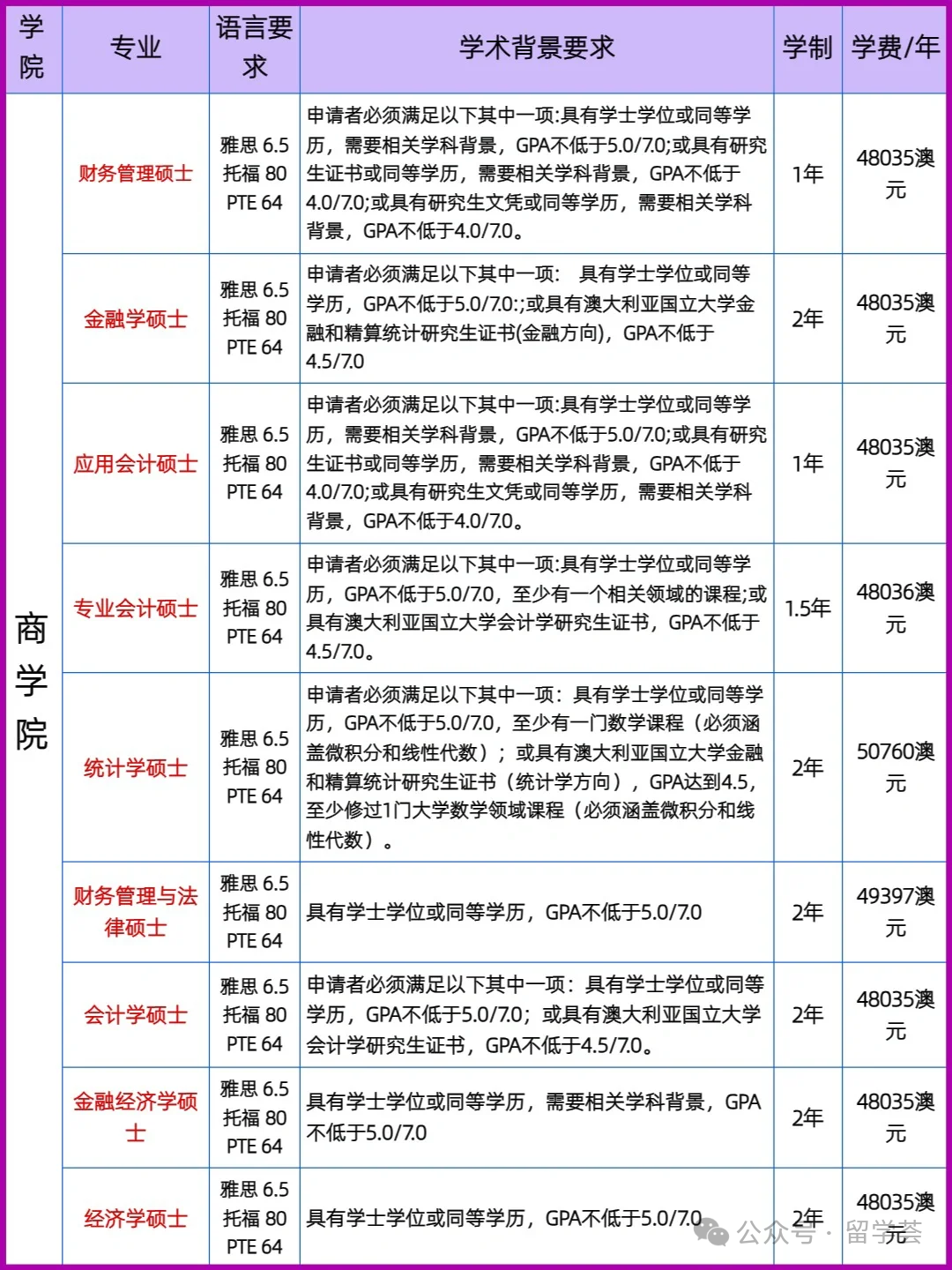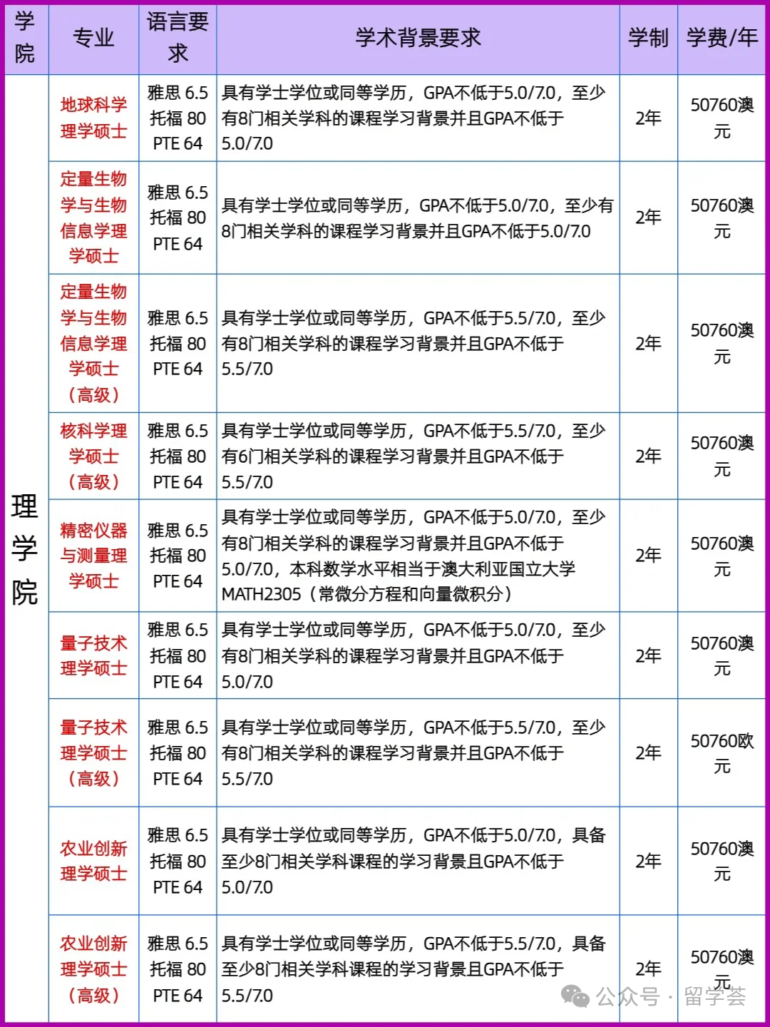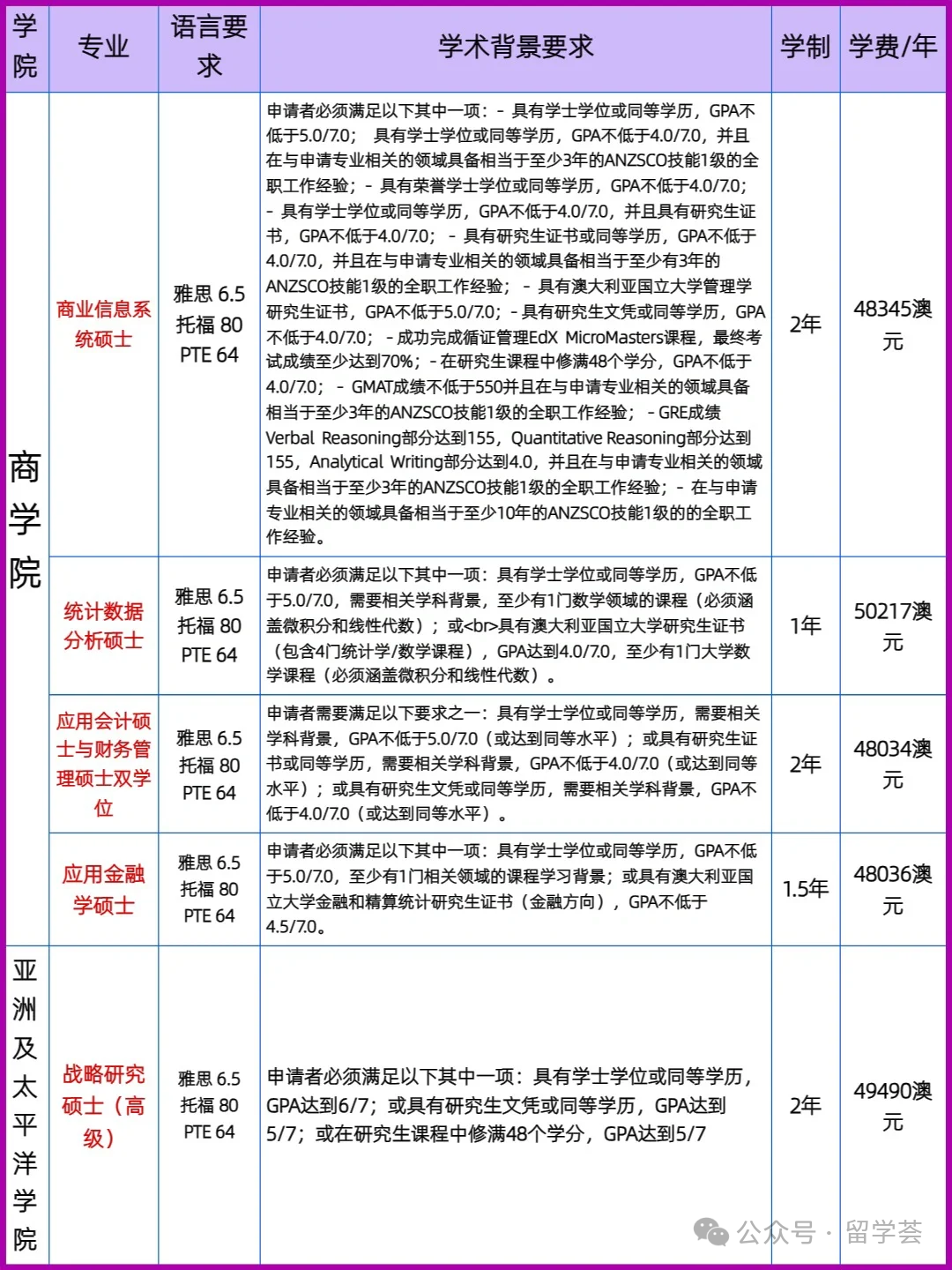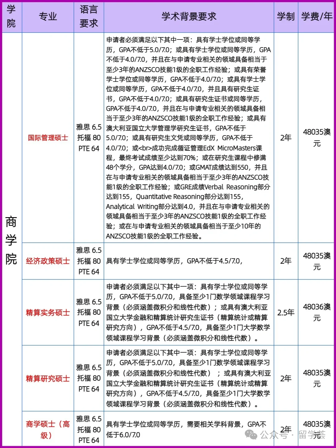 澳大利亚国立大学硕士申请条件及专业汇总![]() 澳大利亚国立大学简介 澳大利亚国立大学(Australian National University),简称ANU,是一所世界著名的公立综合性研究型大学。始建于1946年,是在二战后澳大利亚政府为了提升国家的科研和教育水平而创立。1960年,澳大利亚国立大学与堪培拉大学学院合并,开始招收本科生,学校规模进一步扩大。后续不断发展,1989年建立澳大利亚国立大学研究生院,1992年与堪培拉音乐学院和堪培拉艺术学院合并等。 主校区位于澳大利亚首都堪培拉的阿克顿(Acton)社区,校园总面积约150公顷,邻近堪培拉市中心,校园内设施齐全,有银行、邮局、书店、餐厅、旅行社等,还拥有南半球规模最大的图书馆。 ![]() 此外,还有赛丁泉天文台(位于瓦伦本哥国家公园内)、斯壮罗山天文台、科龙海岸校区(位于新南威尔士州南海岸)、北澳研究单位(位于北领地达尔文市)、偏远临床医学院(位于新南威尔士州东南方)、临床医学院(与澳大利亚首都特区的两大医院合作设立)等分支校区。 在国际上享有很高的声誉,是环太平洋大学联盟、国际研究型大学联盟、澳大利亚八校联盟、英联邦大学协会成员。在2025QS世界大学排名中位居世界第30位。 截至2021年,该校有在职教职工3056人,其中九成的教职员拥有博士学位,全澳三分之一的院士在此执教或从事科研工作。学生群体以研究生为主,本科生相对较少,学术氛围浓厚。 ![]() 澳大利亚国立大学优势学科 学校设有七个学院,包括人文与社会科学学院、亚太学院、商业与经济学院、工程与计算机学院、法学院、医学、生物及环境学院和物理及数学科学学院。学院下设多个研究中心,专业涵盖了人文、社科、理工、医学、商科等多个领域。 科研水平卓越,澳大利亚四大国家科学院均坐落于此。学校在诸多领域的研究成果显著,如医学、天文学、物理学等。诞生了世界第一支临床医用青霉素、光子瞬间转移技术等重要科研成果。 澳大利亚国立大学有很多优势专业,以下是一些较为突出的: 1. 艺术与人文领域: - 考古学:世界排名第7,澳洲第1。该专业为学生提供了丰富的考古学知识和实践机会,让学生能够深入研究古代文明、文化遗产等,对于对历史和文化感兴趣的学生来说是一个很好的选择。 - 历史学:世界排名第12,澳洲第1。澳国立的历史学专业拥有优秀的师资队伍和丰富的学术资源,学生可以深入学习不同时期、不同地区的历史,培养批判性思维和历史研究能力。 - 现代语言学:在该领域也有很强的实力,学校提供多种语言的学习和研究,帮助学生掌握语言技能和语言背后的文化内涵。 - 哲学:澳国立的哲学专业注重培养学生的逻辑思维、批判性思考和分析问题的能力,为学生提供深入探讨哲学理论和问题的平台。 2. 精算学:是唯一被澳洲精算师协会认定有资格授予精算学学士和精算学硕士学位的大学。课程设置完整且系统,涵盖了精算学的各个方面,包括风险评估、保险精算、金融数学等。该专业世界排名36位,澳洲排名第二,毕业生就业前景良好,在保险、金融等领域备受青睐。 3. 翻译专业:旨在为学生提供翻译实践,提升学生的分析和英语沟通技巧。不仅能够培养学生的翻译能力,还为学生提供了该领域翻译的历史和赏析关键问题。并且该专业有世界知名的语言专家任教,为学生提供高质量的教学和指导。 4. 法学:是澳大利亚最好的法学专业之一,全球排名靠前。专业提供了广泛的法律培训,包括澳大利亚法律、国际法、商业法、环境法等。毕业生成功就业率极高,学生在学习过程中能够接触到丰富的法律案例和实践机会,培养扎实的法律知识和实践能力。 5. 会计与金融:世界排名第23,澳洲排名第4。该专业旨在培养学生掌握会计技巧,能够独立进行会计相关的研究和评估,学生毕业后可以在政府机构、教育机构、各大企业从事会计、财务等工作,为学生提供了广阔的就业前景。 6. 计算机科学:该专业为学生提供了计算机领域的尖端课程,学院内设有世界顶级的研究中心和实验室,如 National Computational Infrastructure (NCI),为学生提供了优越的研究、学习和就业机会。专业旨在让学生掌握和计算机领域相关的知识,并提供了丰富的实践机会,还是移民专业,对有移民打算的学生比较有利。 7. 经济学:全球排名第15 位(根据 QS 排名或其他权威排名机构)。该专业以微观经济学领域的研究而著称,学生可以学到现代经济学和宏观经济学的基础,并通过实践和实际案例来增强技能和知识。 8. 地球科学:在地球科学领域名列前茅,包括地质、地理、大气科学、海洋学等多个子学科。学校拥有先进的实验设备和研究资源,学生可以参与到各种实地考察和科研项目中,为未来从事相关领域的工作或研究打下坚实的基础。 9. 国际关系:结合了政治学与社会学,是澳国立的强势专业。该专业培养学生对国际政治、外交关系、全球治理等方面的理解和分析能力,为学生在国际组织、政府部门、跨国企业等领域的职业发展提供了良好的基础。 10. 公共政策:提供高质量的公共政策教育和研究机会,培养学生对公共政策的制定、分析和评估能力,毕业生可以在政府、非营利组织、咨询公司等机构从事公共政策相关的工作。 ![]() 澳大利亚国立大学硕士申请指南 澳大利亚国立大学(ANU)的硕士申请是一个综合性的过程,以下是关键的申请细节和要