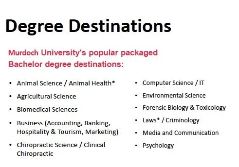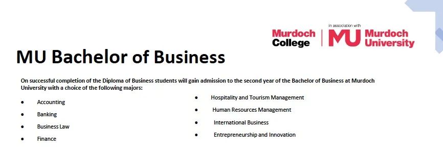 ![]() 想要申请Murdoch大学但苦于成绩或语言不达标?Kaplan为你提供多种课程选择,无论你是高中毕业生还是计划深造的本科毕业生,这里都有适合你的桥梁课程,让你的留学梦更近一步!今天就来详细解读Kaplan的明星课程吧! 1. Murdoch University Preparation Course 为高中毕业生量身定制的大学预备课程 Accelerated Entry Program - 针对Year 12毕业生- 开学时间:每年2月和10月- 课程时长:15周- 雅思要求:5.5(单项不低于5.0)- 适合人群:国内完成12年级的高中生。- 课程优势:该课程时间短,在国内结束12年级学习的学生可以快速衔接10月份入学的课程,能够更快地进入Murdoch本科课程。Foundation Program - 针对Year 11毕业生1. Two Trimesters 课程 - 开学时间:6月和10月 - 课程时长:30周(15周/Trimester) - 雅思要求:5.5(单项不低于5.0)2. Three Trimesters 课程 - 开学时间:2月 - 课程时长:45周(15周/Trimester) - 雅思要求:6.0(单项不低于5.5) - 适合人群:需要更长学习时间的学生,每学期课程安排更少,以便取得更高的成绩。 特别福利:目前 Foundation 课程享受20%学费减免,原价AUD 25,560,现在仅为AUD 20,448! 课程特色:完成课程后可直升以下Murdoch大学的本科课程,包括法律(Laws)和犯罪学(Criminology),这是其他大学的基础课程无法直接衔接的优势哦! ![]() 2. Diploma of Business- 开学时间:每年2月、6月和10月 - 课程时长:Two Trimesters或Three Trimesters(15周/Trimester)- 雅思要求:5.5(单项不低于5.0)- 入学条件:平均成绩60%以上(含职业学校) - 学费减免:20%,由AUD 26,000减免至AUD 20,800- 课程亮点:完成后可直接升入Murdoch的Bachelor of Business第二年,专业选择如下: ![]() 3. Diploma of Information Technology- 开学时间:每年2月、6月和10月 - 课程时长:Two Trimesters或Three Trimesters(15周/Trimester)- 雅思要求:6.0(单项不低于5.5)- 入学条件:平均成绩60%以上(含职业学校) - 学费减免:20%,由AUD 26,000减免至AUD 20,800- 课程亮点:完成后可直接升入Murdoch的Bachelor of Information Technology第二年 4. Postgraduate Qualifying Program (PQP) - 开学时间:每年1月、4月和9月 - 课程时长:One Trimesters(14周)- 雅思要求:6.0(单项不低于6.0)- 入学条件:持有中国认可的大专学历(或以上) - 学费减免:20%,由AUD 13,300减免至AUD 10,640- 课程亮点:完成后可直接就读Murdoch大学的硕士课程 ![]() 课程衔接优势:直通Murdoch UniversityKaplan的所有桥梁课程均可无缝衔接Murdoch University的本科或硕士学位,涵盖从商科到IT,从法律到科学的广泛课程选择。特别是Murdoch的法律和犯罪学课程,在Foundation阶段便可开始衔接,这是其他学校无法比拟的优势。 作为Kaplan的长期合作伙伴,Visa Path非常荣幸受邀参加Kaplan的年度活动,并在活动中荣获了官方颁发的奖项。这是对我们团队专业能力和服务质量的认可,也激励着我们继续为每一位学生提供最优质的留学服务。 ![]() ![]() 如果对Kaplan的课程有兴趣或需要进一步了解相关信息,欢迎随时联系我们哦~ 广告时间 ![]() 【9.13 EOI官报】西澳第二轮邀请发布,优先职业获邀分数有所回落! 【9.5 EOI官报】本财年第一轮189发放7973个!最低65分! 重磅消息!澳大利亚482雇主担保签证要求再放宽! AFP-澳洲无犯罪证明保姆级教程 2024 MIA西澳移民大会重要信息汇总来啦! 留学生未来将面临新挑战?澳洲政府的政策变化解读 【8.16 EOI官报】本财年第一轮发放600个邀请,优先行业领跑 新移民指南:父母移民福利全解析! 新财年西澳PR配额飙涨到1万个,到底要不要冲WA190? 案例分享:大龄!白本!境外!专升硕3天批签! 紧急提醒:485签证申请倒计时,澳洲移民局官网出现技术故障! 珀斯生活类干货讲座来袭|一站式搞定父母移民政策、保险、贷款和房产! 重磅!澳洲新财年预算案及移民配额:独立技术移民“腰斩”,州担保小幅上涨 |