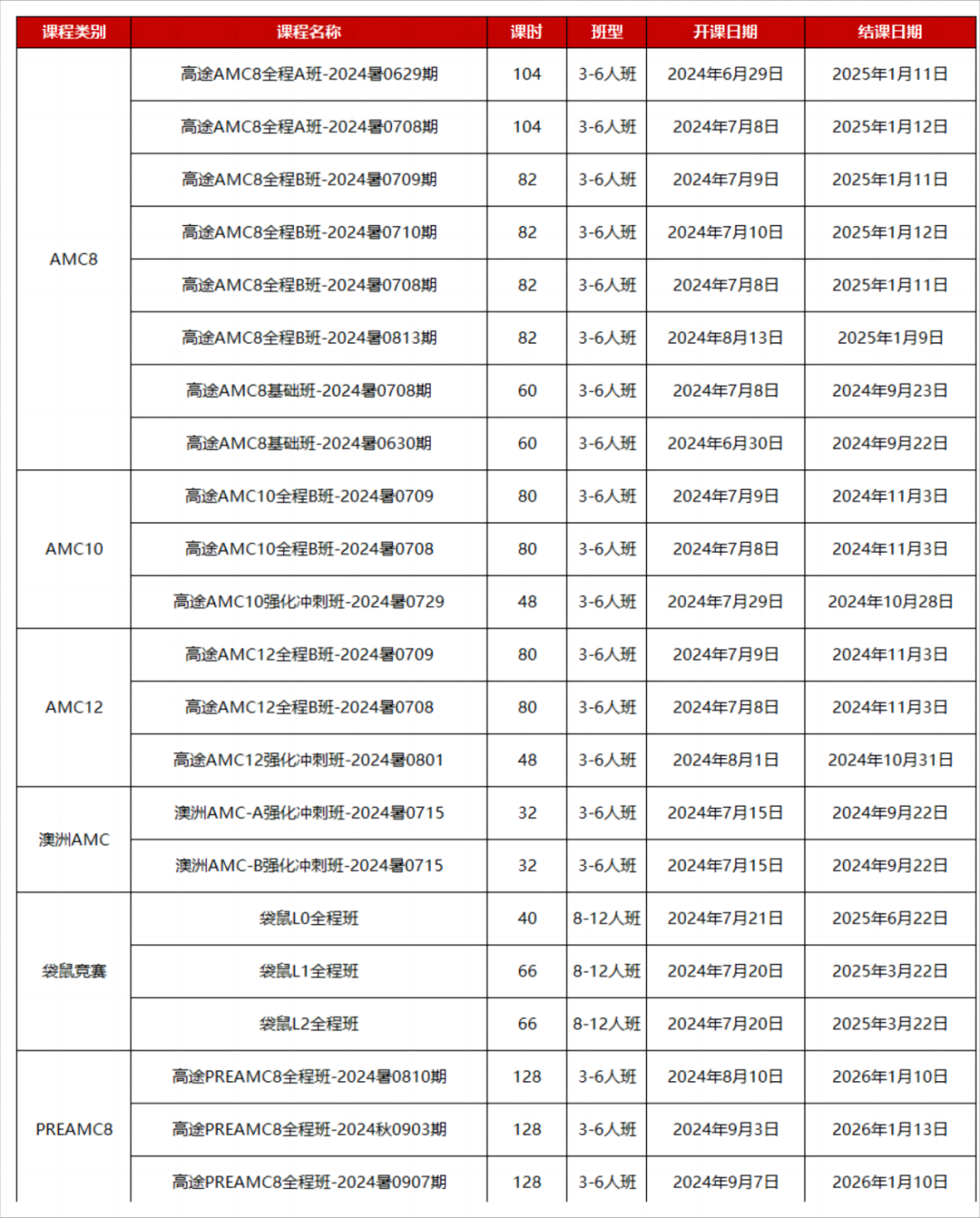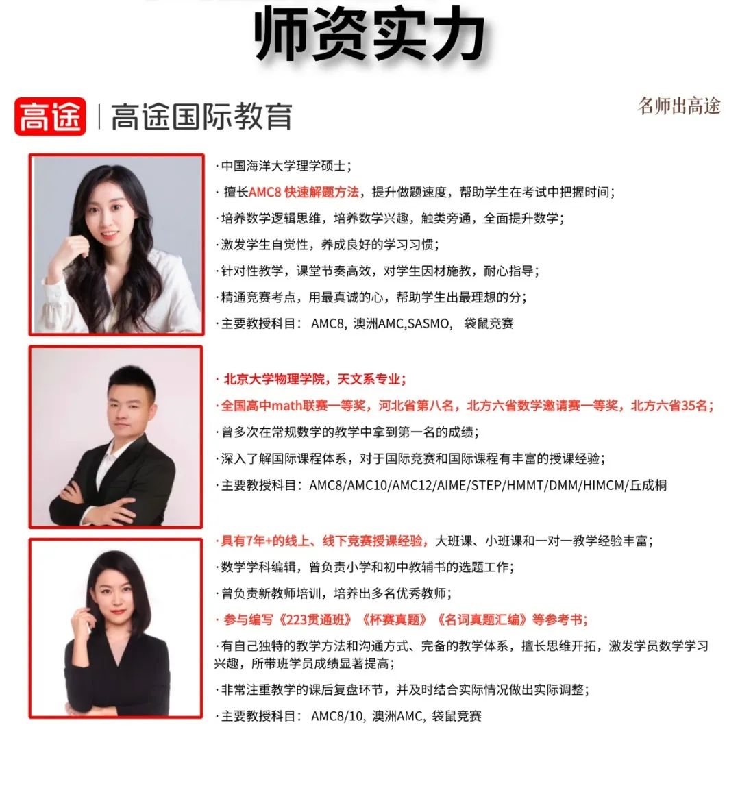 关注我们|获取更多国际教育信息 Perseverance Prevails 文中将会介绍: 澳洲AMC考试时间与报名时间 澳洲AMC报名方式 澳洲AMC历年真题 澳洲AMC报名机构 ![]() 澳洲AMC考试时间与报名时间 ![]() 1.报名时间:根据最新信息,2024年澳洲AMC数学竞赛的报名截止时间为2024年9月18日。 2.考试时间:2024年9月28日(周六)。具体考试时间段为: 3.A、B级别(小学三至六年级):上午10:00-11:00(60分钟) 4.C、D、E级别(初一至高三年级):下午14:00-15:15(75分钟) ![]() 澳洲AMC报名方式 ![]() 1.合作学校报名(线下): 如果学生所在的国际学校是竞赛方或承办方的合作学校,可以找学校老师统一报名。 2.小程序报名(线上): 若学生所在学校是合作学校,可以在【阿思丹国际理科测评】小程序进行报名。需要注意的是,这种情况下可能不支持个人直接报名,需先确定学校是否为合作学校。 ![]() 3.机构代报名: 如果学生所在学校不是合作学校,可以选择找专业的教育机构或辅导机构进行代报名。机构通常会有专门的报名通道和流程,能够帮助学生顺利完成报名手续。 需要注意的是,选择代报名机构时要确保其正规性和专业性,避免遇到虚假机构或被骗取费用。 4.考试地点: 全国各教学合作学校校内(学校申请可提供在线测评服务)。 5.代报名服务: 如果您有代报名需求,高途会为我们的在读生提供代免费的代报名服务,您可以长摁二维码添加微信了解。 高途教育作为美股上市公司,有着正规专业的服务流程和丰富的师资资源,良好的口碑和服务质量更值得信任。 长摁二维码添加鹏鹏老师微信 咨询代报名服务 ![]() 手机(微信):15611438259 ![]() 澳洲AMC历年真题 ![]() ![]() ![]() ![]() 澳洲AMC课程安排 ![]() 3-6人小班课时间安排 ![]() 一对一课程时间安排 ![]() ![]() 高途 机构介绍 ![]() ![]() ![]() 长摁二维码添加微信 获取澳洲AMC历年真题 ![]() 手机(微信):15611438259 |