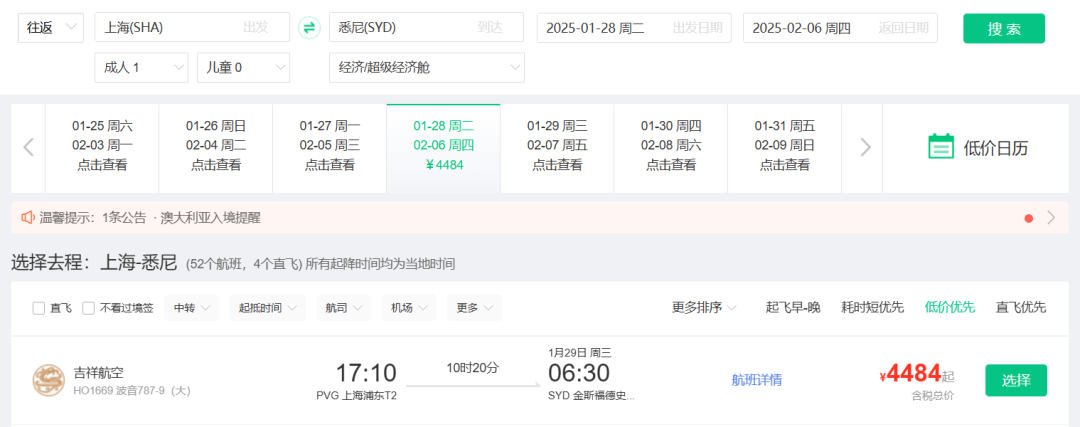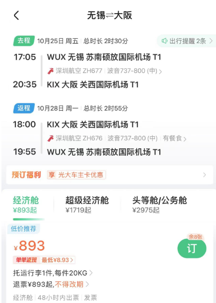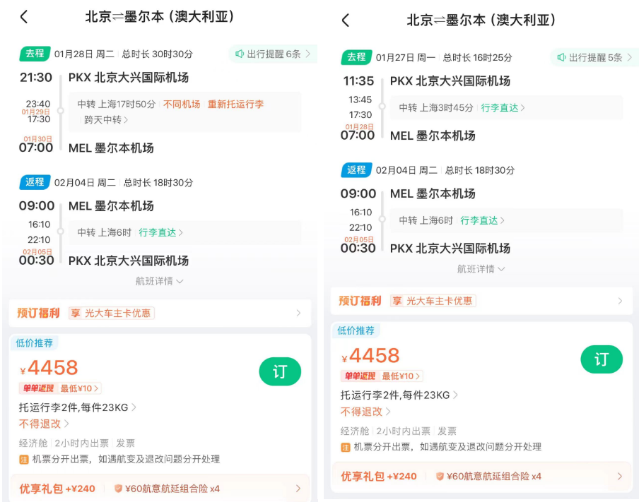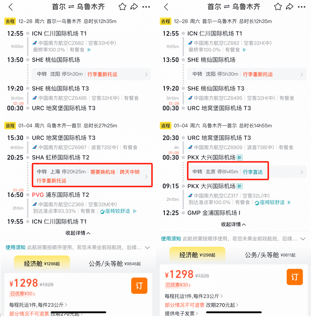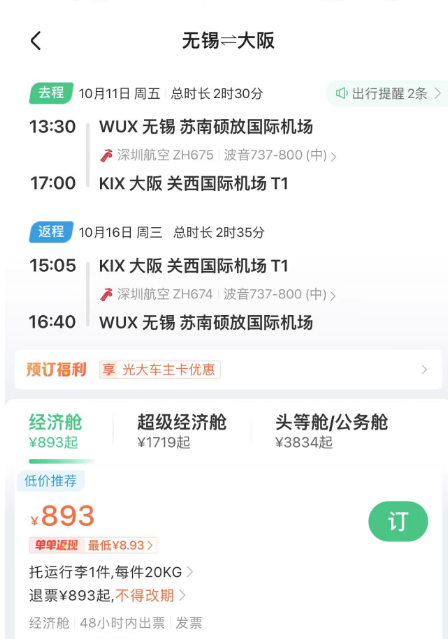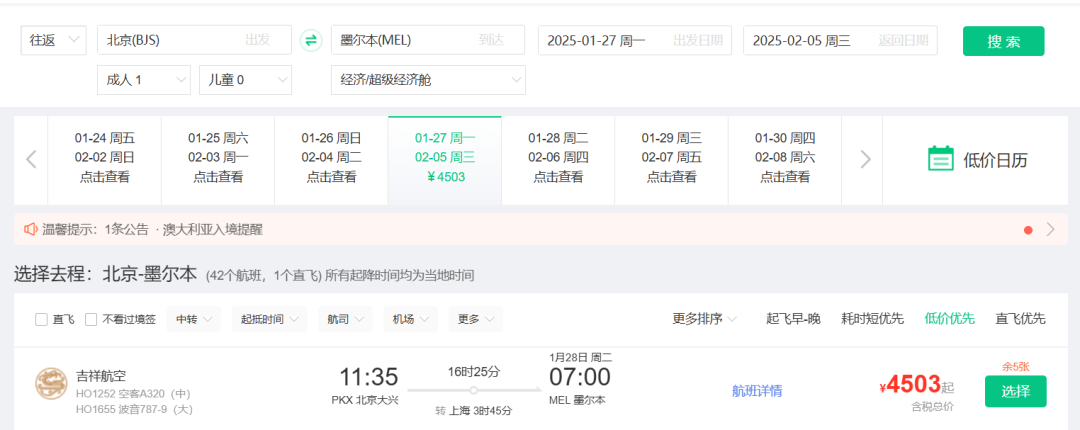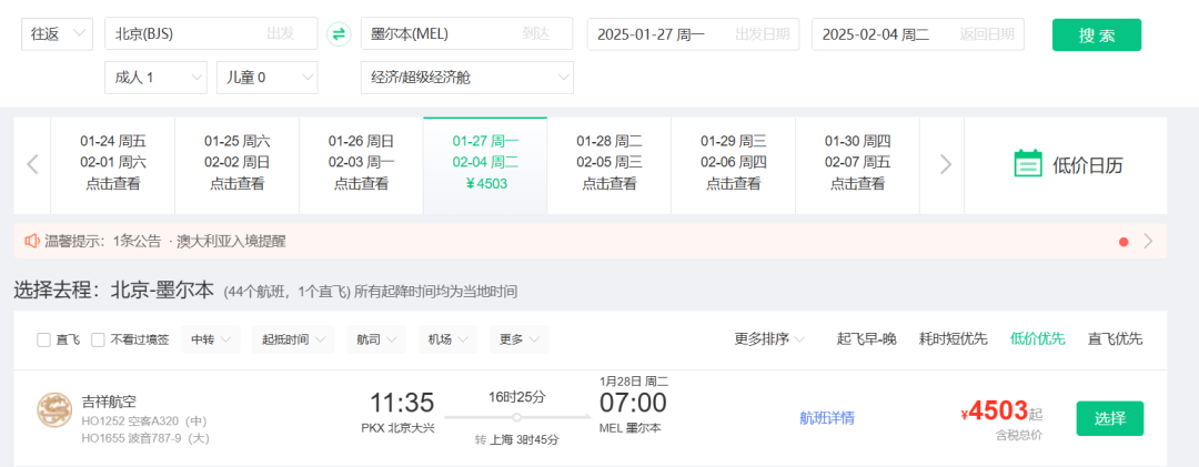 春节澳洲好价 吉祥航空上海飞墨尔本/悉尼 新航线,我们8月份重点说过,还推过一波春节票。 ![]() ![]() ![]() 如今最旺季春节票又来了,不过上海直飞贵,北京出发转机还不错(和平时2K+往返不好比): 春节,北京经上海,含税4K4往返墨尔本,作为全年最贵的往返几天,价格可以接受,吉祥的波音787大飞机体验不错。 ![]() ![]() 以上截图来自同程网页版,App上选择更多 1月27,28日出发皆可,2月4日,5日返回 ![]() ![]() 预定时,尽量避免转机隔夜航班,能正常转走的最好。不过如果转机在上海隔夜,吉祥航空提供住宿。 ![]() ![]() 这条线再创新低 国庆前,我们推过深圳航空无锡大阪的特价,传统航空含行李,不到1K。这几天价格再降,甚至不到900元。 无锡含税最低893往返大阪 ![]() ![]() 从今天到11月多日期组合有此价 ![]() 像之前的玩法一样,这条线也支持全国联运。南方,西部多地经无锡(也可以南京)往返大阪,在1K出头,包括红叶季跨周末都有票。 ![]() ![]() ![]() ![]() 这样大阪村村通,转机的便宜票除了山航,东航外,又多了吉祥。 南航 上周,我们分享了东航含税800首尔往返新疆、西藏的好价,缺点是这个票只有10月和11月的,后续呢? ![]() ![]() 东航暂时未放出后面的低价促销,但南航参战了,元旦、寒假多日期含税1K3往返新疆! 比如1.18-1.26寒假,首尔含税1K3往返乌鲁木齐 ![]() 12.28-1.4,南航首尔含税1K3往返乌鲁木齐 ![]() 南航这个票可选的出行时间很多,从11月到1月寒假都有往返含税1K3的价格,大家可以任意组合: ![]() 南航可以选的中转城市比东航多,回程可以选择在北京、上海、沈阳、大连等城市下飞机,覆盖面更广! ![]() 不过大家买票的时候务必注意下行李要求,部分航班是行李直达的,大家如果要在回程下飞机,要么不托运要么别选行李直达的! ![]() 不过相比东航的价格,南航价格高一些,毕竟淡季新疆直飞也不贵。南航的优势在伊斯坦布尔线,比如大湾区,如果能解决港澳签注问题的话,四季度多日期: 澳门含税2K6往返伊斯坦布尔 ![]() ![]() ![]() ![]() ![]() Travel Radar 最及时的实用旅行资讯 欢迎关注我们小号:旅行雷达助手 突发特价,新鲜特惠,BUG发布 喜欢,就点个「在看」吧~~ |