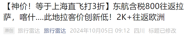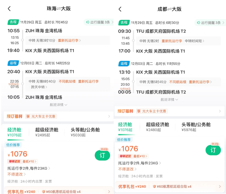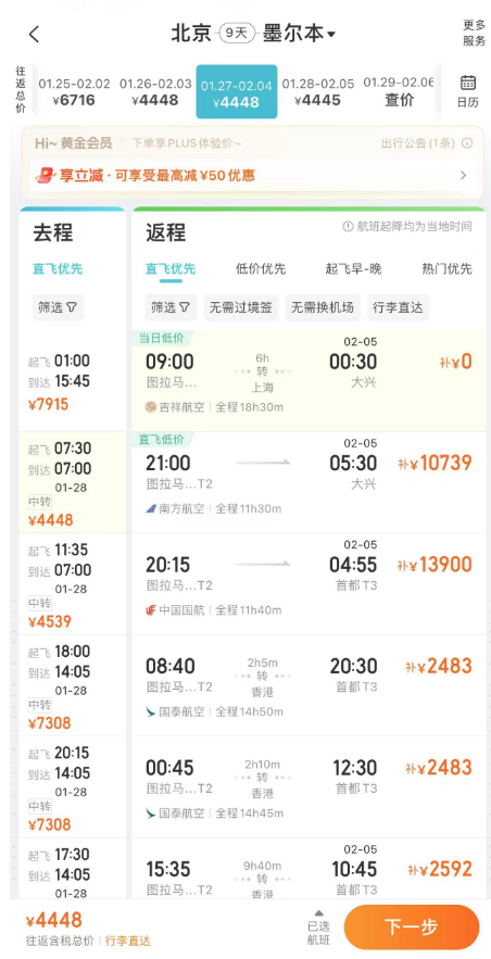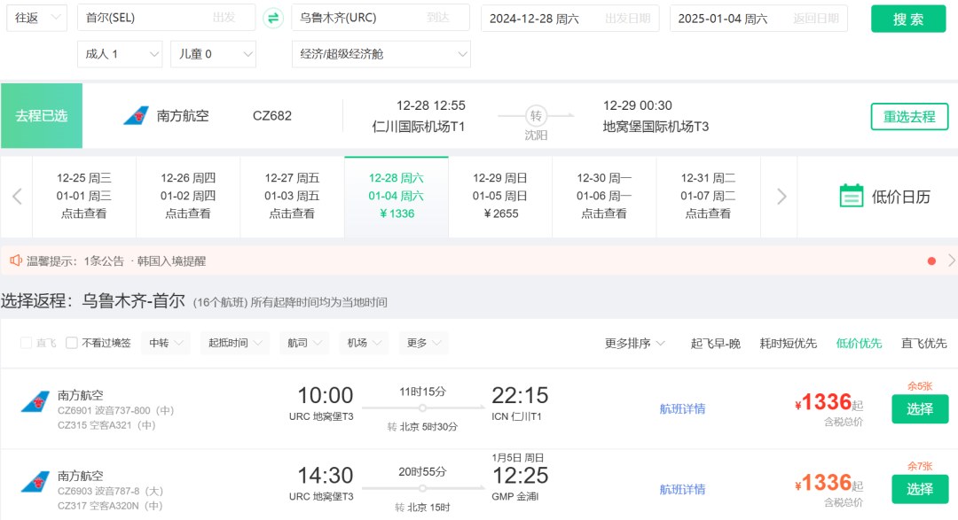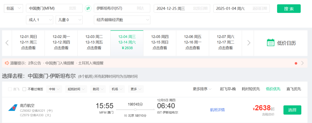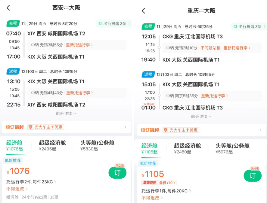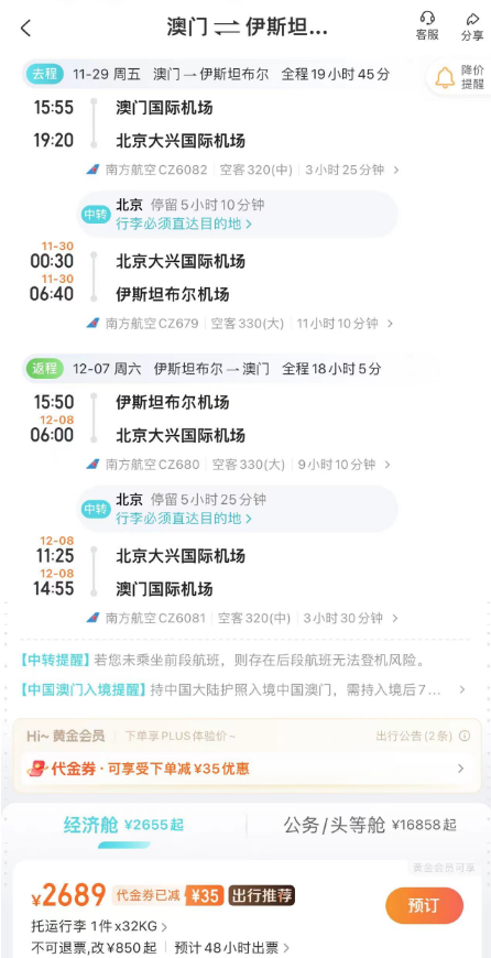 春节澳洲好价 吉祥航空上海飞墨尔本/悉尼 新航线,我们8月份重点说过,还推过一波春节票。 ![]() ![]() ![]() 如今最旺季春节票又来了,不过上海直飞贵,北京出发转机还不错(和平时2K+往返不好比): 春节,北京经上海,含税4K4往返墨尔本,作为全年最贵的往返几天,价格可以接受,吉祥的波音787大飞机体验不错。 ![]() ![]() 以上截图来自同程网页版,App上选择更多 1月27,28日出发皆可,2月4日,5日返回 ![]() ![]() 预定时,尽量避免转机隔夜航班,能正常转走的最好。不过如果转机在上海隔夜,吉祥航空提供住宿。 ![]() ![]() 这条线再创新低 国庆前,我们推过深圳航空无锡大阪的特价,传统航空含行李,不到1K。这几天价格再降,甚至不到900元。 无锡含税最低893往返大阪 ![]() ![]() 从今天到11月多日期组合有此价 ![]() 像之前的玩法一样,这条线也支持全国联运。南方,西部多地经无锡(也可以南京)往返大阪,在1K出头,包括红叶季跨周末都有票。 ![]() ![]() ![]() ![]() 这样大阪村村通,转机的便宜票除了山航,东航外,又多了吉祥。 南航 上周,我们分享了东航含税800首尔往返新疆、西藏的好价,缺点是这个票只有10月和11月的,后续呢? ![]() ![]() 东航暂时未放出后面的低价促销,但南航参战了,元旦、寒假多日期含税1K3往返新疆! 比如1.18-1.26寒假,首尔含税1K3往返乌鲁木齐 ![]() 12.28-1.4,南航首尔含税1K3往返乌鲁木齐 ![]() 南航这个票可选的出行时间很多,从11月到1月寒假都有往返含税1K3的价格,大家可以任意组合: ![]() 南航可以选的中转城市比东航多,回程可以选择在北京、上海、沈阳、大连等城市下飞机,覆盖面更广! ![]() 不过大家买票的时候务必注意下行李要求,部分航班是行李直达的,大家如果要在回程下飞机,要么不托运要么别选行李直达的! ![]() 不过相比东航的价格,南航价格高一些,毕竟淡季新疆直飞也不贵。南航的优势在伊斯坦布尔线,比如大湾区,如果能解决港澳签注问题的话,四季度多日期: 澳门含税2K6往返伊斯坦布尔 ![]() ![]() ![]() ![]() ![]() Travel Radar 最及时的实用旅行资讯 欢迎关注我们小号:旅行雷达助手 突发特价,新鲜特惠,BUG发布 喜欢,就点个「在看」吧~~ |