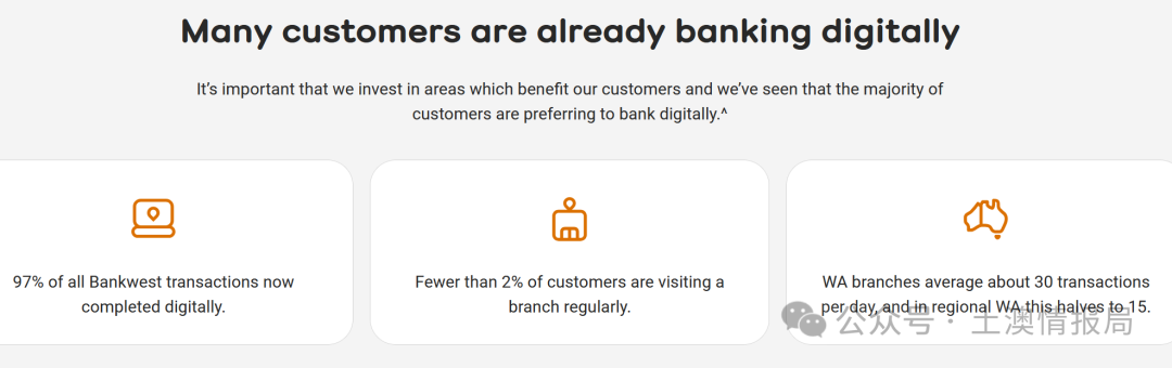 ![]() 情报局开讲: 1895年创立的Bankwest关闭了最后一家,位于西澳珀斯Mandurah Forum购物中心的分行,之后再无实体,将彻底转型为纯数字化银行。 Bankwest在西澳偏远地区剩余的15家分行将改造成母公司联邦银行的分行,这一过程将于12月中旬完成。 ![]() ![]() Bankwest2008年时被CBA收购。至2022年,他们关闭了所有在东海岸的分行。 ![]() 截至今年2月的一年,Mandurah分行的日均柜台交易量仅60多笔。 之前,他们其余的大都会分行每天平均仅处理30笔柜台交易,偏远地区的分行仅15笔。 同时,他们网上的交易每天可达60多万笔。 ![]() 如今大多数客户更倾向于使用数字服务而非实体银行。 社区里的老年人需要适应新的科技方式。这可能非常困难。 2017年至2023年间,澳洲共关闭了超过2100家银行分行。 不少偏远地区的人住在距离最近一家分行数百公里之外的地方。 因为一些民众的反对,有些银行现在出来表态,愿意先暂停关闭实体分行的步伐。 ................................................................................................................................. 【土澳情报局】 (公众号ID:AU_QBJ) ![]() 澳洲新闻纪检委 无情打脸各种不实消息 提供真正实锤资讯,独家盘点 ........................................................................ 投稿/转载/爆料/推广 联系微信号 shingotroy ![]() ........................................................................ ............................................................................................. 土澳情报局公众号发布的任何内容和商业信息,所有权归属原作者。土澳情报局公众号尽力确保发布信息的实效性和准确性,除土澳情报局人员展示的观点之外,其余文中体现的观点和内容为转述,并不代表土澳情报局赞同,同时也并非已证实这些转述内容的真实性。商家,撰稿人和其他合作方应对宣传内容的准确性,真实性,正当性,合法性负责,本公众号不承担其任何法律责任。部分资讯及图片来自网络,如有侵权烦请联系微信号:Shingotroy,感谢支持。