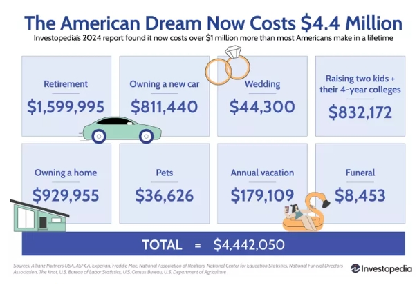 ![]() ▲扫码探索捷尼赛思GV 80 Coupe▲ ![]() ![]() 共1819字|预计阅读时长4分钟 威尔史密斯的成名作《当幸福来敲门》(The Pursuit of Hapiness)给许多人都留下了深刻的印象——一位收入拮据的医疗器材业务员,因为童年的不幸和事业的坎坷,最终遭到妻子抛弃,在流离失所后仍然坚强地带着儿子寻找幸福的励志故事。 ![]() 虽然影片的译名存在争议,但是主角不屈不挠地与逆境斗争,并努力追逐幸福的剧情,一直激励着成千上万的观众对“美国梦”的热爱与追求。 在现实生活中,这样的例子更是无处不在,出生在美国工业老区“铁锈地带”的JD万斯,正是因为完美迎合了社会底层对梦的憧憬(屌丝逆袭),才被特朗普选为副总统竞选人。 “美国梦”,说白了,就是人们对充满物质和精神富足的生活的追求。 而就在最近,国际知名财经数据门户Investopedia公布了一组有意思的数据——在今天的经济和社会条件下,一个家庭想要实现“美国梦”,究竟需要多少钱呢? 按照家庭为单位,以一生为时常进行计算,报告中列举了几个“大件儿”商品的成本,包括:
