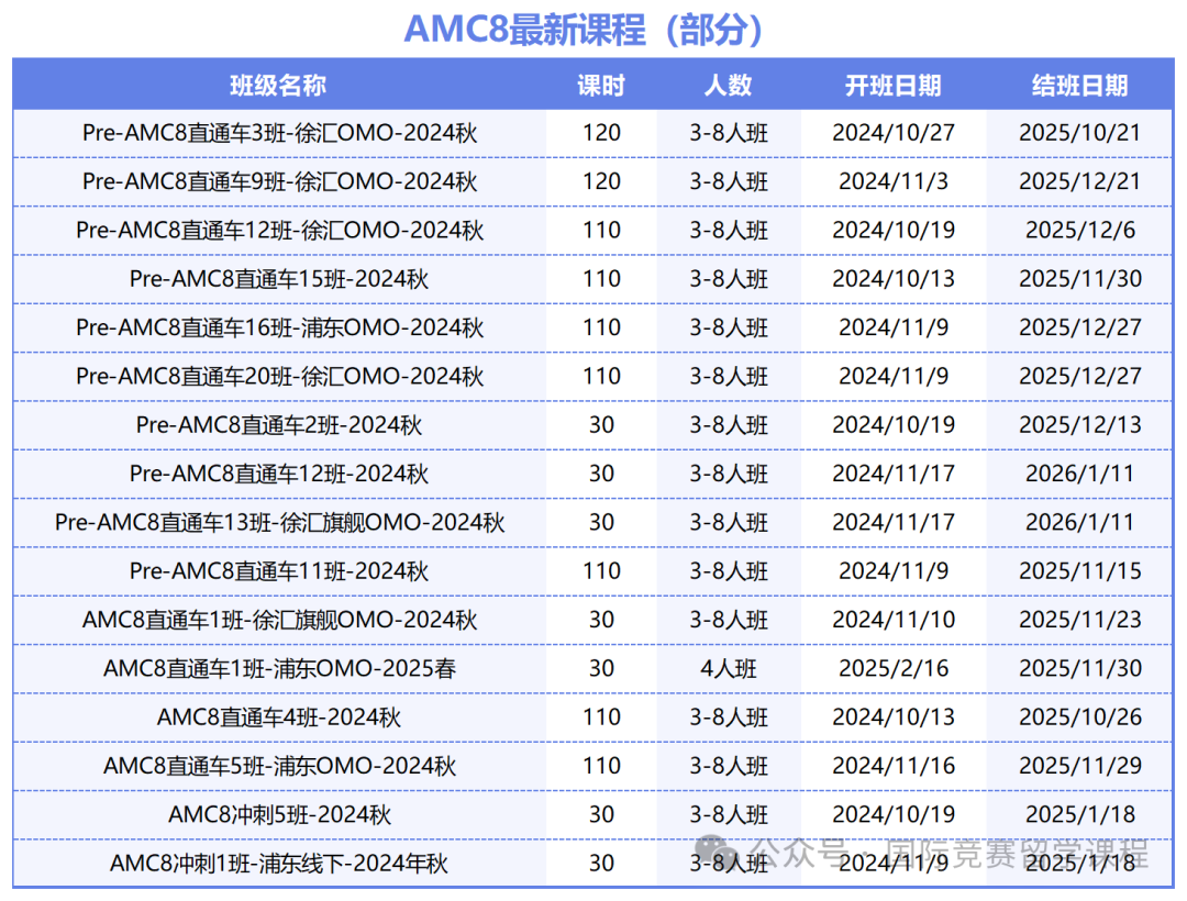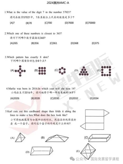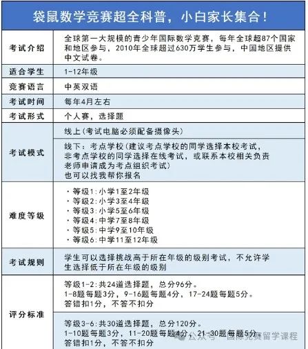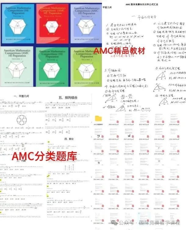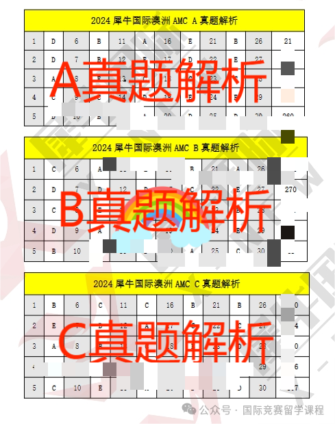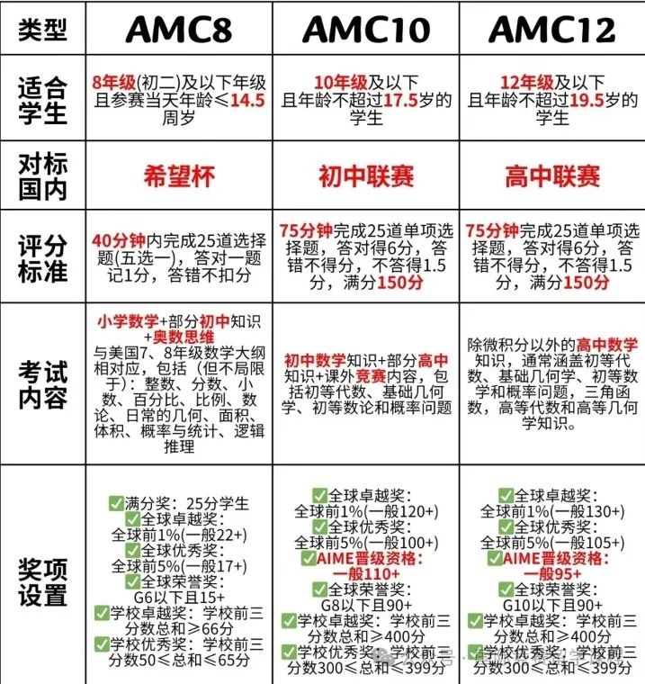 ![]() 完整澳洲AMC对答案 长按上方二维码添加小助理微信 ![]() ![]() 澳洲AMC考后竞赛规划 ![]() 聪明的父母不会让孩子被一个竞赛绊住前进的脚步,考完澳洲AMC竞赛后,这些竞赛也是含金量十分高,社会认可度很强的,建议大家可以重点关注: 美国数学竞赛(American Mathematics Competition)由美国数学协会Mathematics AssociationofAmerica(简称MAA)创建于1950年,是世界上目前信度和效度最高的数学科试题。 在国内来看,AMC系列的竞赛则成了不少优秀头部中学筛选生源的重要方式,比如上海三公、北京六小强、遵义四中青苗班等优先录取AMC8竞赛获奖(5%、1%奖)经验的孩子。 美国AMC目前已经形成包括AMC8、AMC10、AMC12、AIME、USJMO、USAMO等在内的一系列赛事。 ![]() 【竞赛时间】 AMC8:2025年1月23日(星期四)10:00-10:40 AMC10&12: A卷:2024年11月7日(星期四)17:00-18:15 B卷:2024年11月13日(星期三)17:00-18:15 【适合学生】 一年级以上任意年级学生,竞赛根据难易程度分为6个等级 【竞赛时间】 A级(1-2年级)/B级(3-4年级)/C级(5-6年级): 2024年3月30日10:00-11:15 D级(7-8年级)&E级(9-10年级)&F级(11-12年级) 2024年3月30日14:00-15:15 【竞赛规则】 个人笔试,均为选择题,75分钟,中英文 等级A-B:24道题,总分120分,起始分数为24分 等级C-F:30道题,总分150分,起始分数为30分 ![]() 美国高中生数学建模竞赛 美国高中生数学建模竞赛(High School MathematicalContest in Modeling,简称HiMCM),是美国的非营利机构美国数学及其应用联合会主办的一项国际性数学竞赛活动。 HiMCM竞赛始于1999年,为了提高参赛高中生的解决问题能力和写作技巧。在HiMCM获得提名奖以上的绝大多数人都能被美国排名前30的大学录取,被称为“美本名校通行证” 【适合学生】 9-12年级高中生,数学基础较好,有一定的理科基础和思维 【竞赛时间线】 报名截止时间 2024年11月6日下午2:00(美国东部时间) 竞赛时间 2024年11月6日至11月19日(美国东部时间) 【竞赛规则】 在为期14天内,参赛队伍根据实际问题来建立数学关系进行求解。团队选择处理A或B问题,并为他们选择的问题提交一个解决方案,并最终完成赛事论文的提交。 以下为AMC8等国际竞赛备考资料(部分),完整版请添加: ![]() 国际竞赛备考资料 长按上方二维码添加小助理微信 ![]() ![]() ![]() 国际竞赛培训课程 ![]() ![]() 为了帮助孩子们有更好的AMC8学习效果,我们特意推出了AMC8小班课,特色如下: