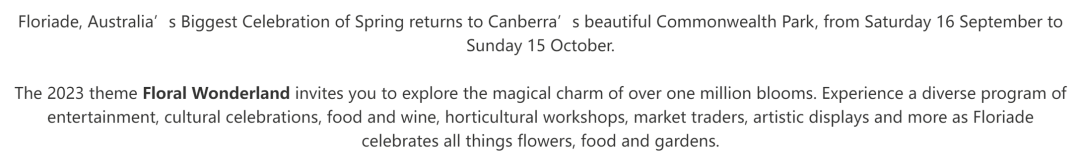 ![]() ![]() 点击澳洲青年旅行社关注我们 ![]() ![]() ![]() ![]() ![]() ![]() ![]() 盛大花展再度回归 ![]() #01 关于澳大利亚春天节 ![]() ![]() ![]() ![]() ![]() ![]() ![]() ![]() ![]() 堪培拉鲜花节(Floriade)是南半球最大的花展,首次举办于1998年,此后每年9月中旬至10月中旬(南半球春季)都举办至今,被认为是堪培拉最重要的旅游活动之一,也被称为“澳大利亚春天节”,举办地点为格里芬湖(Lake Burley Griffin)畔的联邦公园(Commonwealth Park)内。 2024年澳大利亚迎来新的春天,盛大花展再次回归!9月14日 - 10月13日 盛大举行! ![]() ![]() 9月14日 - 10月13日 花海盛宴 ![]() ![]() ![]() ![]() ![]() Floriade 于 2024 年庆祝其成立 37 周年,在 9 月和 10 月的 30 天里,堪培拉充满了美丽、色彩和活力。 节日将提供多样化的音乐节目、文化庆典、美食和美酒、园艺工作坊、市场贸易商、艺术展示、娱乐、娱乐活动等等,因为 Floriade 庆祝所有的鲜花、美食和花园,再没有哪个地方有比堪培拉更盛大的场面,来庆贺每年春季的回归。 ![]() ![]() 在堪培拉鲜花节举办的30天里,整个堪培拉都处处生机勃勃,联邦公园也变身成花卉的海洋,届时,郁金香、鸢尾花、水仙花、风信子、堇菜、菊花、毛茛和雏菊争相斗艳,美不胜收。 堪培拉鲜花节规模庞大,犹如8个足球场大的公园在节日期间将化成一片色彩斑斓,千娇百媚的花海,这场强烈的感官盛宴保证让爱花人士为之神魂颠倒,就连诗人也赞不绝口。 除了让人目不暇接的美丽花朵,还有娱乐表演、美食摊位以及专门为小朋友们认知自然界准备的活动等。 ![]() ![]() ![]() ![]() ![]() 花展每年都会有不同的主题,在举办的一个月时间内将会吸引超过数十万人次游客会参观游览, 为游客们带来一系列娱乐活动、集市和美酒佳肴。 2024年澳大利亚最大的春季庆祝活动 Floriade 将于 9 月 14 日星期六至 10 月 14 日星期日在堪培拉美丽的联邦公园举行。 ![]() Art in Bloom ![]() ![]() 绽放的春花彩绘 ![]() ![]() ![]() 今年,2024年的主题 是 Art in Bloom“绽放的春花彩绘”,邀您探索超过百万朵花朵的神奇艺术魅力。 参观者将欣赏到超过一百万朵充满活力的花朵展示! 体验丰富多彩的娱乐、文化庆祝活动、美食美酒、园艺工作坊、市场交易、艺术展览等,因为 Floriade 庆祝鲜花、美食和花园。 ![]() ![]() ![]() ![]() ![]() 游客们可以花海里品味美酒,摇摆起舞,聆听交响乐,或在挑选本地手工艺品,观看街头艺人的创意表演,观看马戏表演等。花香、音乐共同打造出美妙的花海盛宴。 坐下来享用美味的龙虾和一杯气泡酒,逛逛市场或探索美丽的花园,Floriade 盛大花展适合每一个人! #02 马上倾听鲜花蜜语 ![]() ![]() ![]() ![]() ![]() 澳洲青年旅行社 2024年澳大利亚的春天 精心安排 隆重推出 盛大色彩 堪培拉"花展专线"开通! ![]() ![]() ![]() #03 专线详情 ![]() ![]() ![]() ![]() ![]() ![]() ![]() 9月14日 - 10月13日 逢周二,四,六,日出发 ![]() ![]() 赏花路线 ![]() 踏著清晨的朝阳从悉尼出发,途径31号公路,首先到达谜一样的乔治湖,观景台驻足眺望风车阵,之后驱车来到国家企划厅,漫步于格里芬湖旁的草坪,品尝拥有各国料理和现代创意没得自助餐。 之后直接前往联邦公园 Commonwealth Park , 堪培拉花展Floriade 将于春天重返联邦公园,迎来其37周年纪念。 观赏澳大利亚最大的花展 Canberra Floriade, 游客们将能光上到超过一百万多五彩斑斓的花卉,一定不能错过的盛大色彩!万紫千红,满园春色,百花争艳令人欢笑。 ![]() ![]() ![]() ![]() ![]() ![]() 赠送美味自助午餐 ![]() 专线价格 ![]() 成人$119 小童$109 ![]() 包含 旅游巴士交通 华语专业司导服务 自助午餐 ![]() ![]() 不含 司机及导游服务费$6/人 一切个人消费 行程中未列明的餐食 强烈建议购买各种旅行保险 ![]() 专线集合时间地点 6:45am Eastwood 火车站对面(图书馆) 7:30am 唐人街 Harbour St Haymarket 悉尼国际免税中心门口(假日酒店旁) 8:00am Hurstville 华英小厨旁 ![]() ![]() ![]() ![]() 专线座位有限! 一定不能错过! 共赴一场鲜花盛宴! 2024年澳大利亚的春天 我们堪培拉见! ![]() ![]() ![]() 马上光临我们各大分店预订! ![]() ![]() ![]() ![]() ![]() ![]() ![]() ![]() END ![]() 长按 以下二维码 添加客服微信 ![]() ![]() ![]() 【暖暖小假期】10月7日出发啦!全新"黄金海岸五天巴士团"隆重出发!金色阳光 海水湛蓝!多彩灿烂暖暖小假期!亲子假期首选! ![]() 【2024共赴一场春的盛宴】惊艳世界 万亩花海!悉尼24K纯金花田限时绽放!"澳洲油菜花海"赏花专线开通!倒计时开始! ![]() "春意盎然 人间欢喜" 堪培拉2天"赏花专线"最新开通!澳大利亚的春天!难得一见的花意休闲小假期! 特价机票?特价旅游?关注我们! 澳大利亚最大的华人旅行社之一 ↓↓ 梦想起飞 我们与您同在... ![]() ![]() ![]() ![]() |