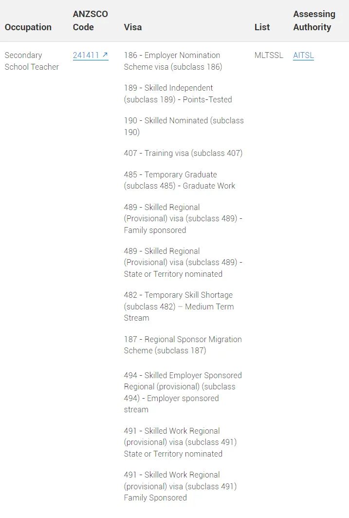 02移民途径中学老师这个职业在澳洲属于中长期职业列表上,可以选择的签证类别有以下: