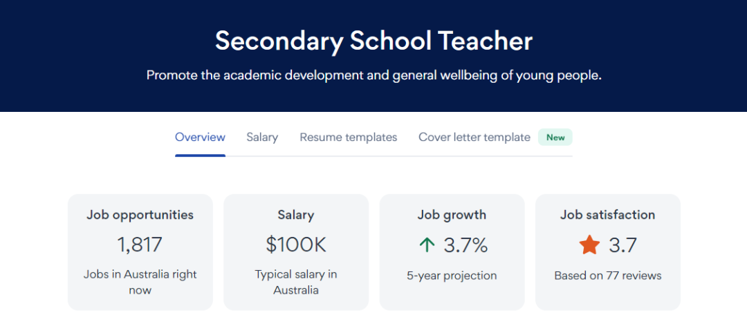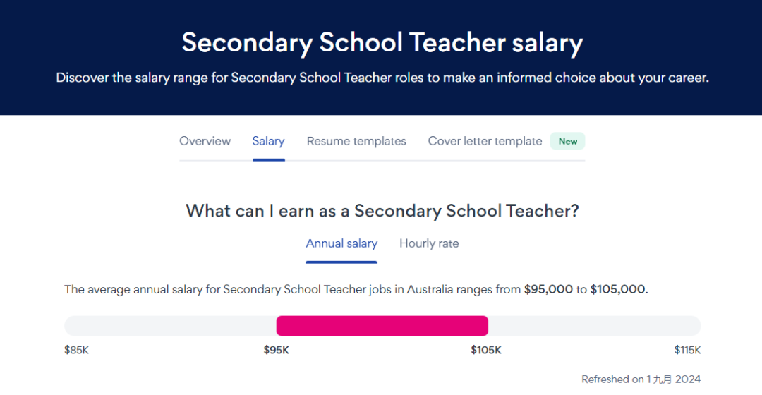 03就业前景根据SEEK 2024年公布的最新数据显示,中学教师的平均年薪约在$95,000-$105,000;此外,积累一定经验后,部分有经验的中学教师年薪可高达11.5万澳币。