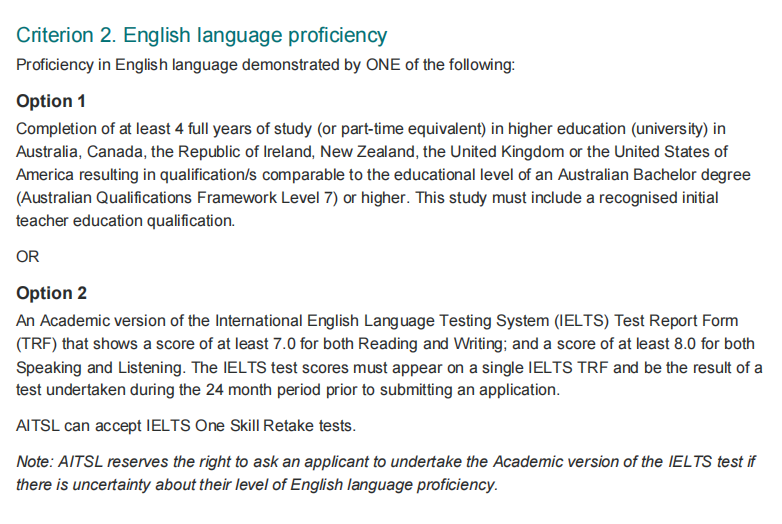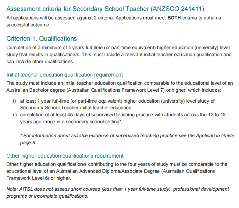 * 需提供受监督教学实践的适当证据。其他高等教育学历要求其他对四年学习有贡献的高等教育资格必须与澳大利亚高级文凭/副学士学位(澳大利亚资格框架6级)或更高的教育水平相当。 注: AITSL 不评估短期课程(少于1年的全日制学习) 。