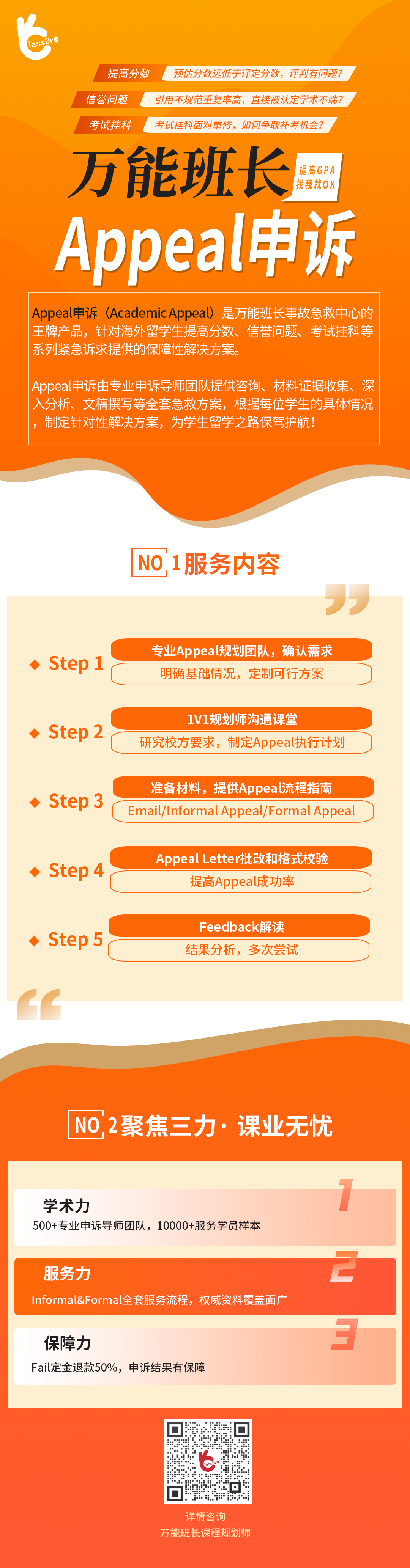 ![]() 在澳洲的留学期中考试,作为检验学习成果的重要环节,其结果往往牵动着每一位留学生的心。如果不幸在期中考试中挂科了,请不要慌张,及时补救仍然有机会避免影响你的GPA和学术生涯。今天,我们就来深入探讨一下期中挂科后该如何应对。 一、期中考试挂科的后果与影响 期中考试挂科,虽然不会直接导致整门课程挂科,但无疑会对最终成绩产生一定影响。一般来说,期中考试成绩在总成绩中占有一定的比重,挂科可能会让你通过课程的机会变得更加艰难。然而,这并不意味着你已经失去了所有希望。通过后续的作业、期末考试等形式,你仍然有机会进行补救,抓住后面的机会,力挽狂澜。 ![]() 二、期中考试挂科后的应对方法 与导师及时沟通 挂科后,首要的任务是与课程导师进行沟通。了解挂科的具体原因,询问是否有机会进行重考。部分澳洲大学允许学生进行重考,重考成绩有时可以替代原分数,从而减轻对GPA的影响。但这个机会是否存在,取决于各学校的政策和导师的决定。因此,及时与导师沟通,了解学校的补救措施,是挂科后的重要一步。 检查并纠正错误 挂科之后,先不要急于自责或沮丧。冷静下来,仔细检查自己的错误。你是因为复习不充分而挂科,还是某些知识点没有理解到位?是时间管理出现问题,还是考试策略不当?找到问题的根源,才能在接下来的学习中避免同样的失误。此外,申请查看试卷也是一个好办法。通过分析试卷上的错误,你可以发现自己的薄弱环节,从而有针对性地加强学习,防止以后再犯同样的错误。 考虑撤课或重修 如果期中挂科让你觉得整个课程无力挽回,可以考虑撤课或申请重修。在澳洲,撤课意味着从成绩单中删除该门课程的成绩。虽然成绩单会显示你曾修过这门课,但GPA不会受到影响。在学期中途撤课,成绩单上会出现“W”(Withdrawal)的标记,而不会显示具体分数。这个标记对未来申请研究生或转学影响较小,但若多次出现,可能会引起学校的关注。因此,在决定撤课之前,请务必权衡利弊,做出明智的选择。 如果你选择重修,那么你需要付出更多的时间和精力来重新学习这门课程。但请记住,重修并不意味着失败,而是你勇于面对挑战、追求卓越的体现。 积极调整心态 挂科并不意味着失败,它只是学习过程中的一个小插曲。不要把挂科看作对自己能力的否定,而是反思和提升的机会。通过总结经验教训,你会发现自己的学术能力其实在不断提升。保持积极的心态,相信自己能够克服困难,是挂科后最重要的心态调整。 ![]() 三、以新南威尔士大学为例的应对策略 在新南威尔士大学,如果考试挂科了,有多种应对办法,比如补考、申诉分数、撤课、重修等。 首先,看看是否有资格补考。在新南,如果是最后一学期挂了一门课,且分数在40-49分之间,学校会给补考机会且不用申请,符合条件学校会发邮件通知。但请注意,倒数第二学期挂科,且那门课下个学期不开设,也能申请补考;其他情况一般不能补考。 其次,如果对分数有疑问,可以找老师申诉要求加分。先找任课老师申请复查,老师的反馈很关键,对后续申诉很重要。截止日期是成绩公布后5天内递交申请,通常4周内出结果。 此外,如果不是大学的最后一学期,还能选择非常规撤课。但需要注意的是,非常规撤课申请难度较大,成绩显示为DC,不算挂科。但请记住,考试前能申请特殊情况延期考试或重考;参加考试后就不能申请了。 添加方式 扫描下方二维码,添加小助手备注【公众号】,即可获得定制化辅导方案! ![]() ![]() ![]() |