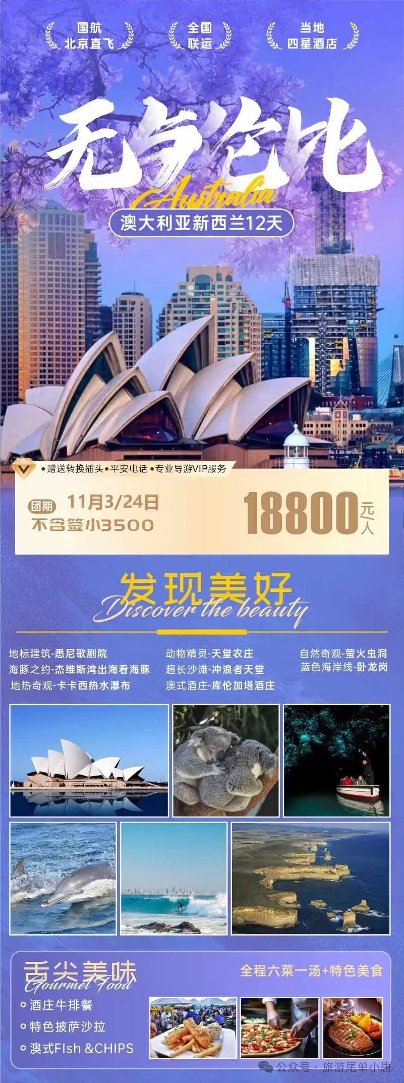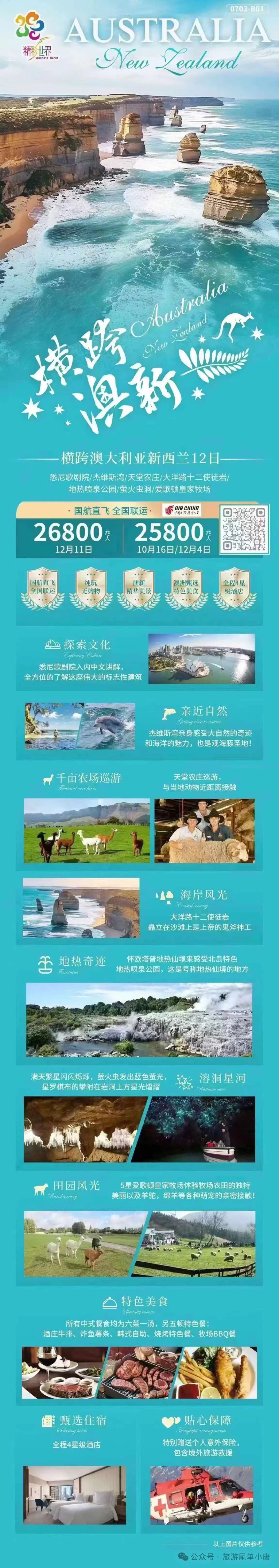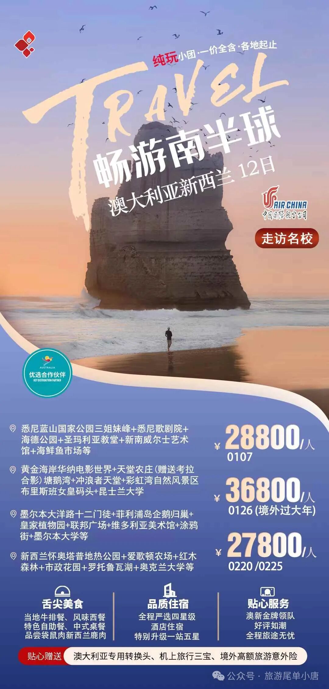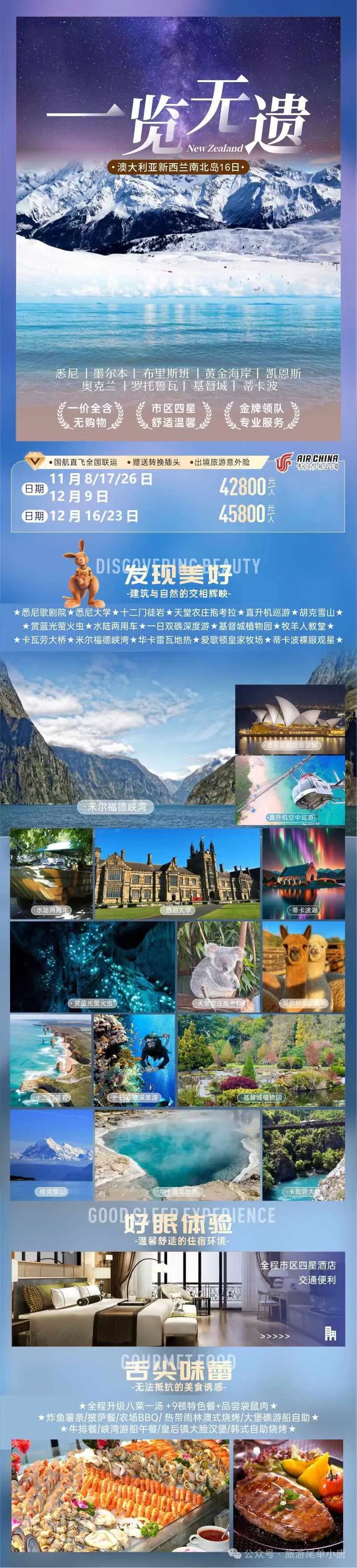 1109/1224 (🎄圣诞跨年)❗️澳大利亚新西兰连线13天 🥇赠送高额出境旅游意外险,出行无忧; ✈精选搭乘五星航空各地起止; 🏨酒店:优选四星,升级一晚五星; 🍽饕餮美食:品尝澳式牛排餐🥩、风味西餐、特色中餐六菜一汤、品尝澳洲袋鼠肉和新西兰鹿肉; 💁♂独家奉送:澳新专用转换插头及机上旅行三宝,旅行更加轻松便捷; 👉精彩活动,不容错过: 杰维斯湾🐬探索之旅、特别安排享用正宗澳式牛排餐🥩;悉尼歌剧院、悉尼鱼市场、大洋路十二门徒岩、维多利亚艺术馆、皇家植物园、涂鸦街🎨、环城有轨电车体验🚃、天堂农庄、赠送抱考拉合影🐨、塘鹅湾、怀奥塔普地热保护区、爱歌顿农场、红木森林 🏔一览无遗系列---一价全含澳大利亚新西兰南北岛16日含凯恩斯墨尔本米佛峡湾 🌈澳大利亚东海岸线新西兰南北岛全境组合✈累计万人出行游览 💎昆省俩大自然遗产❤大堡礁-热带雨林 🚢一日内外双大堡礁👉水陆俩用车深入热带雨林 🚁直升机巡游体验,蓝光萤火虫,亲手抱萌宠考拉照相 🏖黄金沙滩冲浪者天堂,塘鹅湾喂食野生塘鹅 🌄墨尔本十二门徒享自然之风,观自然之奇 🎉悉尼歌剧院入内,漫步雅芳河河畔 🌃夜宿国际星空保护区-裸眼观星体验 🎉穿越库克山国家公园,山脚下胡克雪山山谷步道徒步 🚢乘坐游轮航行在米尔佛德峡湾,雪山瀑布奇迹 🍃漫步红木森林,登伊甸山观奥克兰全景 🦙爱歌顿皇家牧场巡游,观地热公园奇景 🏠亲入澳洲第一校:悉尼大学 ✈国航北京直飞,全国联运;👍金牌领队,含小费; ❤赠送澳大利亚专用转换插头,境外高额意外保险;纯粹游玩无购物; 🏨全程当地四星酒店🍩全程八菜一汤及特色餐 🐬无与伦比澳大利亚新西兰12天🇦🇺 团期: 11🈷️3/24日18800元 中国国航北京直飞 全国免费联运 全程当地⭐⭐⭐⭐4星精选酒店 景点特色: 悉尼歌剧院 杰维斯湾出海观海豚🐬 蓝色海岸线卧龙岗 🚗墨尔本十二门徒 🐨动物精灵天堂农庄 🍷澳式酒庄品红酒吃牛排🥩 洞穴世界天宝林山萤火虫洞 🐨爱歌顿农场亲密接触小动物 赠送转换插头🔌平安电话☎ #公主邮轮皇家公主号 澳大利亚+新西兰18日 【春节航次】2025年1月30日北京出发; ❗除邮轮小费,一价全含❗ 【国航直飞】可查全国联运✈️ 【经典航线】悉尼进出,深度环游新西兰南北岛; 【特别安排】悉尼塔高空晚宴、悉尼歌剧院入内参观; 【所需签证】澳大利亚电子签+新西兰电子签📙; 【豪华邮轮】14.2万吨、休闲娱乐、美食种类丰富多样; 春节航次,1月30日北京出发(大年初二) 💰内舱双人间:49800元/人 💰阳台双人间:54800元 /人 澳新8站目的地:悉尼-岛屿湾-奥克兰-陶朗加-惠灵顿-基督城-但尼丁-峡湾国家公园-悉尼 11🈷️-12🈷️“畅游南半球”澳大利亚新西兰 海陆空 12天 国航精品团 🥇赠送高额出境旅游意外险,出行无忧; 团期:1117/1124 /1201 /1207 /1217 ✈精选搭乘五星航空:国航北京起止,各地联运; 🏨酒店:全程严选澳新四星级酒店住宿,升级一站五星; 🍽饕餮美食:品尝当地牛排餐🥩、风味西餐、特色自助餐、中式桌餐品尝澳洲袋鼠肉和新西 兰鹿肉; 💁♂独家奉送:澳新专用转换插头及机上旅行三宝,旅行更加轻松便捷; 👉精彩活动,不容错过: 悉尼蓝山国家公园三姐妹峰、悉尼动物园、悉尼歌剧院、海德公园、圣玛利亚教堂、新南威尔士艺术馆、海鲜市场、大洋路十二门徒岩、维多利亚艺术馆、皇家植物园、涂鸦街🎨、环城有轨电车体验🚃、黄金海岸Q1观景台、塘鹅湾、冲浪者天堂、赠送豪华直升机观光、彩虹湾自然风景区、怀奥塔普地热保护区、爱歌顿农场、市政花园、红木森林+奥克兰超全市区景点打卡 🚢【皇家公主号】启航~澳大利亚 新兰西环岛巡游19天͏ 💖 🇦🇺国航北京直飞🛫澳大利亚和新西兰 🇳🇿奥克兰起止➕岛屿湾➕奥克兰登天空塔➕陶朗加明登观景台⛲️➕惠灵顿观光缆车🚡+利特尔顿➕但尼丁拉纳克城堡🏰+巡航湾峡国家公园+悉尼大桥🌉(皇家公主号) 🚢悉尼启航➕墨尔本蒸汽火车🚂➕霍巴特威灵顿山⛰️➕巡航湾峡国家公园➕但尼丁拉纳克城堡🏰➕利特尔顿➕岛屿湾➕陶朗加明登观景台⛲️➕奥克兰登天空塔(皇家公主号) 🔥岸观上光已含安,心出“邮”!🛳 【横跨澳新12日】 行程特色: 探索澳大利亚+新西兰北岛 国航直飞 全国联运 纯玩无购物 悉尼歌剧院 入内 中文讲解 大洋路十二使徒岩矗立在沙滩上是上帝的鬼斧神工; 5星爱歌顿皇家牧场体验牧场农田的独特美丽以及羊驼,绵羊等各种萌宠的亲密接触! 所有中式餐食均为六菜一汤,另5顿特色餐:酒庄牛排+澳式炸鱼薯条+韩式自助餐+牧场BBQ+烧烤自助餐; 全程连锁4星级酒店; 特别赠送个人意外保险,包含境外旅游救援; 【春节档期】澳大利亚四+新西兰南北岛17天 📍一站式打卡南半球经典 🤩深澳洲最大城市悉尼,度假胜地黄金海岸,热带之都凯恩斯,墨尔本海洋路岩石、新西兰千帆之都奥克兰,花园之城基督城,探险之都皇后镇,人间净土特卡波,火山上的城市罗托鲁瓦,西海岸冰川小镇+丛林萤火虫探索,国家公园库克山等 ✈东航直飞,澳进新出,不走回头路 🍗升级中式8菜1汤+12大特色美食 🏨升级2晚五星+四星酒店(小镇特色酒店) 💵含首道门票:🚁5分钟黄金海岸直升机之旅、天堂农庄🐨(赠考拉合影) 、🏝 绿岛大堡礁出海一日游、🏞米佛峡湾游船、 🧙霍比特人村 