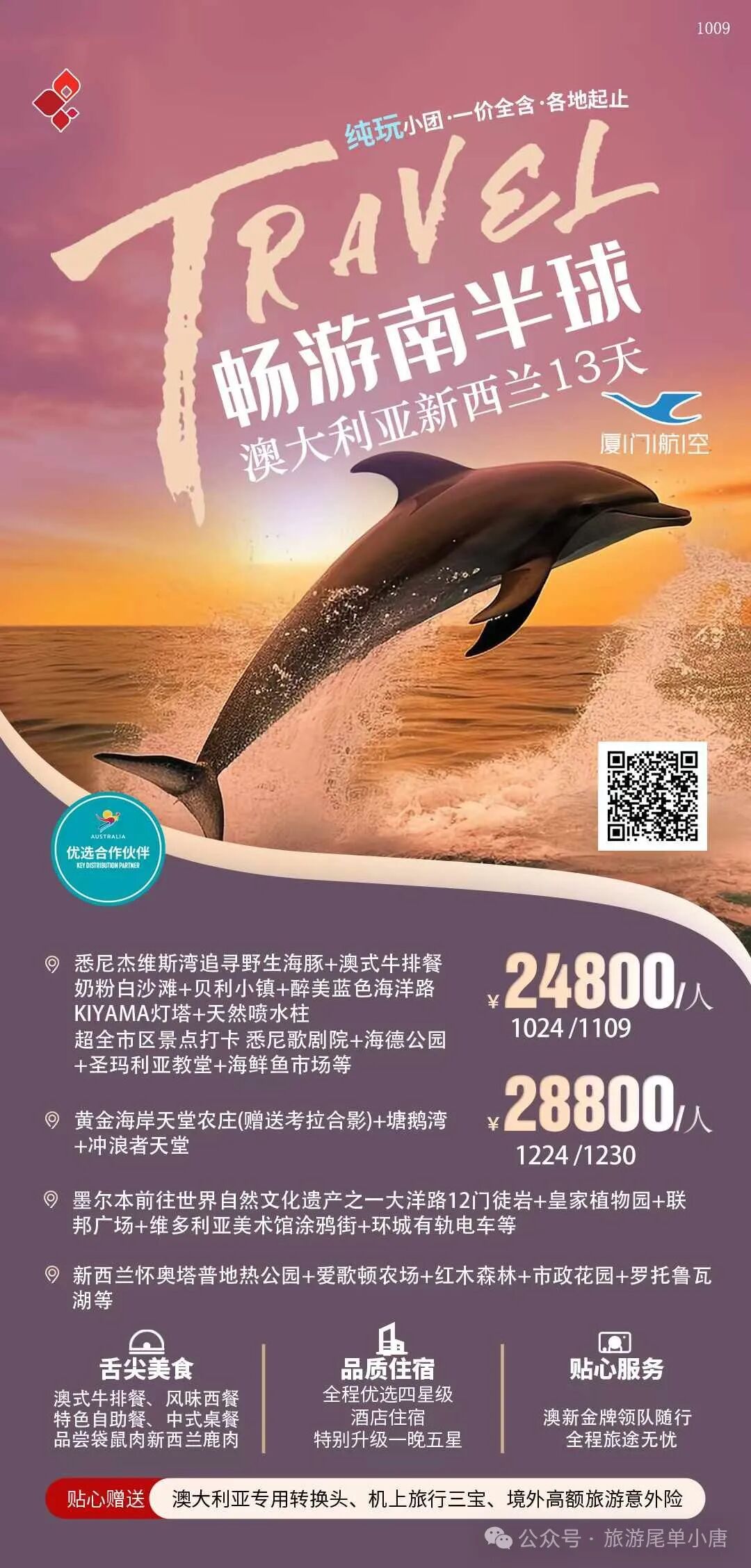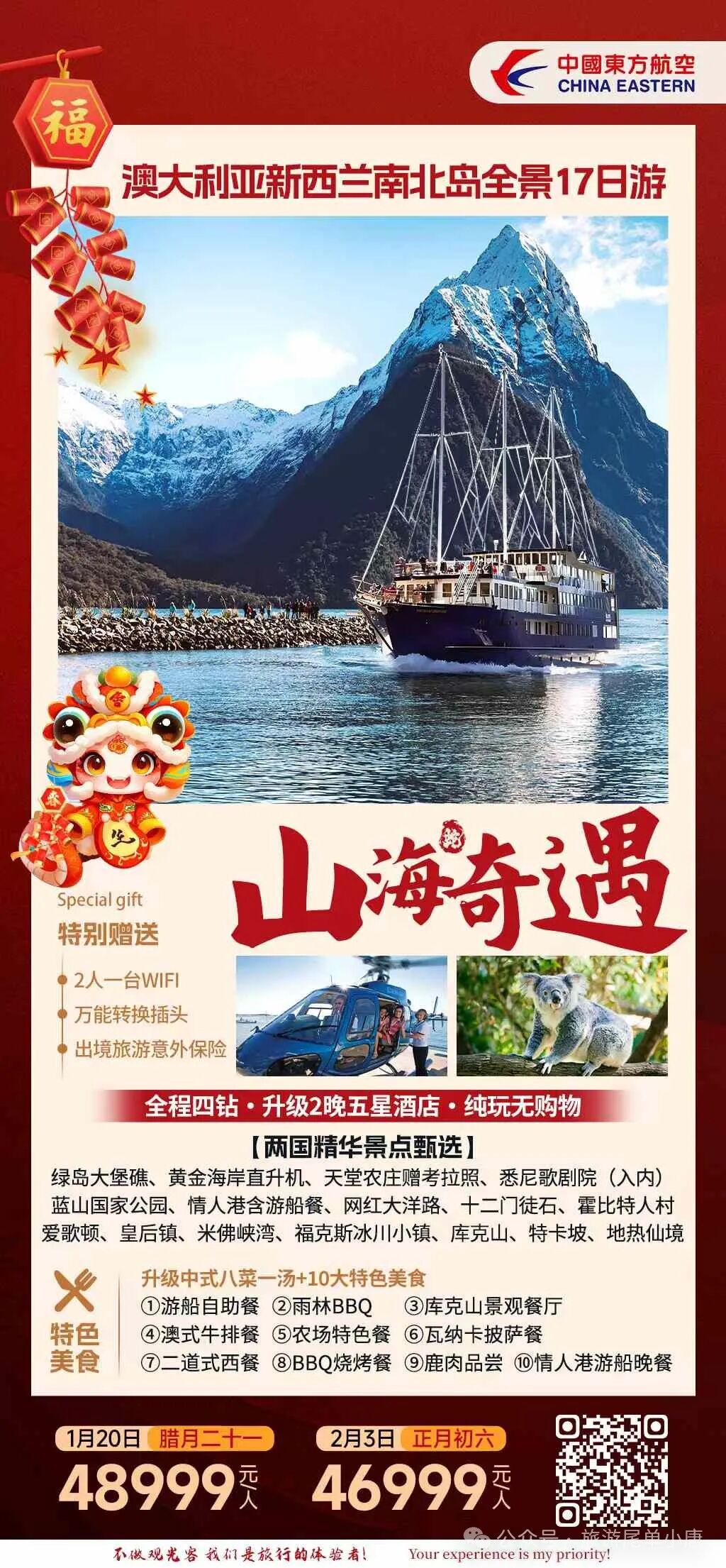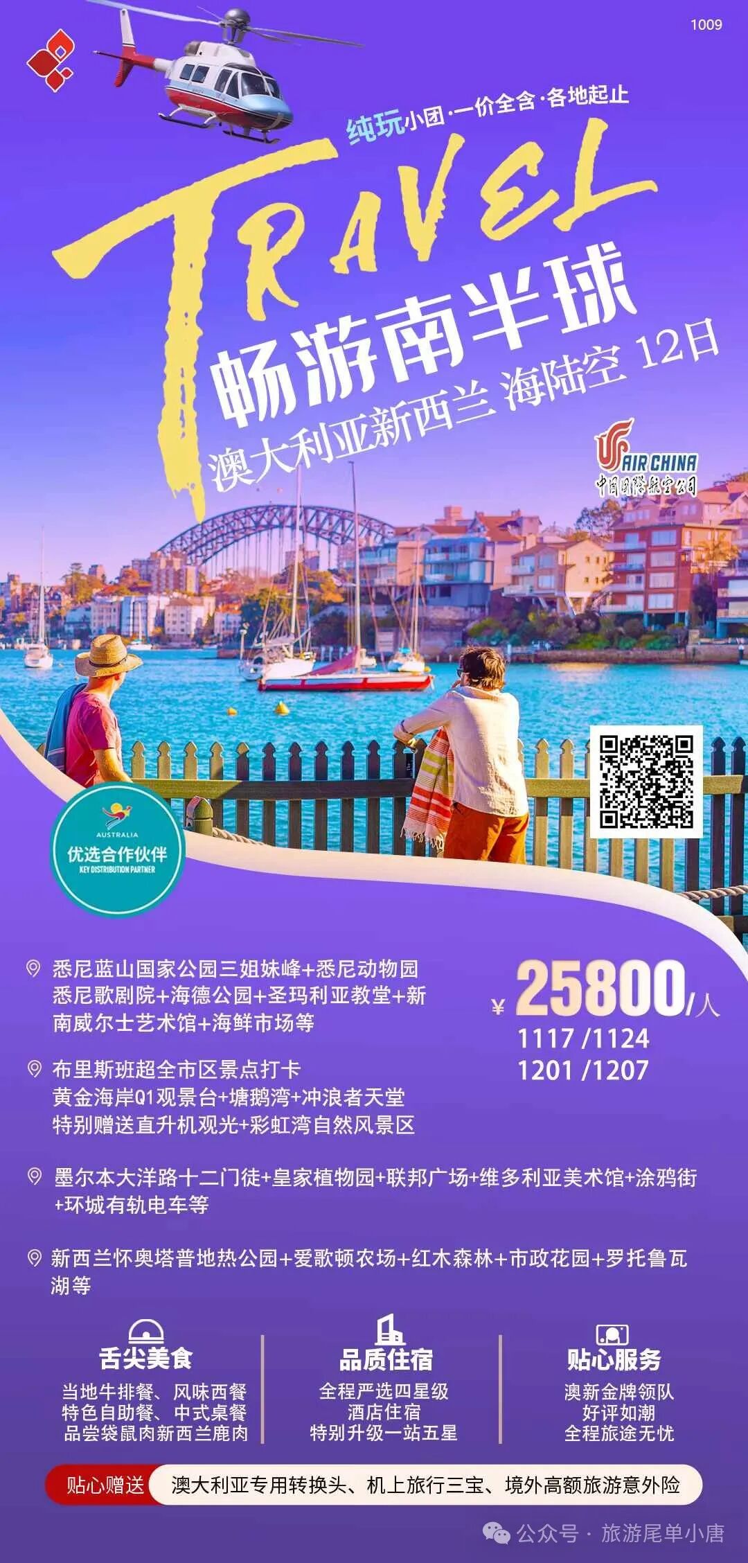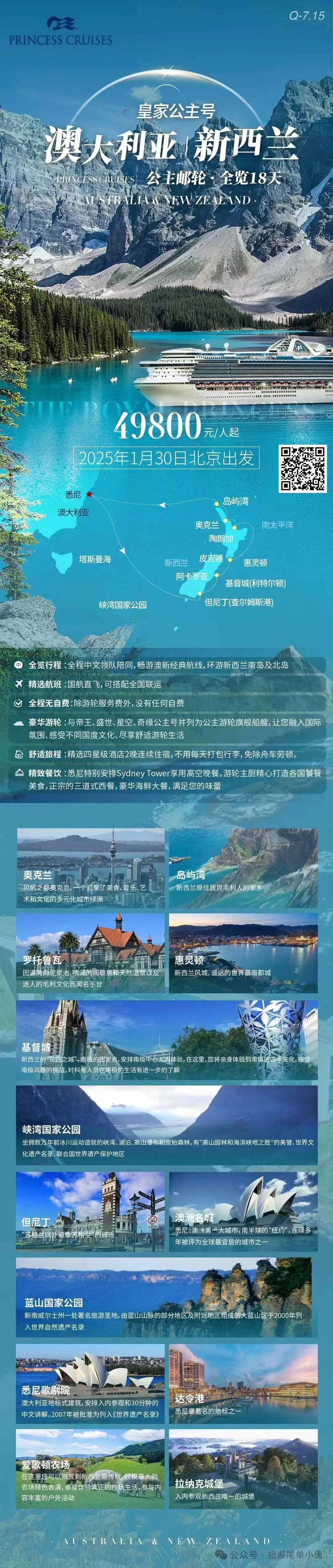 1109/1224 (🎄圣诞跨年)❗️澳大利亚新西兰连线13天 🥇赠送高额出境旅游意外险,出行无忧; ✈精选搭乘五星航空各地起止; 🏨酒店:优选四星,升级一晚五星; 🍽饕餮美食:品尝澳式牛排餐🥩、风味西餐、特色中餐六菜一汤、品尝澳洲袋鼠肉和新西兰鹿肉; 💁♂独家奉送:澳新专用转换插头及机上旅行三宝,旅行更加轻松便捷; 👉精彩活动,不容错过: 杰维斯湾🐬探索之旅、特别安排享用正宗澳式牛排餐🥩;悉尼歌剧院、悉尼鱼市场、大洋路十二门徒岩、维多利亚艺术馆、皇家植物园、涂鸦街🎨、环城有轨电车体验🚃、天堂农庄、赠送抱考拉合影🐨、塘鹅湾、怀奥塔普地热保护区、爱歌顿农场、红木森林 🏔一览无遗系列---一价全含澳大利亚新西兰南北岛16日含凯恩斯墨尔本米佛峡湾 🌈澳大利亚东海岸线新西兰南北岛全境组合✈累计万人出行游览 💎昆省俩大自然遗产❤大堡礁-热带雨林 🚢一日内外双大堡礁👉水陆俩用车深入热带雨林 🚁直升机巡游体验,蓝光萤火虫,亲手抱萌宠考拉照相 🏖黄金沙滩冲浪者天堂,塘鹅湾喂食野生塘鹅 🌄墨尔本十二门徒享自然之风,观自然之奇 🎉悉尼歌剧院入内,漫步雅芳河河畔 🌃夜宿国际星空保护区-裸眼观星体验 🎉穿越库克山国家公园,山脚下胡克雪山山谷步道徒步 🚢乘坐游轮航行在米尔佛德峡湾,雪山瀑布奇迹 🍃漫步红木森林,登伊甸山观奥克兰全景 🦙爱歌顿皇家牧场巡游,观地热公园奇景 🏠亲入澳洲第一校:悉尼大学 ✈国航北京直飞,全国联运;👍金牌领队,含小费; ❤赠送澳大利亚专用转换插头,境外高额意外保险;纯粹游玩无购物; 🏨全程当地四星酒店🍩全程八菜一汤及特色餐 🐬无与伦比澳大利亚新西兰12天🇦🇺 团期: 11🈷️3/24日18800元 中国国航北京直飞 全国免费联运 全程当地⭐⭐⭐⭐4星精选酒店 景点特色: 悉尼歌剧院 杰维斯湾出海观海豚🐬 蓝色海岸线卧龙岗 🚗墨尔本十二门徒 🐨动物精灵天堂农庄 🍷澳式酒庄品红酒吃牛排🥩 洞穴世界天宝林山萤火虫洞 🐨爱歌顿农场亲密接触小动物 赠送转换插头🔌平安电话☎ #公主邮轮皇家公主号 澳大利亚+新西兰18日 【春节航次】2025年1月30日北京出发; ❗除邮轮小费,一价全含❗ 【国航直飞】可查全国联运✈️ 【经典航线】悉尼进出,深度环游新西兰南北岛; 【特别安排】悉尼塔高空晚宴、悉尼歌剧院入内参观; 【所需签证】澳大利亚电子签+新西兰电子签📙; 【豪华邮轮】14.2万吨、休闲娱乐、美食种类丰富多样; 春节航次,1月30日北京出发(大年初二) 💰内舱双人间:49800元/人 💰阳台双人间:54800元 /人 澳新8站目的地:悉尼-岛屿湾-奥克兰-陶朗加-惠灵顿-基督城-但尼丁-峡湾国家公园-悉尼 11🈷️-12🈷️“畅游南半球”澳大利亚新西兰 海陆空 12天 国航精品团 🥇赠送高额出境旅游意外险,出行无忧; 团期:1117/1124 /1201 /1207 /1217 ✈精选搭乘五星航空:国航北京起止,各地联运; 🏨酒店:全程严选澳新四星级酒店住宿,升级一站五星; 🍽饕餮美食:品尝当地牛排餐🥩、风味西餐、特色自助餐、中式桌餐品尝澳洲袋鼠肉和新西 兰鹿肉; 💁♂独家奉送:澳新专用转换插头及机上旅行三宝,旅行更加轻松便捷; 👉精彩活动,不容错过: 悉尼蓝山国家公园三姐妹峰、悉尼动物园、悉尼歌剧院、海德公园、圣玛利亚教堂、新南威尔士艺术馆、海鲜市场、大洋路十二门徒岩、维多利亚艺术馆、皇家植物园、涂鸦街🎨、环城有轨电车体验🚃、黄金海岸Q1观景台、塘鹅湾、冲浪者天堂、赠送豪华直升机观光、彩虹湾自然风景区、怀奥塔普地热保护区、爱歌顿农场、市政花园、红木森林+奥克兰超全市区景点打卡 🚢【皇家公主号】启航~澳大利亚 新兰西环岛巡游19天͏ 💖 🇦🇺国航北京直飞🛫澳大利亚和新西兰 🇳🇿奥克兰起止➕岛屿湾➕奥克兰登天空塔➕陶朗加明登观景台⛲️➕惠灵顿观光缆车🚡+利特尔顿➕但尼丁拉纳克城堡🏰+巡航湾峡国家公园+悉尼大桥🌉(皇家公主号) 🚢悉尼启航➕墨尔本蒸汽火车🚂➕霍巴特威灵顿山⛰️➕巡航湾峡国家公园➕但尼丁拉纳克城堡🏰➕利特尔顿➕岛屿湾➕陶朗加明登观景台⛲️➕奥克兰登天空塔(皇家公主号) 🔥岸观上光已含安,心出“邮”!🛳 【横跨澳新12日】 行程特色: 探索澳大利亚+新西兰北岛 国航直飞 全国联运 纯玩无购物 悉尼歌剧院 入内 中文讲解 大洋路十二使徒岩矗立在沙滩上是上帝的鬼斧神工; 5星爱歌顿皇家牧场体验牧场农田的独特美丽以及羊驼,绵羊等各种萌宠的亲密接触! 所有中式餐食均为六菜一汤,另5顿特色餐:酒庄牛排+澳式炸鱼薯条+韩式自助餐+牧场BBQ+烧烤自助餐; 全程连锁4星级酒店; 特别赠送个人意外保险,包含境外旅游救援; 【春节档期】澳大利亚四+新西兰南北岛17天 📍一站式打卡南半球经典 🤩深澳洲最大城市悉尼,度假胜地黄金海岸,热带之都凯恩斯,墨尔本海洋路岩石、新西兰千帆之都奥克兰,花园之城基督城,探险之都皇后镇,人间净土特卡波,火山上的城市罗托鲁瓦,西海岸冰川小镇+丛林萤火虫探索,国家公园库克山等 ✈东航直飞,澳进新出,不走回头路 🍗升级中式8菜1汤+12大特色美食 🏨升级2晚五星+四星酒店(小镇特色酒店) 💵含首道门票:🚁5分钟黄金海岸直升机之旅、天堂农庄🐨(赠考拉合影) 、🏝 绿岛大堡礁出海一日游、🏞米佛峡湾游船、 🧙霍比特人村 