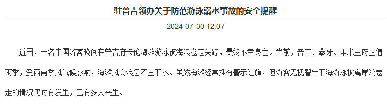 ![]() 这是潜水游世界第19316次分享 为了不错过推送,请把我们加入⭐标 出处/悉尼见闻 不少中国人选择来澳旅游。 作为游客,在外旅游最需要注意的就是安全问题。 毕竟,在陌生的地方更容易发生意外。 前天下午,墨尔本南部的旅游胜地莫宁顿半岛(Mornington Peninsula)突发悲剧,多人在海边的岩石上被海浪卷走,其中一人不幸遇难。 ![]() 据报道,死者为中国公民(Chinese national),为53岁女性。 剩下两人并没有大碍,被送往医院,情况稳定。 两名中国人在澳被海浪卷走 一人不幸遇难 据报道,周一中午,在墨尔本南部莫宁顿半岛的尚克岬 (Cape Schanck)景区,有三人在海边的岩石上散步时被突如其来的海浪卷走。 三人分别为一名53岁中国女子、一名55岁中国男子、一名24岁的墨尔本Parkville男子。 两名男子最终安全上岸,但女子再也没有上来。 ![]() 随后,紧急救援人员赶赴Cape Schanck栈道的底部,将一名53岁女性的尸体打捞上岸。 两名男子随后被送往Rosebud Hospital ,情况稳定。 ![]() 根据维州政府对公园的介绍,尚克岬 (Cape Schanck) “拥有令人惊叹的风景、神秘的火山风光、原生的野生海滩以及风景优美的步道”,游客可在此欣赏壮丽的海景。 此外,这里也有一处具有悠久历史的灯塔,建于1859年,被列入遗产名录。 灯塔,意味着有复杂的海况,需要提醒远航的水手避开礁石。 ![]() 而这里的情况也十分凶险。 周一的事故是自2018年以来该地区附近周围水域发生的第四起溺水事件。 今年2月,就有一群人被海浪冲到了Cape Schanck的岩石上,造成8人受伤。 ![]() 2021年,45岁的Aida Hamed在附近的Bushrangers Bay溺水身亡,当时她和包括家人在内的一群人被被从岩石上冲入水中。 2018年的圣诞节当天,还有一名64岁的潜水员在同一水域遇险溺亡。 维州救生队的Liam O'Callaghan警告称,游客们要小心无人巡逻(如Cape Schanck)的海滩。 这种海滩没有救生员,下海游泳十分危险,连靠近大海也会有风险。 游客们不是当地人,往往对海滩的凶险程度一无所知。 意外之所以是意外,就是因为这种事情的发生不可预测。 在巨浪面前,人还是太渺小了。 ![]() 谁也不清楚,什么时候就会来一股大浪,把人卷走…… 类似事故频发 海边玩耍千万注意安全 澳洲四面都是海,人们也大多居住在沿海地区。 大海,是澳洲人生命中不可或缺的部分;到海边玩耍,也是澳人的日常。 不过,海边并不安全,甚至可以说是危机四伏。 根据澳洲皇家救生组织(Royal Life Saving Australia)的数据,仅在去年12月到今年2月的三个月期间,全澳就有99人溺水身亡。 其中,10%是来澳大利亚度假的海外游客。 ![]() 许多溺水死亡事件发生在无人巡逻的偏僻地区。 近年来,中国游客在海边遭遇意外的情况也越来越多。 看似平静的海边,也会出现汹涌的大浪,而一旦被浪卷走,即便会游泳也很难脱身。 2019年9月1日,在泰国的知名旅游景区普吉岛的卡伦海滩,就有一名中国游客坐在海边的礁石上时不幸被突如其来的浪花卷走,不幸遇难。 ![]() 今年7月,又有一名中国游客遭遇相同的悲剧。 ![]() 有些人可能觉得,自己会游泳,被卷走也没事。 但现实是很残酷的。 去年10月,一名卧龙岗大学的中国留学生在和同伴游泳时遇到危险,他奋不顾身营救同伴,最终体力不支,不幸溺水身亡。 ![]() 在此次事故中,凶险的“离岸流”,正是澳洲每年海边溺水事故的重要原因。 据统计,澳洲每年平均有21个人因离岸流溺水身亡。 离岸流是受海岸线影响而形成的一种特殊海流。 当海浪冲向岸边时,海水会受到后续海浪的推挤,从而向中间汇聚。这时,就会形成一股湍急、强劲的向外海方向运动的水流。 这股水流会将人快速带离海岸,漂向外海。人在与离岸流对抗时,容易因体力不支而溺水身亡。 ![]() 因此,如不慎被卷入离岸流,最好的办法是保持冷静,向与离岸流垂直的方向游出。如果有风,则最好顺着风的方向游。 千万不可径直向岸游,那样相当于以人力对抗海流,很容易体力不支,被浪卷走。 海边的危险因素很多,离岸流只是其中之一。 一个突如其来的大浪、一次涨潮、一条凶猛的鲨鱼……都可能“吃人”。 因此,在海边游玩时,也应注意观察警示标识和天气状况。如果海滩安全防护措施不完备,或没有救生人员,或天气状况不佳,则千万不能下水,也不要离海边太近。 在澳洲的海边游玩,红黄旗是重要的标识,代表这两个旗子之间的区域有救生员巡逻。 无人巡逻的海滩,通常不适宜普通人在此停留、游玩。 ![]() 一旦发生意外,第一时间找到救生员,他会去救人。 不过,也要注意救生员的工作时间,在他们下班后,切勿再靠近海面。 此外,在长途旅行后或身感疲劳的情况下,请不要参与任何水上活动。 在充分休息以及体力恢复后再谨慎参与任何水上活动,例如,乘船赴远海观景等,且千万要带好救生衣。 同时,避免在酒后、身体不适等意识不是很清醒的时候靠近海边。若身上有伤口,千万不要下海,因为血腥味可能引来鲨鱼。 ![]() 带孩子到海边玩的,千万看好孩子,确保孩子在每一个时刻都有人看护。 通常来说,0-5岁的未成年人是不会游泳的,需时刻有成年人在伸手可及的范围内陪护;6-10岁的未成年人需有成年人在附近,保持视线可及,并时刻做好施救准备;11-14岁的未成年人也应保证在成年人目视可及的较近距离内活动。 结语 周一中午,墨尔本的莫宁顿半岛上突发意外, 三人被突如其来的海浪卷走,其中一名