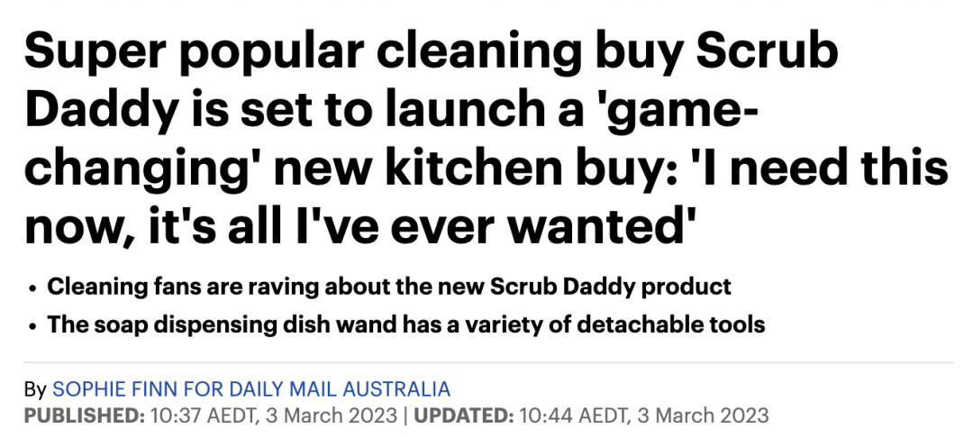 注意啦! 点击 ![]() 蓝字"悉尼辣妈帮"→ 点击右上角“...”→ 点选“设为星标 ★” ,不错过任何精彩! ![]() ![]() ![]() ![]() ![]() ![]() ![]() ![]() ![]() ![]() ![]() ![]() ![]() ![]() ![]() ↑↑已有100000+悉尼妈妈点击关注我们↑↑ ![]() 铛铛铛铛~ 辣妈最最喜欢的洗碗神器又出新了 虽然这次的套装要价$30 但不少人用完都说这是真的值 ![]() 经久耐用 分摊到每一天还是很划算 ![]() 该品牌发布了 Wand Daddy 套件 这是一款带有可拆卸头的皂液洗碗棒 配有五个附件 可清洁各种餐具 ![]() Scrub Daddy 海绵近年来已成为最受欢迎的清洁工具。 它们会根据洗碗时的水温改变质地。它在温水中柔软,适合轻度清洁,而在冷水中坚硬,无需添加刺激性化学物质即可进行强力擦洗。 插播一个消息~ ![]() 辣妈帮已经为 悉尼新手妈妈们建立了超级实用的辣妈帮龙/兔①②/虎①②③/牛①②③宝宝群幼儿园群,小学群,私校群,母婴二手群,新移民交流群等等...想入群的妈妈们,现在开始扫码吧! ![]() ![]() Dish Daddy 棒配有一个 Scrub Daddy 头、两个 Scour Daddy 替换头、一个 Scrub Daddy 或 Mommy 附件和一个 Bristle Brush 附件。 ![]() 可再填充的棒有一个用于洗洁精的安全开口和一个按钮,妈妈们还可以把洗洁精直接滴进去哦! 数百名澳洲妈妈分享了他们使用海绵清洁家中各个地方之前和之后的照片。 看看这效果 谁用了不说好 👇👇👇👇👇👇 ![]() 据说就是因为好擦洗,他家的清洗棉还申请了专利!想用的妈妈可以试试,不管是新产品还是经典款真的超级好用哦! ![]() (^_−)❤ 以上为正文内容 ❤ 辣妈帮客服梦之队 ❤ ![]() ❤ 辣妈帮广告联系:Sydneydida ❤ ![]() 悉尼辣妈帮 澳洲最火妈妈社群平台 ![]() tui 推 jian 荐 re 热 gē 文