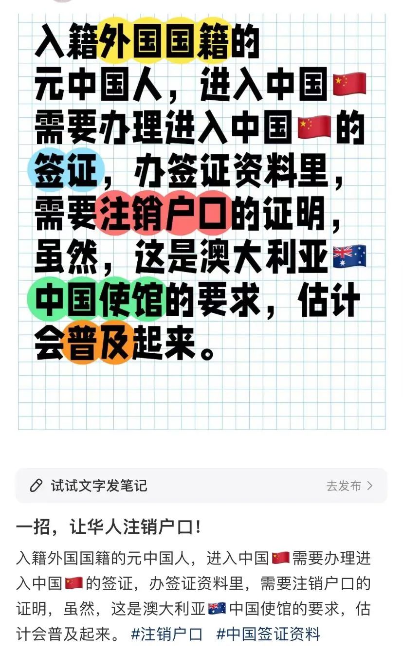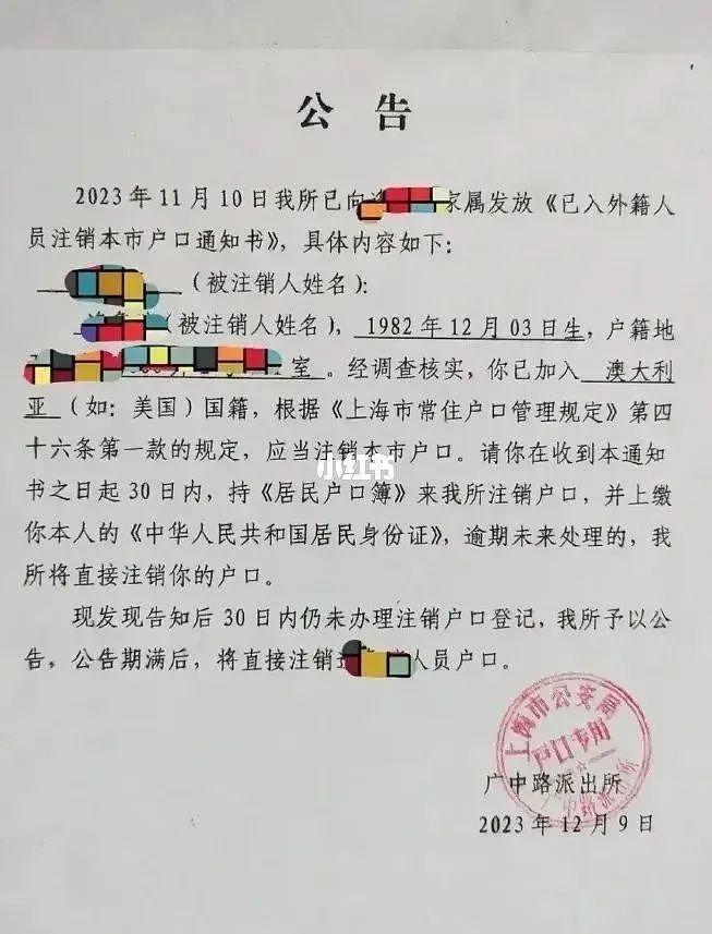 注意啦! 点击 ![]() 蓝字'悉尼辣妈帮'→ 点击右上角“...”→ 点选“设为星标 ★” ,不错过任何精彩! ![]() ![]() ![]() ![]() ![]() ![]() ![]() ![]() ![]() ![]() ![]() ![]() ![]() ![]() ![]() ![]() ![]() ![]() ![]() ↑↑已有100000+悉尼妈妈点击关注我们↑↑ ![]() ![]() 辣妈开场 近日,有澳籍华人爆料 首次申请中国签证 竟被要求提供销户证明! 否则别想走... ![]() 插播一个消息~ ![]() 辣妈帮已经为 悉尼新手妈妈们建立了超级实用的辣妈帮兔/虎/牛/鼠宝宝群幼儿园群,小学群,私校群,母婴二手群,新移民交流群等等...想入群的妈妈们,现在开始扫码吧! ![]() 想要免签回国先销户 NO.01 ![]() 刚刚进行的中国签证出现重磅调整,事关澳洲华人返回中国!小红书上一位澳洲华人发帖,说出了一个大家都没有关注过的事情: 申请中国签证 需要提供国内销户证明! ![]() 按照《中华人民共和国国籍法》第三条及第九条之规定,中华人民共和国不承认中国公民具有双重国籍;定居外国的中国公民自愿加入或取得外国国籍的,即自动丧失中国国籍。 而且妈妈们注意 国籍和户籍一般并不是捆绑在一起的 所以这里就有一个灰色地带,一些澳籍华人来澳洲用澳洲护照,回中国还可以用中国护照和身份证,可以说是“畅通无阻”。 ![]() 一时之间网友又诈了!有不少人都在评论区说起自己的“经历” ![]() 一位在墨尔本办理回国签证的网友也透露,签证办理过程中被索要了销户证明。此外,还有网友提到,即使签证申请时没有被要求注销户籍,但回国后往往会接到强制销户的通知。 户籍注销一旦实施,相关手续会由户口所在地的派出所发布公告,公告发布后即视为销户成功。这个问题之所以备受关注,主要是因为华人们担心户籍注销后,国内的房产、存款、公积金、社保等个人权益可能会受到影响。 ![]() 关于这一政策的具体实施时间,有人认为是10月7日之后才开始执行,但实际上,早在9月就有部分华人收到了强制销户的通知。 这一政策不仅影响了已经入籍的海外华人,也对持有永久居民身份的华人产生了影响。 不过目前大使馆上倒是依旧“官方”,没有任何新的说明! ![]() 感觉现在自己到底会不会“中招”,完全都是“得靠撞大运”... 身份证也不让办了? NO.02 ![]() 其实早在今年初,就有小红书网友晒出一份公告,一瞬间一石激起千层浪。 ![]() 公告由上海市广中路派出所在2023年12月9日发出,内容是告知收件人,该所已经在2023年11月10日向收件人家属发放《已入外籍人员注销本市户口通知书》。 公告显示,该收件人出生在1982年,目前已经加入澳大利亚国籍,派出所通知他,根据《上海市常住户口管理规定》第四十六条第一款规定,应当注销本市户口。并要求收件人在30日内持《居民户口簿》到派出所注销户口,并上缴本人的中国身份证。如果收件人逾期不处理这件事,派出所将直接注销收件人的户口。 虽然这几年关于类似的话题不断,但像上面小红书博主晒出的图片那样,由当地派出所主动找上门要求其注销户籍,并在当事人没有配合的情况下公告注销,从互联网上的信息看,还是非常罕见的案例。 首先妈妈们要明白出国定居的含义: 出国定居的华侨。申请人具有国外的永久居留权,且在该国连续居住两年,两年内合计居住不少于18个月,可被认定为出国定居者; 申请人未获得国外的永久居留权,但已取得连续5年以上的合法居留资格,5年内在该国合计居住不少于30个月,被视为华侨,同样被认定为出国定居者。 虽然《上海市常住户口管理规定》中的第四十六条涵盖了定居海外这个范畴,但这个规定现阶段只针对加入外国国籍的华人。 ![]() PS:这条规矩一直没有被严格实施,很大概率是人手不够,无法认定谁在国外长期定居且有外国绿卡。但如果政府愿意,随时可以以此注销拥有绿卡者的户口,为“两头骑墙”的行为带来更多麻烦。 ![]() 既然提到了户口,辣妈也就不得不在这里提醒一下大家: 虽然现阶段拿到澳洲PR不会让中国户口被注销,但是对一部分人而言,拿了澳洲PR还是会对他们的职业生涯造成不可挽回的影响。 ![]() 其击伤早在2020年的6月份,国内就出台了一项明确规定《公职人员政务处分法》,这其中有一项规定: 违反规定出境或者办理因私出境证件,给予记过或者记大过处分;情节较重的,给予降级或者撤职处分。 违反规定取得外国国籍或者获取境外永久居留资格、长期居留许可的,予以撤职或者开除。 ![]() 这里辣妈给大家科普一下,究竟哪些人属于公职人员呢? 根据官方的解读,公职人员不仅仅是公务员,而是足足包含6个大类! ![]() (一)公务员以及参照公务员法管理的人员; (二)法律、法规授权或者受国家机关依法委托管理公共事务的组织中从事公务的人员; (三)国有企业管理人员; (四)公办的教育、科研、文化、医疗卫生、体育等单位中从事管理的人员; (五)基层群众性自治组织中从事管理的人员; (六)其他依法履行公职的人员。 辣妈这里给大家举个例子吧,之前微博上出现过一个爆料:河北某企业家及公职人员拥有双重国籍!除中国国籍外,还拥有圣基茨和尼维斯联邦国籍... ![]() 1982年出生的孙翔不是一般人。他拥有澳大利亚昆士兰大学工商管理硕士,是新华冶金集团创始人之一并任该集团总裁。 2015年8月,国内媒体转发的《每日邮报在线》一篇新闻稿件显示:由Wealthx.com发布的“2015年全球最富有的20位35岁以下亿万富豪