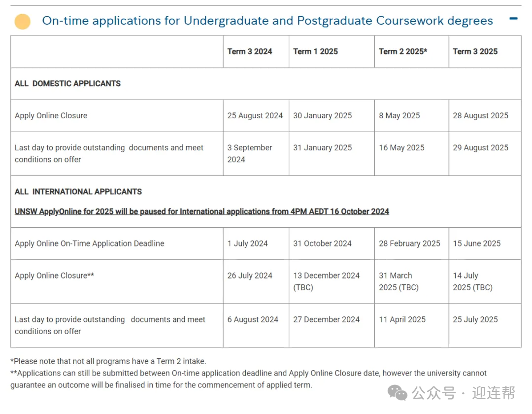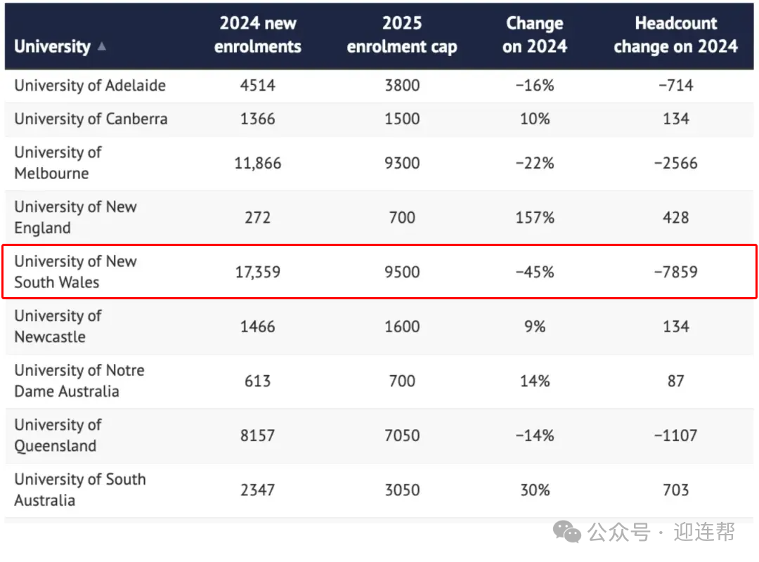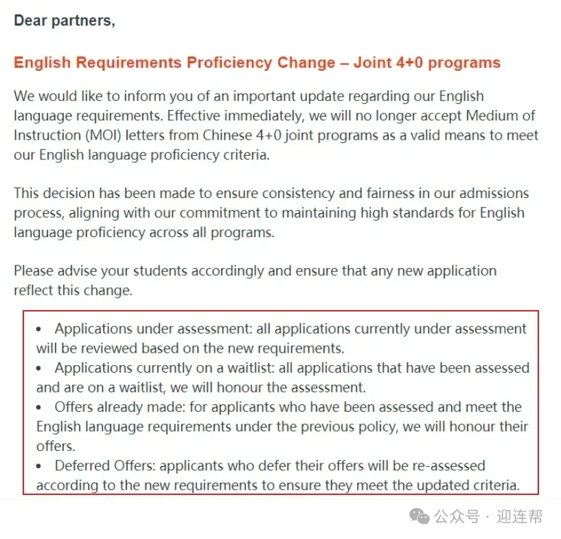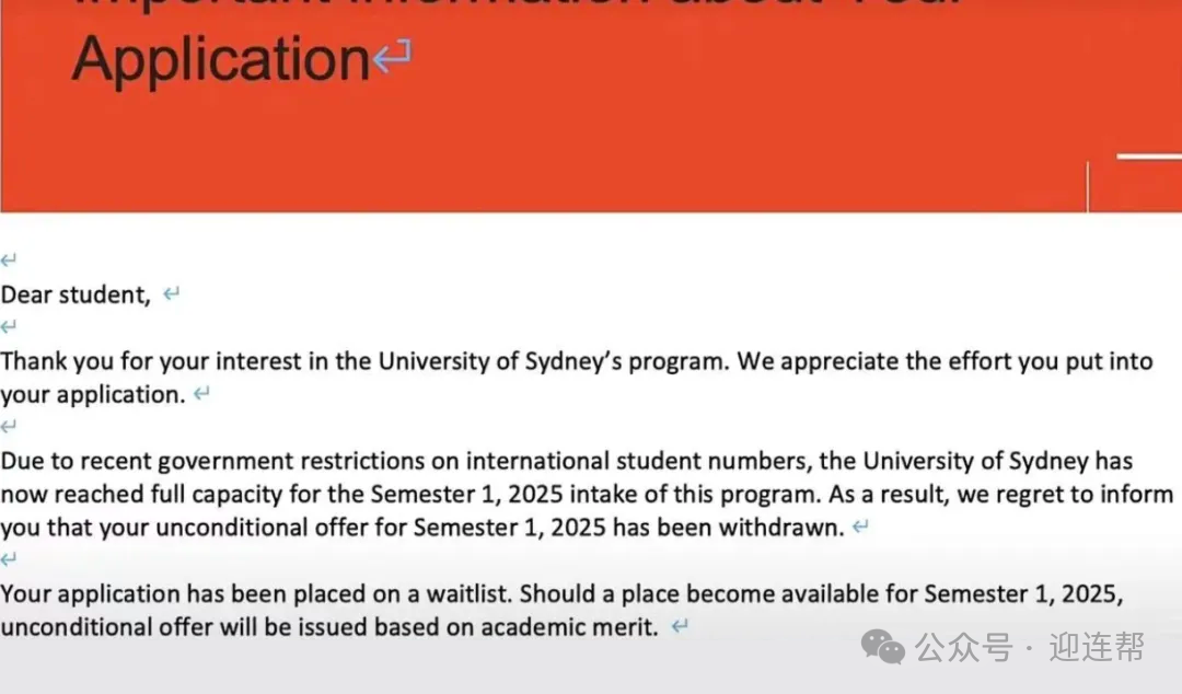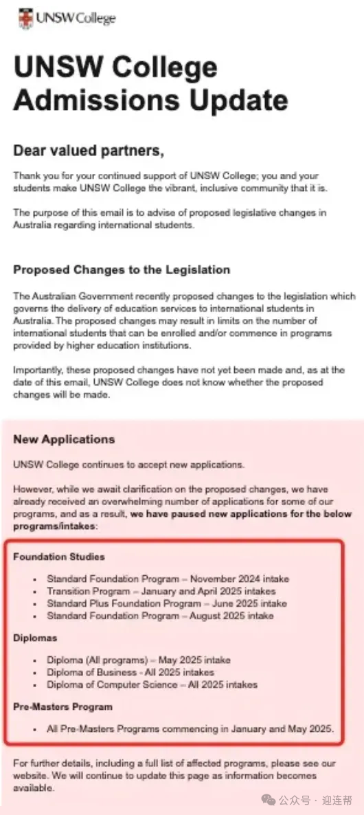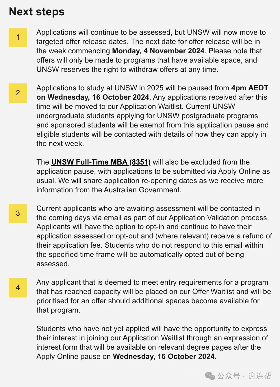 请点击上方"迎连帮"关注更多信息 最近澳洲留学圈隔一段时间就会给个大大的瓜!大型连续剧“限制澳洲国际新生配额”不断出新! 2024年10月8日,新南威尔士大学(UNSW)发布了重要招生公告。 UNSW本硕2025年的所有开学季(T1和T2和T3),将于24年10月16日星期三下午4点(澳大利亚东部夏令时)暂停接受新申请。在此时间之后收到的任何申请都将移至该校申请候补名单。 此次暂停将涉及所有国际学生的申请,暂停项目包括本硕项目申请、Pre-Master(如语言班)、Diploma课程等。以下几类人群将不受影响:🔸 正申请研究生课程的新南威尔士大学本科生; 🔸 受新南威尔士大学资助的学生;🔸 申请全日制MBA (8351) 的学生; 🔸 已收到UNSW offer的学生。 ![]() UNSW的官方文件显示: 1. UNSW现在将采用有针对性的录取通知发布时间。下一个录取通知发布时间将在2024年11月4日星期一开始的那一周内。请注意,录取通知只会发给仍有名额的课程,UNSW保留随时撤销录取通知的权利。 2. 当前UNSW本科生申请UNSW研究生项目以及获得资助的学生将不受此次申请暂停的影响,符合条件的学生将在下周收到如何申请的详细信息。 3. UNSW全日制MBA项目(8351),申请可按惯例通过在线申请提交。学校将在收到澳大利亚政府的更多信息后分享申请重新开放的日期。 4. 正在等待评估的现有申请者将在未来几天通过电子邮件收到UNSW的申请验证流程通知。申请者可以选择继续评估其申请,或选择退出评估并(如适用)获得申请费的退款。未在规定时间内回复该电子邮件的学生将被自动取消评估资格。 5. 任何被认定符合已满员项目入学要求的申请者将被放入UNSW的录取候补名单,并在该项目有额外名额时优先获得录取通知。 尚未申请的学生将有机会通过相关学位页面上的意向表达表格,表达加入UNSW的申请候补名单的兴趣。该表格将在2024年10月16日(星期三)在线申请暂停后开放。 ![]() 为什么会有这种变化 导致这一突然变化很大的原因,毫无疑问,是由于澳大利亚政府最近提议修改管理国际学生教育服务的立法。这项新立法,主要目标就是限制留学生的人数... 据统计,新南威尔士大学(UNSW)2025年配额为9,500人,相较于2024年的17,359人减少了7859人,可以说是八大高校中受到冲击最为严重的学校之一。 ![]() UNSW为了应对这一变化,不得不调整申请流程。 留子们本来以为这项政策大概率就是会导致申请门槛变高,没想到居然还能直接把国际学生的额度砍掉…… 澳洲政府的操作真是越来越迷惑了... 澳洲大学应对政策的最新情况 最近,为了应对澳洲政府的留学生配额上限新政,各个大学可谓是纷纷出手。如今,这一影响正在持续升级!部分澳洲大学甚至开始停止招生、关闭学院、取消offer! 悉尼大学 8月30日起,悉尼大学将不再接受中国4+0联合项目的授课语言证明。 ![]() 一方面,由于留学生设置的配额,许多悉尼大学2025年2月入学的本硕课程已满位!而且,7月入学的不少专业已经不能配语言课程! 来自悉大官方动态更新(统计截止至10月11日),准备2025年2月入学,以下绿色的课程对于悉尼大学在读学生依旧开放申请,但标黄的课程已经满位关闭👇 ![]() 另一方面,近日,悉尼大学向部分已经获得直录通知书的留学生发送了令人意外的邮件——他们的录取通知被撤回,并被列入候补名单。 这一变动的原因在于,悉尼大学2025年第一学期的留学生名额已经达到了上限。对于众多学生而言,这无疑是一个沉重的打击。 ![]() 新南威尔士大学 在此次暂停招生通告发布之前,NSWU就已有几个项目停止了招生:🔸 商科国际大一文凭(所有入学时间)🔸 计算机科学国际大一文凭(所有入学时间)🔸 工程学国际大一文凭(仅5月入学)🔸 媒体与传播国际大一文凭(仅5月入学)🔸 理科国际大一文凭(仅5月入学)🔸 标准预科课程(仅8月入学)🔸 标准Plus预科课程(仅5月入学)🔸 四个月过渡课程(所有入学时间) 🔸 硕士预科课程(1月和5月入学) ![]() 澳大利亚国立大学 澳大利亚国立大学(ANU)宣布将进行大规模重组,目前的7个学院将减少至6个。 ![]() 现有的42个Schools、Centres和Institutes将被保留,其中5个Schools、2个Centres和1个Institute将被转移到新的学院。 ![]() 另有三个学院更名。 ![]() 悉尼科技大学学院 9月5日,悉尼科技大学学院(UTS College)曾就澳大利亚大学和学院拟议的国际学生限额问题向相关人士发送了邮件。邮件中,学院明确表示,由于新政的影响,UTS学院将暂时停止发放录取通知书和录取研究生证书给新生。 PS:这一决定并非针对所有课程。学院特别指出,他们的学术英语课程、UTS预科课程和TNE课程,以及UTS学院斯里兰卡校区并不受此次政府调整的影响。这意味着,对于希望在这些领域深造的学生来说,仍然有机会申请并入学。 ![]() 学生签证限制增加 7月1日起,澳大利亚500类学生签证进行了重大更新。 500类学签申请费用由此前的715澳元(3,467.75元人民币)上涨至1,600澳币(折合人民币约7,760元)!涨幅达到2.25倍。 澳洲境内第一次续签费为1,600澳币,第二次境内续签除了基本的1,600澳元外,还需额外支付700澳元,总费用达到惊人的2,300澳元(折合人民币约11,155元)! 此次费用上涨后,澳大利亚成了申请签证最昂贵的国家! ![]() 另外,澳洲的拒签率变高,学生签证的语言要求也提高了! 这些新的英语语言要求将适用于2024年3月23日及以后提交的所有学生及临时毕业生签证申请。 500学生签证