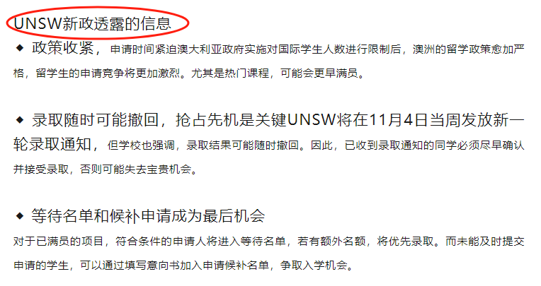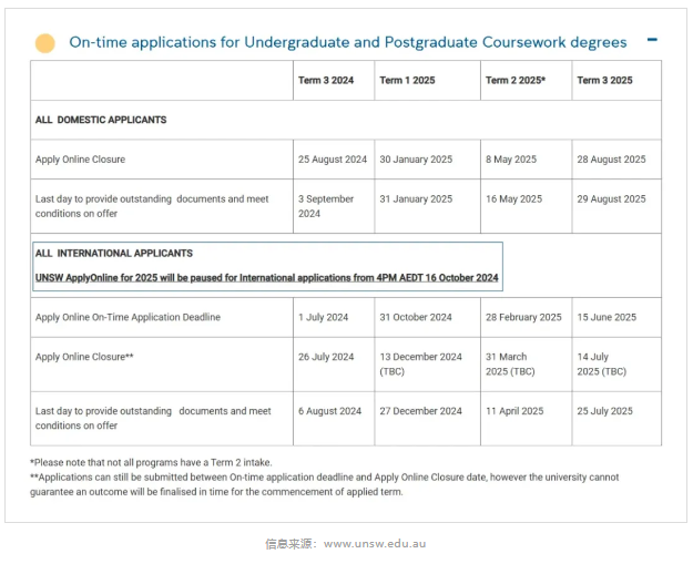 近日,澳大利亚政府宣布了一项新的留学生招生政策,决定从2025年起实行“国家招生上限”。受此影响,各大澳洲大学相继调整了自己的申请政策。 新南威尔士大学「 The University of New South Wales 」 新南威尔士大学(UNSW)于2024年10月8日发布重要公告,宣布2025年的入学申请将于2024年10月16日下午4点起暂停。 随着时间的推移,UNSW这所名校的国际学生录取政策已经逐渐收紧。此次暂停申请将影响所有国际学生,唯有那些已经在UNSW攻读本科并计划直接升读硕士的学生不受影响。 此消息一出,立即引起了广泛关注,特别是那些计划申请澳洲留学的学生。