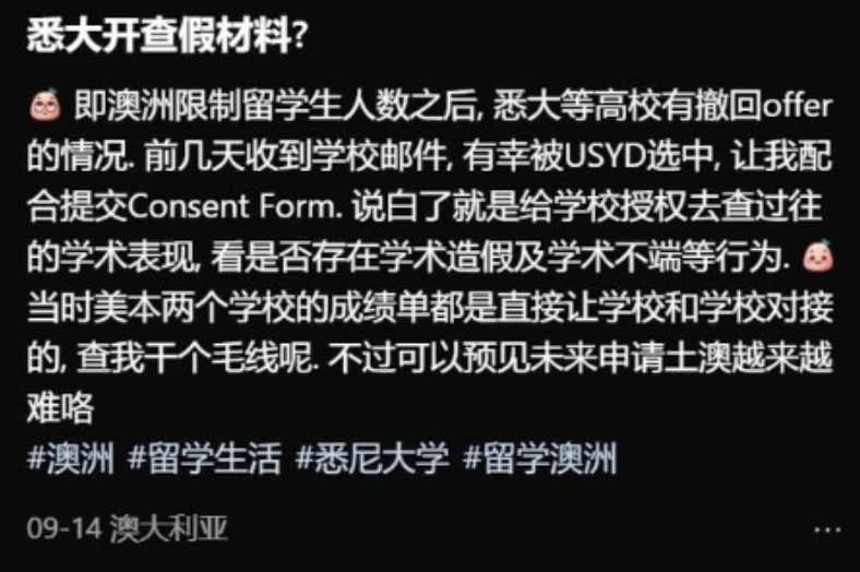 近期,澳大利亚的留学生政策发生了重大变化,这些变化不仅影响了留学生的申请流程,还可能对他们的未来规划产生深远影响。 悉尼大学突然抽查中国留学生材料 悉尼大学近期向大批中国留学生发送了邮件,要求进行文件验证。 ![]() 这一行动代表了学校官方的合规官员,目的是检查学生的真实学术情况,防止伪造材料和学术造假行为。 被抽查的主要是留学生,这在社交媒体上引起了广泛的讨论和不满。一些学生表示,他们已经收到了类似的邮件,并对学校的这一行为表示质疑。 ![]() 悉尼大学的发言人回应称,这种合规检查是常规操作,并与其他澳洲大学的做法一致。 ![]() 学校每学期会抽选约10%的新生出示申请时提交的成绩单和材料,以确保文件的真实性。 留学生政策的变动 澳大利亚政府宣布了一项重要的新政策,从2025年起将实施“国家招生上限”。 这一政策将影响到许多准备申请澳洲大学的留学生。 ![]() 新南威尔士大学(UNSW)和悉尼大学等知名院校的申请流程将受到这一政策的影响。 悉尼大学设定了新的收件政策,部分类别的学生可免于人数限制,包括在校生和最近毕业的学生。 ![]() 这一政策变动使得留学生的申请方式变得更加复杂,学校和学生都需要提前做好准备。 对中国留学生的影响 澳大利亚的留学生政策变动对中国留学生产生了显著影响。 一方面,由于整体国际学生入学人数被限制在27万,中国学生可能会面临更激烈的竞争。 另一方面,政策鼓励较小的地区性机构接收更多国际学生,这可能促使部分中国学生选择这些学校,以避开竞争激烈的大城市知名大学。 ![]() 此外,一些专业(如商科、工程和IT)在中国学生中一直非常受欢迎,这些热门专业的竞争可能会更加激烈。 澳大利亚的留学生政策变动给留学生群体带来了不确定性和挑战。 ![]() 对于中国留学生来说,他们需要更加关注政策变化,灵活调整自己的留学计划,并为可能的激烈竞争做好准备。 同时,澳大利亚的大学和政府也需要考虑如何平衡教育资源的分配,以及如何在保护本地学生利益的同时,继续吸引和培养国际学生。 以上内容转载于澳洲红领君 |