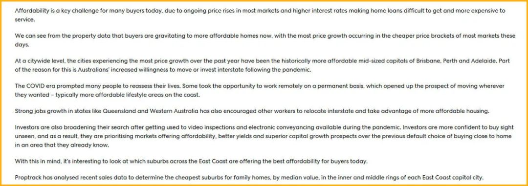 Proptrack近期分析了各首府城市东海岸房产市场的销售数据,以确定内环和中环地区家庭住宅中最经济实惠的郊区。以下是他们的研究结果: