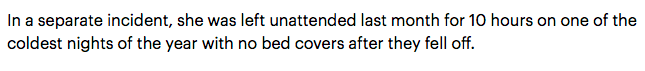 ![]() ![]() 一提到澳洲,很多人一定会对白发苍苍的老人在大草坪、在海边安享晚年的画面留有印象。澳洲,因为它完善的福利制度、优质的老人服务,更是被誉为 “养老的天堂” 澳洲人更是对自己文化里尊老爱幼的品格感到自豪! ![]() 但是,最近澳洲一位女子在养老院安装的监控拍下了一段视频,让不少人倍感心寒,甚至愤怒不已,直言道 别让一颗老鼠屎 坏了一锅粥! ![]() 这名女子正是这间养老院病房内的老人的女儿,这段视频记录下了这个黑心养老院让她极度痛心的一幕: 86岁的妈妈 摔下病床后 在地上呻吟了将近45分钟 无人问津! ![]() ![]() 标题:浸湿在尿液中,浑身脏透和被人攻击: 当女儿在妈妈的老年护理卧室安装一个监控后发现了令人震惊的养老院黑幕。 这让作为女儿的她极度愤怒,一气之下,将这家养老院曝光给了媒体。原来,这家养老院已经不是第一次虐待她的妈妈了!在安装监控之前,养老院的经理曾经两次打电话给她,内容都是 我很抱歉 你的妈妈被护工打了 ![]() 让女儿最为生气的是,在第一次发生护工打人事件后,居然同样的事件并未能避免,反而是愈演愈烈! 第二次打人事件 甚至两次故意暴力击打老人腿部 这让作为女儿的她,万分痛心,无助感、愤怒感油然而生。这才毅然决然在妈妈的病房安装了监控。万万没想到,安装监控后,却看到了更多让人心寒的情况…… ![]() 小悉帅每天第一时间跟大家分享悉尼最新的大事小事,记得关注悉尼生活资讯,接下来那些吃喝玩乐奇闻趣事跑不了的! ▼长按这个二维码▼悉尼新闻抢先知道! ![]() 除了摔下床后无人问津,她的妈妈甚至因为没有人及时的照顾,而被 长时间浸泡在尿液中 以及在冬天的晚上, 没有盖被子长达10多个小时 ![]() 这一幕幕,不仅仅让女儿质疑这家养老院的资质,甚至让很多网友都开始隐隐担心整个养老行业,因为这已经不是第一家被曝光的养老院了。 ![]() 早在去年年末,墨尔本一家黑心养老院,就被曝光了一起惊天丑闻: 一位94岁的老人脚后跟长出了蛆 并因此死亡 ![]() ![]() 已去世的老人的照片 而且,这家养老院的护士长多次阻止全科医生将老人脚部感染的事情告诉老人的子女。根据全科医生的说法 老人脚部感染的问题 已有足足两个月之久 养老院却始终隐瞒实情 ![]() ![]() 老人的女儿在媒体前哭诉,质问养老院的违规、暴力操作 直到子女开始觉得老人的行走姿势变得奇怪,才开始质问养老院的医护人员,由此,才得知老人伤口感染的情况。更让人气愤的是,养老院的医护人员一再强调, 这个伤口 老人一点也不会觉得疼 ![]() 小编看到这里,真是想狠狠揍一顿这些医护人员,根据全科医生的检查,脚部的感染已经发展到了骨头感染,不可能感觉不到疼痛,而且养老院 自始至终都没有给老人提供过止痛片 ![]() 这完完全全就是虐待啊!这位老人生前的最后几个月,都经历了多少痛苦和折磨啊!至今,该家养老院依旧坚持,老人的伤口感染和死亡 并不是医护人员的全部责任 小编真是分分钟想打人!面对这些本已经很虚弱的老人,居然这家黑心的养老院还能做出这么伤天害理的事、说出这么没有担当的话! ![]() 近一年的时间,澳洲的养老院已经不止一次被曝光这样的恶性事件,这也让越来越多的人怀疑养老行业的规范性。例如,之前曝光的 墨尔本某些养老院的饮食 完全不达标 根本没有膳食均衡这一说 老人们的餐饮状况甚至比不上监狱里的罪犯。根据外媒曝光的这些养老院的饭食,先不说是不是健康营养,老人能不能吃饱都是一个问题! ![]() 面对这样接二连三的曝光,政府更是极度关注,但是目前还并没有任何加强监管的条例出台。小编翻遍了所有关于黑心养老院的报道,虽然媒体上的撰文铺天盖地,但是,这些黑心养老院仍然只是极为个别的存在。这些黑心养老院的出现, 无疑是在给整个养老行业 给澳洲政府抹黑 其实,只要认准澳洲政府授权的各大养老基金组织以及旗下的正规养老机构,就可以完全避免这些黑心之地。不过,虽然只是极个别的养老院出现了这样极度恶劣的情况,但也希望政府能马上有所作为,尽快规范护工的教育与培训、规范养老院的运营。这样才是保证整个养老行业健康发展、重拾消费者信心的唯一方法! ![]() Perfect Lover 澳洲最大华人婚恋交友平台 如果单身的你在澳洲苦苦找不到幸福,那你一定错过了Perfect Lover,因为这是你找到爱情的最“完美”捷径。 这里有最庞大的澳洲华人单身男女数据库 这里有最专业的红娘一对一服务 这里有最高效的配对机制 这里有最丰富的交友活动 最最重要的是: 这里有最高的脱单率! ![]() Perfect Lover公众号 每周都会推荐心动男生/女生 关注Perfect Lover公众号 给自己一次心动的机会! ![]() 如果你真心想要寻找心中的“Perfect Lover” 如果你正好在 澳洲或新西兰 如果你 年龄在20-50岁 那就先从Perfect Lover开始! 扫码添加小红娘微信 ![]() 说出你的要求和条件 为你匹配Perfect Lover! (本文图片来自网络) ![]() ![]() ![]() ![]() ![]() ![]() ![]() 告诉大家一个了解悉尼生活资讯的小诀窍。现在只要点亮一个小星星🌟,每天就能在第一时间看到各种最新鲜的资讯!悉尼哪里打折💰,哪里有好玩的活动🎉,哪里的餐厅最实惠🍰,哪里有同乡聚会👬,还有悉尼各种政策福利、隐藏技能,全都知道啦! ![]() 悉尼人都爱看的 悉尼生活资讯 ![]() 惋惜!澳洲最长寿110岁老人突然离世!如