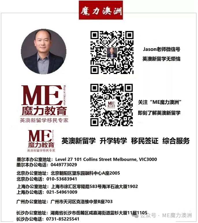 我是魔力教育Jason老师,专注于英澳留学和移民,以真实案例分享英澳留学移民干货。如果你想了解更多的留学和移民知识,请点赞和收藏哦!有任何英澳留学问题都可以关注魔力教育官号,或者扫描下面我的咨询微信二维码提问。