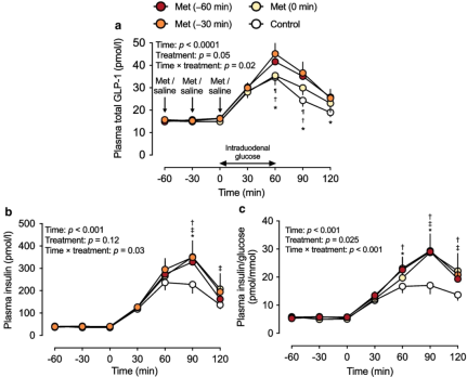 ![]() 二甲双胍是2型糖尿病的基石用药,降糖疗效确切。目前,临床实践中建议二甲双胍随餐服用,以最大限度减少胃肠道不良反应。 近期,一项发表在Diabetologia杂志上的澳大利亚研究则提示,餐前服用二甲双胍的餐后降糖效果优于随餐服用,且并未增加胃肠道症状。 该研究是一项双盲、随机、交叉设计研究,纳入16例接受固定剂量二甲双胍单药治疗(500~2000 mg/d,≥3个月)、血糖控制良好的2型糖尿病患者。所有患者均无明显胃肠道症状。 采用十二指肠内灌注葡萄糖时及灌注前30 min、60 min模拟用餐时、用餐前30min和餐前60分钟,分别在三个时间点服用二甲双胍,并设未给予二甲双胍的对照组。 研究发现,在降低餐后血糖方面,用餐前30 min和餐前60 min服用二甲双胍比随餐服用更有效,且餐前60 min服药的效果更好。 ![]() 图1 各组餐后血糖的变化 本研究还发现,用餐后胰高糖素样肽-1(GLP-1)才会出现升高,在刺激GLP-1分泌方面,与随餐服用二甲双胍相比,餐前30 min和餐前60 min服用二甲双胍的血浆总GLP-1水平均较高,且两者没有差异。 ![]() 图2 各组GLP-1和胰岛素水平的变化 研究还发现,无论随餐还是餐前服用二甲双胍,均能改善血浆胰岛素水平和胰岛素/葡萄糖比值,不影响胰岛素敏感性。 在安全性方面,无论随餐还是餐前服用二甲双胍,胃肠道耐受性均良好。 来源:Impact of the timing of metformin administration on glycaemic and glucagon-like peptide-1 responses to intraduodenal glucose infusion in type 2 diabetes: a double-blind, randomised, placebo-controlled, crossover study. Diabetologia, 2024, 67(7): 1260-1270. 转载: 请标明“中国循环杂志” 本刊所有文章全部免费阅读和下载!登录中国循环杂志官网(www.chinacirculation.org)“期刊目录”或小程序(中国循环杂志+),可免费阅读和下载本刊所有文章!关于非法网站冒用我刊名义进行征稿的特别提醒 近期我们发现一些网站冒用“中国循环杂志”名义征稿,并承诺“职称论文权威快速发表”。 我刊郑重提醒各位作者,向《中国循环杂志》投稿,一定要登录中国循环杂志官方网站:http://www.chinacirculation.org进入“作者投稿”,在“作者投稿管理平台”中投稿。 本刊联系电话:010-68331974 订阅点击:http://chinacirculation.org/WX/home/zxdy |