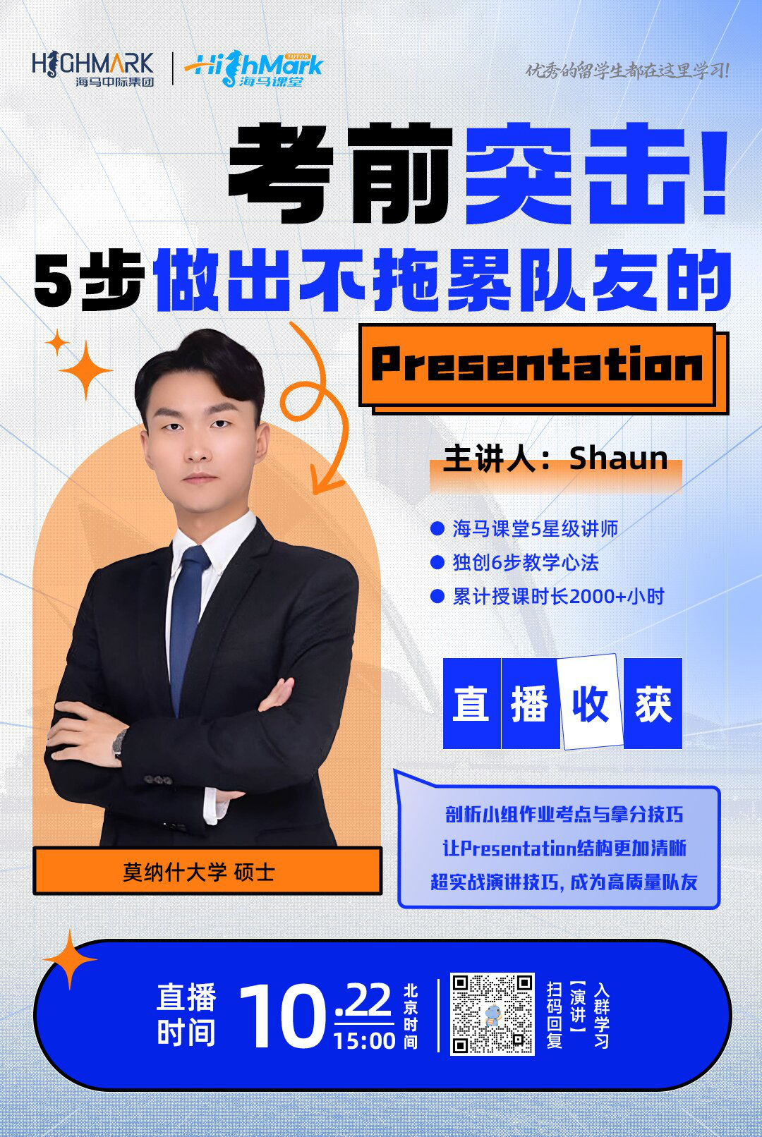 ![]() 近期澳洲各个大学陆续进入Final周,一边赶Due一边复习的痛苦谁懂啊!😣 尤其是论文多的专业,每到Final都分身乏术,考试论文两面为难! 但是难归难,可千万别走弯路!澳洲现在对学术诚信的审查越来越严格,一不下心就可能葬送整个留学生涯!趁现在距离考试还有一些时间,建议提前做好复习计划且严格执行! 澳洲留学生考前常见问题 HighMarkTutor ⭕专业基础薄弱,知识点掌握不牢固,习题不会做 ⭕自己复习效率低,没有计划,缺乏自制力 ⭕对考试没信心,内耗,担心挂科,复习不进去 ⭕论文作业太多,没有充足时间复习备考 这些问题看似很多,其实总结起来只有两条:“时间紧,任务重;底子薄,效率低”。解决方案也是针对这两条。 PART 01 针对时间紧、任务重的问题: 可以有选择性的延期考试/迟交论文或者撤课,从而争取更多复习时间,减轻学习负担。 澳洲各个大学的政策都不相同,但大部分都是通过考前SC(特殊情况申请)来实现。每个学校的政策/要求各有侧重,具体可以关注自己学校官网或者问问学长学姐。 实在担心申请不通过,也可以咨询专业机构,让专业的人来做专业的事,省心省力。 PART 02 针对底子薄、效率低的问题: 自律能力稍好的同学可以制定个整体的复习计划,细节到什么时间复习什么知识点,搭建整体的知识框架查缺补漏,用最短的时间去提升最能提升的地方。 澳洲留学时复习小贴士 1、提前规划,按时打卡:不要等到最后一刻,提前一周开始逐步复习,记录学习进度保持学习的连续性。 2、分块学习,着眼脚下:将复习内容分成小块,每天专注于一个主题,避免畏难心理。 3、重视Past Paper:多做往年真题,熟悉基本题型;重做以前的错题,确保不再犯同样的错误。 4、合理休息、劳逸结合:复习也要劳逸结合,保证充足的睡眠,提高学习效率。 如果是自律能力稍弱的同学,建议寻找专业的辅导机构,量身制定复习计划,论文考试两手抓!巧用“他律”代替“自律”,严格执行计划,高效率复习! 如果你正面临着复习效率低、论文作业多、past paper一知半解、考前焦虑等问题,那么海马课堂的这三场直播,你千万不能错过! 财会考试真题解析、Presentation精准拿分、经济学考试易错点拆解,这些刚需我们都会讲到,另外更有院校福利礼包等你领取!! 三场直播内容如下 HighMarkTutor 1 财会考试真题! 手把手教你不再配错资产负债表 你将有以下收获: 1、看懂资产负债表,表内关键点全面剖析 2、真题实战,帮你缕清解题思路,搞定同类型题 3、学长吐血整理!精准拿捏数字背后的考点逻辑 ![]() 2 考前突击! 5步做出不拖累队友的Presentation 你将有以下收获: 剖析小组作业考点与拿分技巧 精准5步法,让Presentation结构更清晰 超实战演讲技巧,助你成为人类高质量队友 ![]() 3 期末经济学倒计时! 真题解析、考点锁定,一次搞定! 你将有以下收获: 1、经济学科考试中常见的难点、易错点 2、真题拆解,教你精准避雷技巧 3、科学模拟考试时间分配 ![]() 是不是已经心动了? 10月21/22/23日三场直播千万别错过 真题实战,全面解析 精准锁定考点,给你拿高分的底气! 扫描下方二维码即可0元领取免费课程另外更有院校福利礼包等你领取!! ![]() 赢在开学季 关注海马课堂 收获满满干货 |