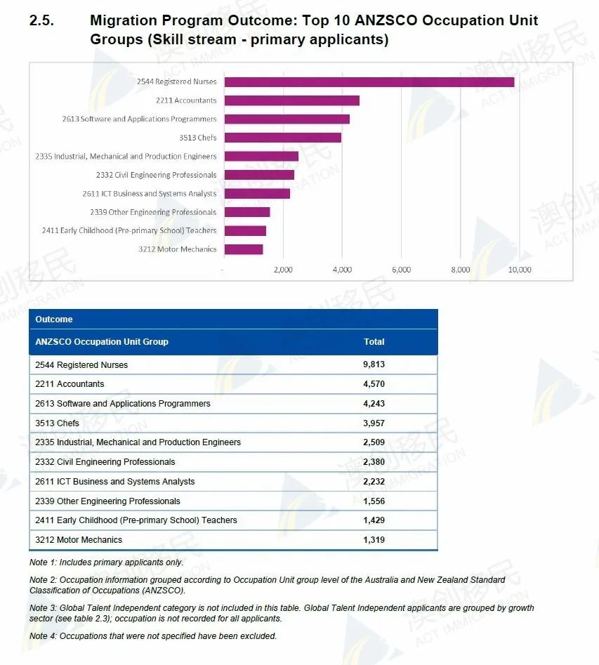 ![]() 从澳洲移民来源国来看,23-24财年下签最多的国家前三位分别为印度,中国和菲律宾。 就细分签证类别而言,澳洲技术移民类签证获批人数最多的国家是印度,印度申请者占比高达33%,共获批45820人;中国位列第二,共获批11,520人;尼泊尔则以10891人获批紧随其后。 中国还是澳洲家庭移民类签证获批人数最多的国家,共10,284人,几乎与技术移民获批人数持平。 ![]() 再看下广大申请人最关心的技术移民的获批职业统计。 根据上财年的数据,目前澳洲移民职业列表中,注册护士的下签数量遥遥领先,共有9,813人,其中有5,278人是通过189独立技术移民获得。 排名第二的会计,共有4,570人,主要通过偏远地区技术移民担保签证获得;而排名第四的主厨则主要通过186雇主担保类签证获得。 下签排名前10名的职业为: -- 注册护士:9,813人; -- 会计:4,570人; -- 软件和应用程序员:4,243人; -- 主厨:3,957人; -- 工业、机械和生产工程师:2,509人; -- 土木工程专业人员:2,380人; -- ICT业务和系统分析师:2,232人; -- 其他工程专业人员:1,556人; -- 幼儿(学前)教师:1,429人; -- 电机机械师:1,319人; 189独立技术移民获批排名前10位的职业 ![]() 州担保技术移民签证,获批排名前10位的职业 ![]() 偏远地区州担保技术移民签证,获批排名前10位的职业 ![]() 186雇主担保移民签证,获批排名前10位的职业 ![]() 值得一提是,23-24财年澳洲雇主担保有近5万个新申请,而批签率创近年来新高。虽然全部配额用尽但仍然有少量积压,可见雇主担保的受欢迎程度。 本财年雇主担保类签证仍属于澳洲移民局的最优先审理类别,符合条件的朋友可以抓住机会进行申请。 ![]() 如果您想了解海外留学和移民更多政策信息,欢迎联系我们,移民律师将1v1为您答疑解惑,定制方案。 ![]() 关注澳创 澳创移民留学,作为一家30年移民和留学经验的老牌咨询公司,海内外多城市设有分支,自有6位持牌移民律师,处理过众多签证相关的疑难问题。 自成立以来,澳创有着完美的成功率,已经帮助无数中国企业和个人顺利移民海外,我们的专业团队将以最全面、最专业的移民法律服务,助您全家成功移民。 如果您想了解海外移民留学的更多信息,欢迎拨打免费咨询电话 4000563966,或 长按下方二维码添加 澳创移民律师助理(微信手机同号)详细咨询。 ![]() 澳创律师助理1 18510580923 ![]() 澳创律师助理2 18510589563 ![]() ![]()