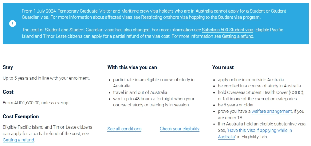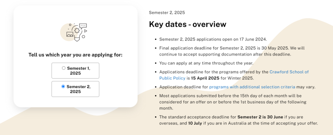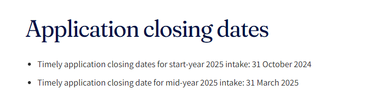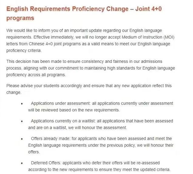 点击蓝字,关注我们![]() 这周,新南威尔士大学已经于10月16日关闭2025所有开学季的申请通道。 ![]() UNSW的官方文件显示: 1. UNSW现在将采用有针对性的录取通知发布时间。下一个录取通知发布时间将在2024年11月4日星期一开始的那一周内。请注意,录取通知只会发给仍有名额的课程,UNSW保留随时撤销录取通知的权利。 2. 当前UNSW本科生申请UNSW研究生项目以及获得资助的学生将不受此次申请暂停的影响。 3. UNSW全日制MBA项目(8351),申请可按惯例通过在线申请提交。学校将在收到澳大利亚政府的更多信息后分享申请重新开放的日期。 4. 正在等待评估的现有申请者将在未来几天通过电子邮件收到UNSW的申请验证流程通知。申请者可以选择继续评估其申请,或选择退出评估并(如适用)获得申请费的退款。未在规定时间内回复该电子邮件的学生将被自动取消评估资格。 5. 任何被认定符合已满员项目入学要求的申请者将被放入UNSW的录取候补名单,并在该项目有额外名额时优先获得录取通知。 ![]() 导致这一突然变化很大的原因,是由于澳大利亚政府最近提议修改管理国际学生教育服务的立法。这项新立法,主要目标就是限制留学生的人数 下面罗列了该政策对澳洲八大的学生配额影响。 ![]() ![]() 墨尔本大学 ![]() 墨尔本大学也在官网上提供了2025年申请截止时间。 2月入学截止时间:2024年10月31日 7月入学截止时间:2025年3月31日 需要特别注意的是,该校的教育,法律,商业,医学等热门专业,由于申请竞争激烈,可能会更早截止。如果有意向申请这些专业,一定要提前确认具体的截止时间,以免错过最佳申请时间。 ![]() 悉尼大学 ![]() 从8月30日起,悉尼大学将不再接受来自中国 4+0 合作办学项目的教学语言(MOI)证明作为满足其英语语言能力标准的有效方式。 其中不受影响的: 目前在候补名单上的申请:所有已通过评估并在候补名单上的申请,学校将履行评估结果。 已发出的录取通知:对于已通过评估并符合之前政策中英语语言要求的申请人,学校将履行其录取通知。 ![]() 2月入学截止时间:2024年12月1日 7月入学截止时间:2025年5月15日 另外,由于国际生设置的配额,许多悉大2025年2月入学的本硕课程已满位!而且,7月入学的不少专业已经不能配语言课程! ![]() 澳大利亚国立大学 ![]() 2025年semester1截止日期2024年12月31日 2025年semester2截止日期2025年5月30日 公共政策学院截止日期为2025年4月15日 澳大利亚国立大学(ANU)宣布将进行大规模重组,目前的7个学院将减少至6个。 ![]() ![]() 昆士兰大学 ![]() 2月入学截止时间:2024年11月30日 7月入学截止时间:2025年5月31日 另外需注意: 不同课程可能会有不同的截止日期。UQ College的英语课程,包括桥梁英语(BE)课程的申请、接受offer和支付学费的截止日期是课程开始日期前4周。 莫纳什大学,西澳大学和阿德莱德大学没有公布具体的截止时间,招满为止,先到先得! 此外,已经收到uncon offer的同学也要尽快决定是否接受,以免学校配额满了撤回offer! 签证新政 ![]() 如果你正在申请澳大利亚学生签证(500类别),请注意以下事项:
