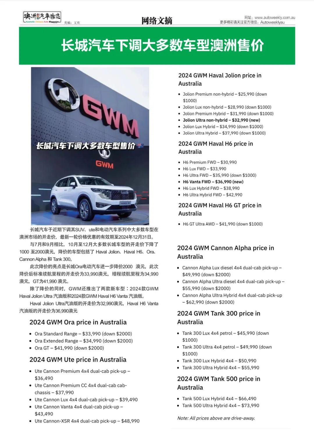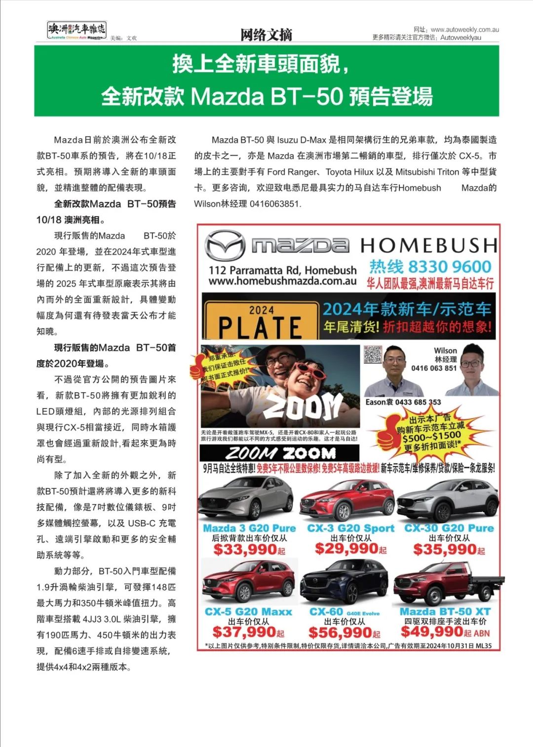 ![]() 长按识别二维码或者点击左下角"阅读原文"即可手机在线阅读本期《澳洲汽车杂志》 ![]() 杂志介绍 《澳洲汽车杂志》创刊于2003年,是目前澳洲唯一中文汽车专业周刊。每周平均10余个新车品牌,多家车行给您选择,汽车保养维修配件贷款一应俱全,周末悉尼华人商圈免费派发,更多一手澳洲车市资讯及独家原创车评,尽在www.autoweekly.com.au澳洲汽车网及微信公众号:autoweeklyau。 每周电子版免费邮件及微信推送,欢迎关注订阅。 省钱购车热线:0433160315。 本期文章 出道既颠峰!颜值够靓,配置能打, 价格美丽! 长安深蓝Deepal S07澳洲上市!中国电动车群殴特斯拉毛豆外! 本期杂志在线阅读链接地址:www.autoweekly.com.au/journals/1124上期杂志在线阅读链接地址:www.autoweekly.com.au/journals/1123 本期详细页 ![]() ![]() ![]() ![]() ![]() ![]() ![]() ![]() ![]() ![]() ![]() ![]() ![]() ![]() ![]() ![]() ![]() ![]() ![]() ![]() ![]() ![]() ![]() ![]() ![]() ![]() ![]() ![]() ![]() ![]() ![]() ![]() 相关文章 本周第1123期《澳洲汽车杂志》本周第1122期《澳洲汽车杂志》本周第1121期《澳洲汽车杂志》 更多杂志请上澳洲汽车网www.autoweekly.com.au 重要信息 华人销售精英全家福 购车咨询问答专栏《澳洲汽车杂志》免费派发点 |
