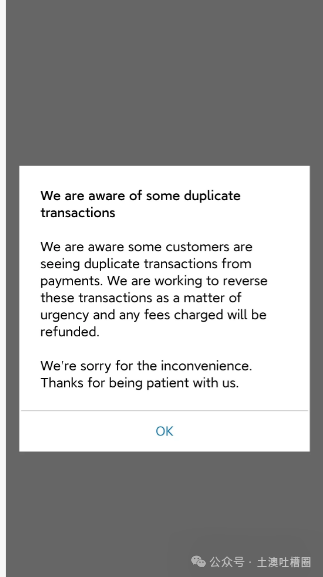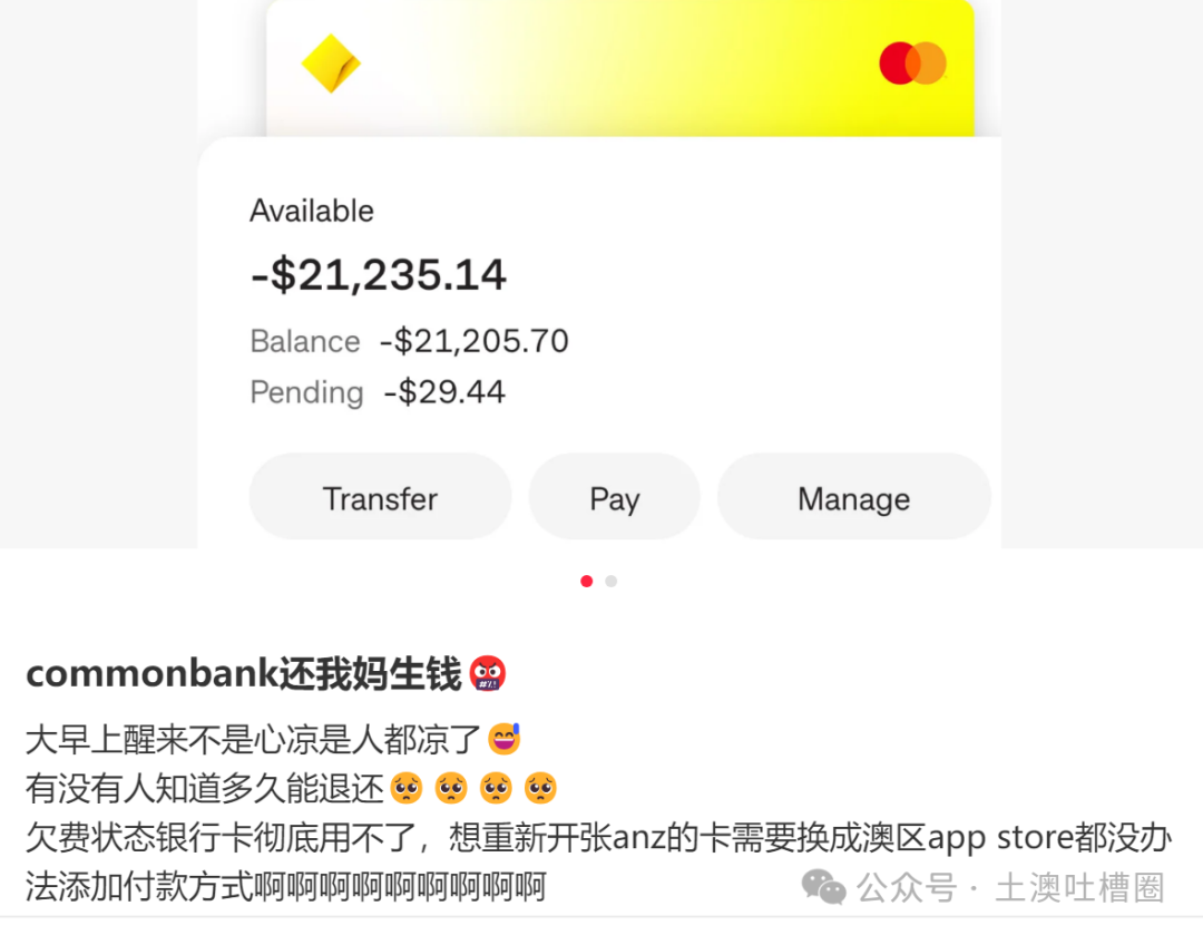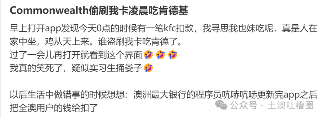 今天,一大批澳洲留子破产了。 澳洲最大的银行commonwealth bank出问题了。 有的小哥被偷吃了一顿肯德基。 ![]() 一大群人被重复扣费 ![]() 还有更可怜的,直接交了2次学费 ![]() 真成负翁了。 ![]() 之后,commonwealth发通报:表示发现了这个问题,会尽快解决,把多扣的钱退还。 ![]() 但是这一下子,一大堆人表示,自己以后不敢用commonwealth了, 自己的钱被扣没了。 ![]() -- END -- 公众号后台回复“吃瓜群”,即可进入土澳吃瓜群! 公众号后台回复 "二手租房群",即可进入澳洲二手租房群! 更多有趣内容关注土澳吐槽圈 投稿,吐槽,商务合作联系圈圈君(quanquanjun3): ![]() 往期精彩内容:墨尔本deakin普信男,立牌坊人前一套背后一套。 |避雷悉尼老外恶心男:爱钓鱼,抠门,不单身还出去约会。小姐姐冒着大雨赴约被鸽子还被拉黑!|悉尼小哥被美女留学生搭讪后被骗1500刀。| 恶心!墨大master猥琐男避雷,此人混迹于墨尔本各种酒局,趁女生喝醉进行猥亵!|吐槽悉尼某剧本店老板,商业大鳄竟欠2000块拖2个月。|土澳版KCl公主:阿姨天天自诩公主|USYD不刷牙806粉丝网红男:穿fk逛专柜,软饭硬吃,跨年转0.1巨款。| 悉大PM土木系渣男脚踏两船,富二代学霸人设实则tt还aa,被发现后威胁辱骂受害 |