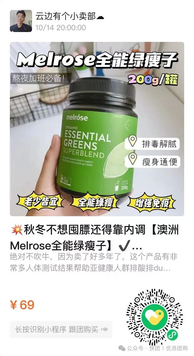 【澳洲Melrose全能绿瘦子】 团购秒杀:69 (直接图一扫码下单即可) (如遇二维码过期,请联系团长) ![]() 💥秋冬不想囤膘还得靠内调【澳洲Melrose全能绿瘦子】✔️真正的肉眼可见排湿气,吃一瓶小肚子明显小了!🎈排肠毒、排肝毒,提高免疫力,改善亚健康 ✅有机大麦草+有机小麦草 ✅有机螺旋藻+有机小球藻 ⭕️排除毒素+清理宿便 ⭕️平衡人体胆固醇👌 ⭕️调节血压+平衡血糖 ⭐爱吃夜宵,总爱长痘痘⭐想减肥,想控制体重 味道比青汁好喝,坚持每天早上喝一杯✊ 快递 团管理订单管理商品核销 昨天 发布 跟团中814天10小时37分50秒后结束 绝对不吹牛,因为卖了好多年了,这个产品有非常多人体测试结果 帮助亚健康人群排酸排du ‼️亚健康人群服用绿瘦子7-14天的不同表现:一天拉多次大便,银镯子戴上变漆黑,脚散发酸臭味,体重暴涨然后再跌,长痘然后慢慢消痘,便秘到不便秘,各种不同的排酸反应,等身体各方面恢复正常,就是排酸第一阶段结束🔚 吃绿瘦子,让你感受“不一样的重生” |