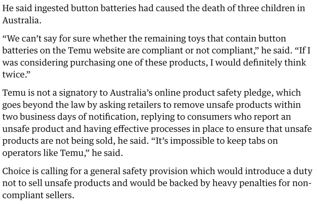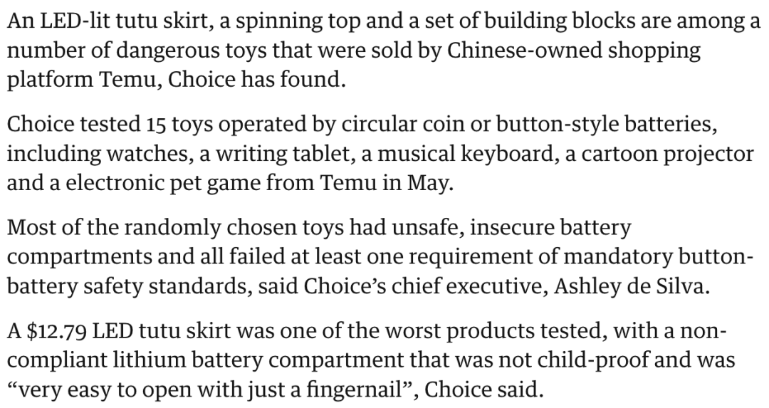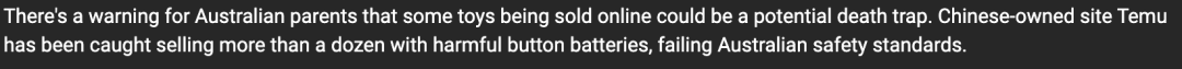 ![]() (探索扫码探索捷尼赛思GV 80) ![]() (立即扫码,抢先开启萧邦奢华之旅) 本文来源参考:theconversation/网络 编辑:星尚澳洲编辑组 近期,澳洲几款常见的胃病药物被曝光存在潜在健康风险! 根据澳洲媒体报道,一些药物如质子泵抑制剂(PPI),包括Nexium、Losec、Somac等,已被指可能与胃癌和肾功能衰竭相关。 ![]() 澳大利亚消费者权益组织还发布了一项重要警告,指出15款Temu产品不符合澳洲安全标准被召回,部分电池供电玩具在安全设计上存在问题,可能对儿童构成潜在的伤害风险! ![]() 集体诉讼调查展开被曝光的药物主要用于缓解胃酸反流和胃灼热等症状,但长期服用后,可能引发严重的健康问题。 ![]() 一些长期服药的患者报告了肾脏功能下降和其他并发症。针对这些药物的集体诉讼已经展开,预计将有约10万名澳洲人参与调查。 总部位于墨尔本的律师事务所Shine Lawyers对这些药物的安全性提出了质疑,并发起了相关的集体诉讼调查。 ![]() 许多长期服用质子泵抑制剂的患者被诊断出患有胃癌或肾功能不全,这些药物在澳洲市场上已有20多年的历史。 在2021年,这类药物的处方量超过了2300万,显示出其广泛的使用率。然而,越来越多的证据表明,长期服用这些药物可能会增加患癌的风险。 ![]() 实例:患者的亲身经历一位名为Donna Johnstone的澳洲女子在服用Somac药物长达20年后,发现自己肾功能严重下降。 尽管药物在缓解胃酸反流方面效果显著,但她的肾脏健康却逐渐恶化。 ![]() 在常规体检中,她的肾功能已经降至19%,面临透析的风险。医生明确表示,这一问题是由于长期服用胃药所致。 ![]() Johnstone的经历揭示了长期依赖药物的潜在风险。她也加入了集体诉讼,呼吁更多人关注这些药物的健康隐患。 ![]() 胃药使用的隐忧专家指出,长期使用PPI药物一年,患癌风险可能增加4倍,而三年以上的使用将增加7倍。 ![]() 尽管这些药物短期内有效,但长期抑制胃酸分泌会带来严重的健康风险,尤其是对老年人而言,可能导致营养不良、感染风险增加,甚至增加痴呆症的可能性。 ![]() 为了降低这些风险,医生建议在用药的同时,采取健康的生活方式和饮食习惯。避免长期依赖药物,通过合理的生活方式调整也能缓解许多消化系统疾病的症状。 ![]() 替代治疗方案除了PPI药物,市场上还有其他替代药物可用于治疗胃灼热和胃反流等问题。 ![]() 例如,非处方的抗酸药如Gaviscon和Mylanta能够中和胃酸,而处方药如Nizatidine和Famotidine则通过减少胃酸产生来起作用。 ![]() 然而,药物并非唯一的解决方案。通过调整饮食习惯、减轻体重和避免在睡前进食,许多患者也能有效缓解症状。 ![]() 纽扣电池玩具存在隐患除此之外,Temu出售的15款由纽扣电池(button cell)供电的玩具均存在安全隐患! ![]() 其中包括手表、书写板、音乐键盘、卡通投影仪、电子宠物游戏、LED灯芭蕾舞短裙、陀螺、积木、TutuSkirt、LED 茶灯、书写板等。 ![]() 在一次安全测试中,澳大利亚消费者权益保护组织发现,市面上多款使用纽扣电池供电的玩具存在电池仓设计不合规的情况,孩子可以轻松打开电池仓。 ![]() 这意味着这些玩具可能会让儿童暴露在严重的危险中,这些产品包括手表、电子宠物游戏和LED灯等。 ![]() 纽扣电池被认为对儿童尤其危险,因为误吞纽扣电池可能导致严重伤害甚至危及生命。根据测试结果,所有这些玩具均未达到澳大利亚纽扣电池安全法规的要求。 ![]() ![]() 法规保护不容忽视自2022年起,澳大利亚政府已经要求所有纽扣电池供电的产品必须配备儿童防护电池仓,并附有清晰的安全警告标签。 ![]() 该法规的目的是减少儿童误吞电池的风险。然而,消费者组织指出,部分商家在这方面的执行力度不足,仍然存在不合规产品在市场上流通。 ![]() 提倡更严格的安全措施面对这些发现,消费者权益组织呼吁澳大利亚政府加强对不安全产品的管控,禁止销售不符合安全标准的商品,并对不合规的商家施以更严厉的处罚。 ![]() 这不仅是为了保障儿童的安全,也是为了提升消费者的信任感。 ![]() 企业回应与整改针对消费者组织的测试结果,相关企业迅速做出回应,并主动移除了部分不合规的产品。 ![]() 这一举动表明,商家已经意识到问题的严重性,并采取措施确保未来不会再发生类似情况。 ![]() 然而,消费者在选购玩具时,仍需保持警惕,优先选择经过安全认证的产品。 ![]() 今日话题讨论对此,你有什么看法? 欢迎留言评论~ - END - 欢迎将文章分享到朋友圈 本文来源:https://theconversation.com/which-gut-drugs-might-end-up-in-a-lawsuit-are-there-really-links-with-cancer-and-kidney-disease-should-i-stop-taking-them-238766 https://www.theguardian.com/australia-news/2024/oct/14/battery-operated-items-from-temu-tested-by-choice-fail-australian-safety-standards |