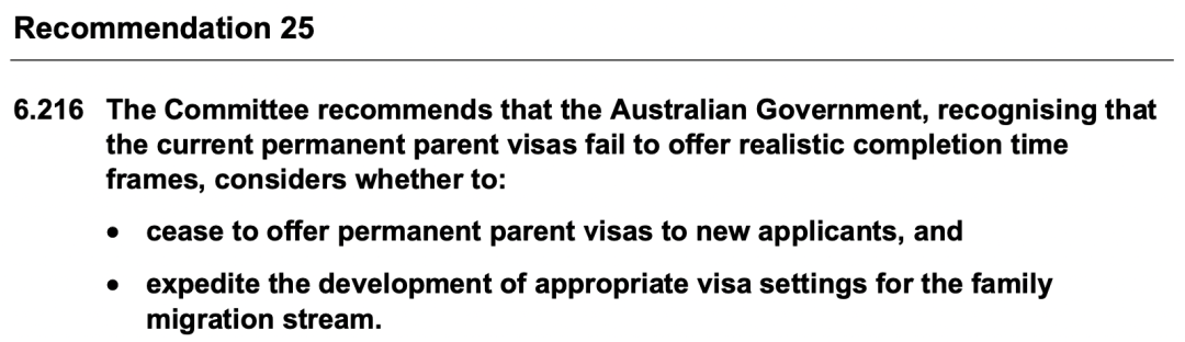 ![]() ![]() 近日,澳洲移民专家发布了一份重磅报告——《Migration, Pathway to Nation Building Report》。该报告长达454页,分为12个章节,其中涵盖内容包括:技术移民、雇主担保、父母移民、移民系统改革、职业清单、职业评估、留学签证、打工度假签证、以及移民入境后的服务。 该报告中最引起争论一条建议,即建议25:委员会建议澳大利亚政府认识到当前的永久父母签证未能提供切合实际的审理时间框架,并考虑是否: