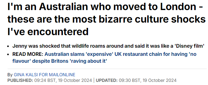 ![]() //前言// 华人从澳洲移居英国以后, 发现两国差异太大, 澳洲很多都领先, 唯独这一点! 移居英国以后 发现大不同 澳洲华人移居英国伦敦数个月,在社交媒体上发文,感受到了明确的文化差异。 英国和澳洲虽然都是英联邦国家,但两者之间的差异非常巨大。 ![]() 图片来源:daily mail 悉尼华人Jenny Tian已经搬到伦敦数个月时间,在这段时间里,她全面的对比了在英国和在澳洲的生活。 ![]() video: https://mp.weixin.qq.com/mp/readtemplate?t=pages/video_player_tmpl&action=mpvideo&auto=0&vid=wxv_3687783539996327938 她表示,在地铁、道路,烤面包机和购物中心这几方面,英国和澳洲差别很大。 首先就是地铁环境让她很有感触,原本以为是国际超级大都市,伦敦的发达程度可能会比悉尼领先一些,但是真正体验过才发现,伦敦的地铁实在太脏了,因为隧道理由太多煤灰,每次都会吸入很多,鼻涕都变黑了... ![]() 图片来源:daily mail 她感觉非常不适应,但伦敦人对此早就习以为常了。 不过这个说法遭到了一些伦敦居民的之一,表示从来没有遇到过这么夸张的情况。 也有一些人表示,伦敦地铁确实比较脏,但这是因为伦敦地铁发达但又非常古老,所以每次刹车都会产生很多粉尘。 ![]() 图片来源:daily mail 此外,Jenny也对地铁座位的肮脏程度感到震惊。她声称自己有次穿了一条浅色牛仔裤出门,回到家时才意识到自己坐在一个布满灰尘的座位上,裤子上沾满黑色的污渍。 她吐槽: “ 我现在注意到地铁上的每个人都穿着深色裤子。这些地道的伦敦人太聪明了,他们知道该怎么应对!我听说过伦敦很脏,但没想到座椅上真有灰尘。 ” 第二个巨大差异是烤面包机或者说是面包片。 ![]() 图片来源:daily mail Jenny Tian表示英国超市里出售的一些面包片太大,无法放进烤面包机,导致部分面包烤不透感到困惑。 面包片可能改变不了了,但烤面包机应该足以匹配这个尺寸才对。她很直白的吐槽:不知道是哪个神经病给出的残破设计! 有网友解释称: “因为很多烤面包机是在另一个面包尺寸较小的国家制造的,买个英国制造的烤面包机就行了。” ![]() ![]() 图片来源:daily mail 最后一个让她不舒服的就是伦敦的道路,作为超级大都市,伦敦道路的狭窄让人意想不到。很多地方只有单车道,很难想象伦敦司机平日里是如何忍受这样的基础建设的。 对此也有网友回应: 道路非常狭窄是因为城市本身,伦敦有大约2000年的历史,最初是按供马车通行设计的,现在要改变以减少交通是不可能的。 ![]() ![]() 图片来源:daily mail 她也表示,英国也有一些很领先澳洲的,比如说澳洲的超商品牌就让她很满意。 因为伦敦的超市品牌多种多样,这也确保了市场商品的价格竞争更加良性。 她还特意提到了Westfield。 尽管Westfield购物中心在英澳两地都有,但Jenny声称,澳洲的Westfield通常是学生逃学和在停车场亲热的地方,英国的Westfield则魅力十足且体面。 最后 从很多方面,澳洲可能都比伦敦领先,特别是在环境和基础设施方面。 但是超商方面,伦敦确实领先澳洲! Reference https://www.dailymail.co.uk/femail/article-13960943/australian-moved-london-bizarre-culture-shocks.html “澳微”视频号上线了! 半分钟纵览奇闻异事、新闻资讯、美食美景, 还有各种你不知道的澳洲冷知识 移民 要闻 ☆澳配偶移民签证或新增英语要求!审理时间更长,花费更多! ☆史上最全!澳投资移民最新变革细节出炉:配额大增,审理时间缩短! ☆新州491大赦!无需本地工作即可获邀,会计等职业起死回生 ☆疫情之下这个签证开绿灯!独占一半配额,海外也下签,入境不受限 更多好文 点击图片即可查看 ![]() ![]() ![]() ![]() ![]() ![]() ![]() |