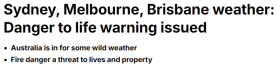 《每日邮报》10月21日报道,澳洲未来几天将迎来非常恶劣的天气,极其干燥的气团和南风增加了中部和东部地区的火灾风险,生命和财产都可能受到威胁。![]() 据weatherzone.com.au.透露,本周晚些时候,一个强大的高压系统将带来非常干燥的空气和强南风。 “干燥的空气加上强风,增加了新州、维州部分地区、新州内陆、昆州和北领地内陆的火灾风险。” 预计周四至周六受到的影响最大,周四预计是风速最高的一天,可达45至55公里/时。 这将导致大部分地区的露点温度(大气湿度的关键指标)降至0°C以下,进而导致空气非常干燥。 这意味着灌木丛将变得更加易燃,使火灾更容易点燃和迅速蔓延。 Weatherzone表示:“如果发生火灾,阵风可能会加剧火势蔓延。余烬会被吹到相当远的地方,导致可能在大火发生之前就点燃的局部火灾。” ![]() (图片来源:《每日邮报》) “这种危险的组合不仅会增加大规模火灾爆发的风险,且对生命、财产和自然生态系统构成了威胁。” 建议住在危险地区的人们保持警惕,定期查看天气预报,以保护自己和财产安全。 气象局在西澳的Exmouth Gulf Coast和南澳西海岸发布了极端火险预警,当地人被警告启动他们的草场大火生存计划。 气象局表示,在西澳,“周一炎热干燥的天气将与午后海风相结合”。 而在南澳,周一下午和晚上将出现“炎热干燥的北风到西北风,周一下午和晚上将出现凉爽、强烈的南风到西南风”。 |