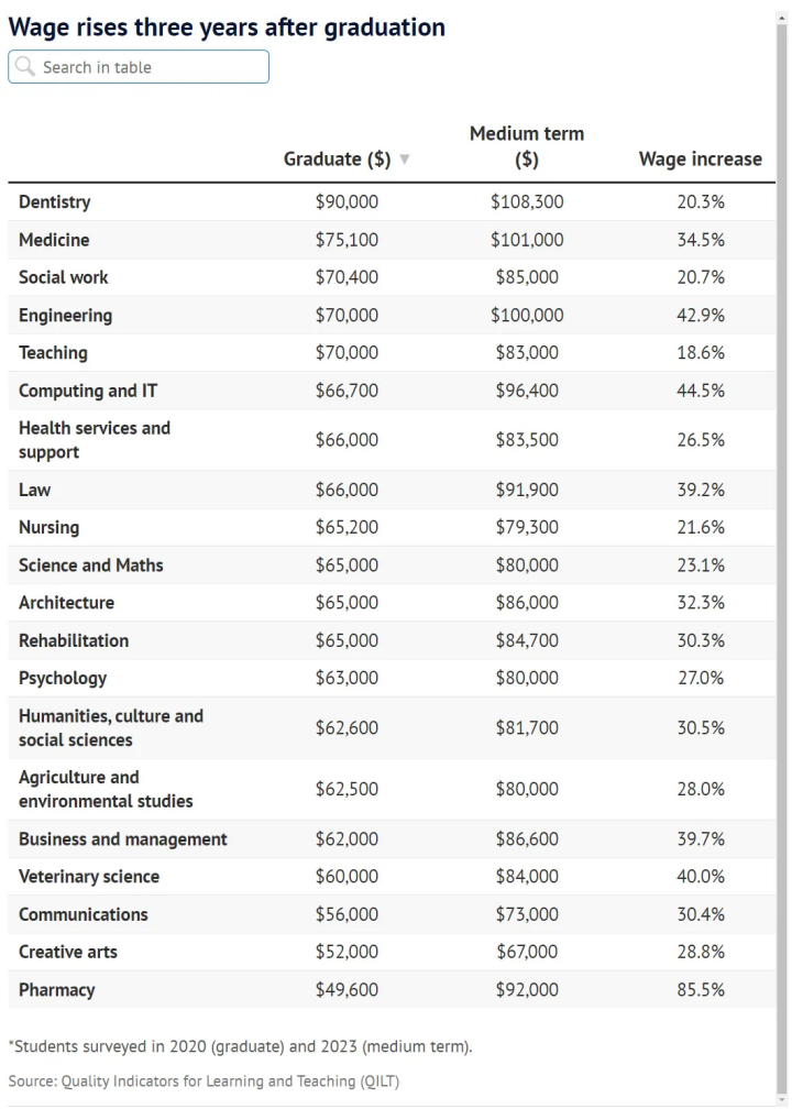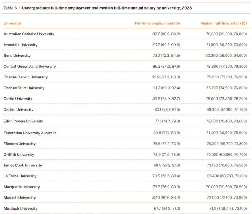 ![]() 而另据《悉尼先驱晨报》近日报道,澳洲很多收取最高额学费的专业,其学生在毕业后却成了收入最低的人,这也加剧了公众对高等教育成果的担忧。 ![]() ![]() 这些数据对计划前往澳洲留学、毕业后回国或留在当地就业的学生来说,可以参考一下。 澳洲大学毕业生薪资 01 各学历阶段毕业生薪资 根据QILT最新发布的数据,2023年澳洲大学不同学习阶段毕业生的薪资中位数如下: ● 本科毕业生 71,000 澳元(约合人民币 34 万) ● 授课型研究生 96,600 澳元(约合人民币 47 万) ● 研究型研究生 10,0000 澳元(约合人民币 48 万) ![]() 02 各专业领域薪资 具体到专业领域,2023年毕业生薪资最高的五个专业分别为: ● 牙医(94,000 澳元) ● 医学(85,000 澳元) ● 社会工作(77,300 澳元) ● 工程(75,000 澳元) ● 师范教育(75,000 澳元)相对而言,农业与环境科学、药学、创意艺术、传播学、旅游与酒店管理等专业的毕业生薪资是最低的。 ![]() ![]() 对于已毕业三年的学生(即2020年毕业),收入最高的专业领域包括: ● 牙科(108,300 澳元) ● 医学(101,000 澳元) ● 工程(100,000 万 澳元) ● 计算机与 IT(96,400 澳元) ● 药学(92,000 澳元) ![]() (来源:悉尼先驱晨报)03 大学薪资排名从各大学的情况来看,2023年毕业生平均薪资水平最高的前十所澳洲大学分别是:1)南昆士兰大学(80,000 澳元)2)中央昆士兰大学(78,300澳元)3)塔斯马尼亚大学(78,000 澳元)4)查尔斯特大学(75,700 澳元)5)新英格兰大学(75,300 澳元)6)查尔斯·达尔文大学(75,000 澳元)7)新南威尔士大学(75,000 澳元)8)科廷大学(75,000 澳元)9)詹姆斯·库克大学(73,100 澳元)10)蒙纳士大学(73,000 澳元) 这些大学的毕业生薪资均高于全澳大学毕业生的平均薪资(71,000澳元)。由此可见,许多中国学生青睐的“澳洲八大”中,只有新南威尔士大学、蒙纳士大学和澳洲国立大学的毕业生薪资高于平均水平。 ![]() ![]() ![]() 澳洲大学毕业生就业率 01 各阶段毕业生就业率数据显示,2023年澳洲大学不同阶段毕业生的就业率如下:●本科毕业生:88.9%●授课型研究生:91.4%●研究型研究生:93.5% 整体来看,研究生的就业率普遍高于本科生。 ![]() 02 各专业领域就业率在就业率方面,各专业存在显著差异。药学、康复和医学是就业率最高的三大专业,全职就业率均超过95%。兽医科学、师范教育和工程的全职就业率也很高,均在90%左右。而全职就业率最低的几个专业包括创意艺术(54%)、传播学(64.9%)、科学与数学(69.8%)以及人文社会科学(71.8%)。 ![]() ![]() 03 大学就业率排名具体到各大学,2023年本科毕业生全职就业率最高的前十所大学包括:1)阿文代尔大学(97.7%)2)查尔斯特大学(91.2 %)3)詹姆斯·库克大学(89.5%)4)新英格兰大学(89.2%)5)澳洲圣母大学(86.5%)6)中央昆士兰大学(86.2%)7)查尔斯·达尔文大学(85.9%)8)堪培拉大学(85.3%)9)南昆士兰大学(85.1%)10)纽卡斯尔大学(84.6%)相对而言,维多利亚大学(64.5%)、墨尔本大学(67.7%)、莫道克大学(67.7%)、托伦斯大学(68.0%)、西澳大学(69.6%)以及皇家墨尔本理工大学(71.8%)则为全澳本科毕业生就业率最低的几所大学。 ![]() 根据以上情况,大家不难发现,中国学生非常热衷申请的澳洲八大中,只有新南威尔士大学、蒙纳士大学、澳洲国立大学的毕业生薪资处于平均薪资水平之上。 如果您想进一步了解澳洲留学资讯,申请澳洲留学可以后台私信小澳哦~ ------------------------------2025年第十三届澳洲精英中学交流会 时间:2025年3月15日 地点:广州市天河区天河路208号粤海喜来登酒店 招生对象:有意申读澳洲精英中小学的学生 开展前我们还送面试辅导,掌握澳洲中学面试技巧,增加孩子录取几率哦~ 今年特别邀请澳洲公立学校,学校校长与招生代表亲临指点 零距离了解澳洲精英中学的价值与优势、学校选择、监护安排、住宿选择(学校住宿或寄宿家庭)、AEAS考试等 家长/学生直接与澳洲中学校长或国际部负责人面对面交流 21+所澳洲名校现场面试招生,表现优异者可直接拿Offer 提早规划留学,让孩子赢在起跑线上 汇聚领馆官员、海外顶尖中学校方代表 扫码预约吧! ![]() AEAS官方广州指定授课机构 广州精英教育培训中心有限公司是岭南控股广之旅“精英出国”旗下的专业从事出国语言培训服务的机构。公司自成立至今取得了澳洲AEAS官方备考课程华南地区授权授课机构,帮助10000+学员帮助取得理想的分数,成功留学。 我们的优势:· 华南地区首家&广州唯一 AEAS 授权培训机构· AEAS官方培训优秀教师,科学的课程设置及个性化的学习方案,同时配有资深专属助教课后跟进答疑· 连续 10 届 AEAS 澳洲精英中学交流会华南地区独家承办机构 数百所澳洲顶尖私立中小学一手合作资源,数据化精准分析· 澳洲精英男校 Knox Grammar, 澳洲精英女校 PLC Melbourne 华南独家合作机构 专注澳洲中小学申请 20 多年,与各校招生负责人建立长久互信的合作关系· 拥有多名从事澳洲留学申请十余年的资深顾问与文案老师,量身定制专属留学方案 20+年细耕低龄留学市场,丰富的低龄学签/陪读签证申请经验 ![]() ![]() End ![]() ●3分钟看懂澳洲低龄留学为什么成为“香饽饽”?●除了高考,澳洲预科低门槛也能就读名校!●妈呀,买了学区房,也不能入学?墨尔本多所公校被迫实施招生限制!●澳洲中小学顶尖私立The Scots College申请指南 对 AEAS 课程 以及 ![]() |