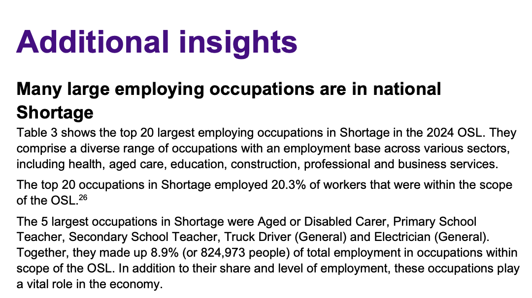 ![]() ![]() 24小时内,澳洲官方机构Jobs and Skills Australia (JSA) 发布了最新的2024年职业短缺报告,揭示了当前澳洲劳动力市场的紧缺情况。 这份报告对计划移民澳洲的申请者具有重要参考价值,尤其是对于那些希望通过技术移民、雇主担保签证等途径进入澳洲的人士。 ![]() 图片来源:JSA官方资料 报告不仅详细列举了澳洲最新的紧缺移民职业,还分析了当前移民政策的走向,为有移民计划的申请者提供了极具参考意义的信息。 2024年的职业短缺清单中,共列出了20个紧缺职业,其中老年/残疾人护理、中小学教师、卡车司机、电工和儿童保育员位列前五。 20个职业名单如下:老年护理、小学教师、中学教师、卡车司机、电工、儿童保育员、销售和营销经理、木匠、厨师、汽车修理工、律师、装配工、建筑项目经理、软件工程师、理发师、全科医生、项目建筑师、开发程序员、金属工匠、个人护理助理。 今年的紧缺职业还是非常多的,有许多华人没有料到的职业也上榜了。似乎拿PR的希望更大了。 ![]() 图片来源:JSA官方资料 这些职业目前占据了澳洲劳动力市场中8.9%的就业岗位,共计约82万人。这意味着,这些行业不仅对澳洲经济至关重要,而且其劳动力的短缺问题相当严重。 ![]() 图片来源:JSA官方资料 热门岗位一览 对于希望通过技术移民途径申请澳洲永久居留(PR)的申请者来说,这些职业无疑是最值得关注的移民方向。 特别是护理和幼教等职业,由于澳洲人口老龄化趋势明显,护理类职位需求预计在未来几年内将持续增加。 1 ![]() 护理 ![]() 图片来源:JSA官方资料 2 ![]() 幼教 ![]() 图片来源:JSA官方资料 3 ![]() 社工 而社工在多个州也都出现了较高的短缺状况,这对于那些有相关从业背景的申请者而言,是一个良好的移民机会。 ![]() 图片来源:JSA官方资料 4 ![]() 建筑 此外,建筑项目经理、电工、开发程序员等高技能职业也继续维持了短缺状态,尤其是由于澳洲政府大量基础设施项目的积压,建筑行业短期内对技术工人的需求尤为迫切。 ![]() 图片来源:JSA官方资料 JSA报告指出,建筑类相关职业的短缺压力从2021年到2024年持续上升,预计在未来几年仍将是移民的热门领域。 ![]() 图片来源:JSA官方资料 人口老龄化和技术革命成关键原因 JSA的报告指出,职业短缺的原因是多方面的,首要原因是人口老龄化。随着澳洲社会老年人口比例不断上升,对医疗服务、老年护理等行业的需求也大幅增加。 ![]() 这直接导致了老年护理、健康护理等职位的空缺率居高不下。在这种情况下,护理行业成为移民者进入澳洲的重要领域之一。 其次,技术进步与自动化的迅速发展也影响了澳洲劳动力市场的结构。虽然自动化减少了部分低技能工种的需求,但同时增加了对高技能工种的需求,如软件工程师、开发程序员和电工等技术性岗位。 ![]() 这些高技能职业对从业者的专业要求较高,但同样为具备相应资格的申请者提供了更多的就业和移民机会。 教育行业的紧缺也是由于培训时间长以及劳动力供给不足。报告中提到,教师行业的短缺现象已持续多年,尤其是偏远地区和乡村学校,对幼教和中小学教师的需求尤为明显。 ![]() 对于申请者而言,如果具备相应的教学资质,并通过了澳洲相关的资格认证,这无疑为他们提供了一个移民澳洲的理想渠道。 ![]() 图片来源:JSA官方资料 移民签证与职业短缺的紧密联系 对于希望通过技术移民进入澳洲的申请者而言,职业短缺清单不仅仅是一个就业参考,更是技术移民的一个重要依据。 虽然189和190类签证是常见的独立技术移民途径,但482临时技术短缺签证和186雇主担保签证同样成为很多申请者的选择。 ![]() 例如,建筑类职业、电工、汽车修理工等虽然在职业清单上名列前茅,但移民难度主要集中在语言要求和职业评估方面。 对于已经具备相关资质且语言水平较高的申请者,这些职业的紧缺为申请482或186签证提供了绝佳机会。 ![]() 此外,JSA的报告特别指出,老年护理、小学教师等职业也在多个州和领地出现短缺,这进一步扩大了获得移民邀请的可能性。 另一方面,报告中提到的厨师、律师等职业尽管也在清单中,但在一些州的邀请数据相对较少,甚至被新南威尔士州移出了州担保的名单。 ![]() 因此,尽管这些职业被列为紧缺职业,但对于希望通过这些职业途径获得移民邀请的申请者来说,可能需要考虑更多的签证类别和州担保策略。 职业短缺问题将长期持续 根据JSA的预测,职业短缺的问题将在未来几年内继续存在,尤其是在建筑、健康和社会援助等领域。 ![]() 由于人口老龄化以及基础设施建设需求的持续增长,相关行业的紧缺将难以在短期内缓解。 对于申请者而言,如果能抓住这些紧缺岗位带来的移民机会,未来进入澳洲将更加容易。 ![]() 同时,JSA的报告也提醒申请者,尽管职业短缺清单提供了一个参考,但不同的移民签证类别、州担保政策以及行业需求的变化,都需要申请者灵活应对。 选择一个需求长期稳定的行业,尤其是建筑、健康护理和教育领域,将显著提高申请技术移民或雇主担保签证的成功率。 ![]() ADLO 移民要闻 ►【ADLO全球移民最新资讯】2024年十月 | 第3期 ►【澳达利欧海外】致力于以最专业的服务帮助国内家庭规划海外身份|提供专业移民投资服务 ►澳洲国家创新人才签证NIV年底推出,将是未来企业家新机遇 ►澳大利亚退税季你需要知道