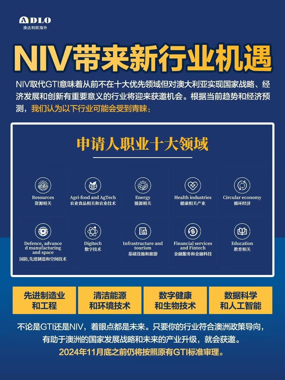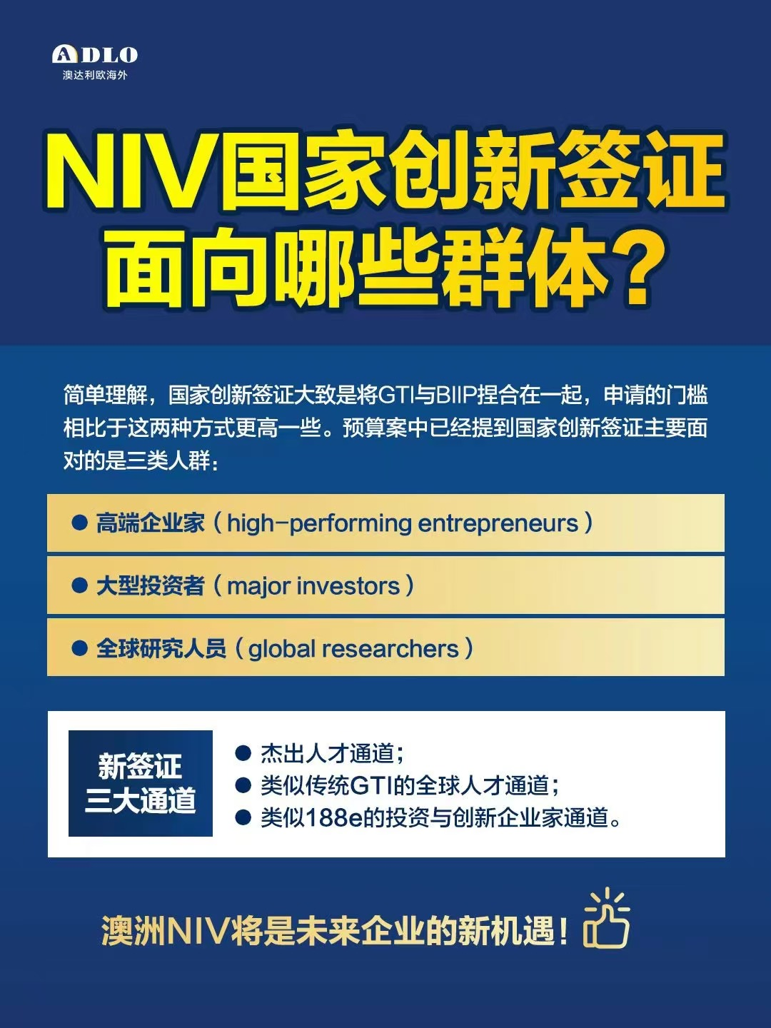 ![]() ![]() 在经济全球化的大背景下,澳大利亚以其政治稳定、经济发展迅速和文化多样性成为全球投资者和企业家的首选地。 国家创新签证作为一种专门设计来吸引全球顶尖人才和投资的计划,不仅为您提供了在澳大利亚进行商业和投资活动的入场券,还为您和您的家人提供了一条通往永久居留的捷径。 ![]() 01 什么是国家创新签证? NIV签证专为世界级的企业家、大额投资者和顶尖研究人员设计。与GTI签证一样,NIV提供了直通车式的永久居民路径,但在选拔和审批过程中将加大对创新能力和经济贡献的重视。 ![]() 对于已经递交了GTI签证申请的人才,政府已明确他们的申请不会受到政策变动的影响,将继续按照提交时的标准进行审理。这为申请人提供了必要的保障,确保无缝过渡。 ![]() 02 国家创新签证亮点 永久居留通道: 延续全球人才签证的优势,一步到位拿到澳洲身份,享受澳洲的优质教育,社会福利。 专注关键领域: 重点支持技术、先进制造、可再生能源和健康科学等关键行业,引领未来发展。 申请流程优化: 简化申请步骤,提升效率,内政部将提供全程支持,确保每一位申请者都能享受到高效、公正的服务 03 为什么现在是理想的准备时间? 竞争尚未达到高峰: 作为全新推出的签证类别,早期申请者将面对更少的竞争,从而增加获批的机会。 详细准备申请材料: 从现在起到2024年底的这段时间,是潜在申请者准备全面、精确申请材料的最佳时机。详实的准备可以显著提升申请的成功率。 把握政策转换的先机: 随着BIIP计划的关闭和全球人才签证配额的调整,新签证为企业家和投资者提供了前所未有的机会,尤其是那些在科技创新和未来导向领域有所建树的人士。 ![]() 04 创新签证细节 投资者签证 — 高端投资的优先通道: 澳大利亚投资者签证是国家创新签证的一个重要组成部分,专为希望在澳大利亚进行大额投资的高净值个人设计。通过此签证,投资者可以选择在多个关键领域进行资金注入,如: 科技创新、医疗保健、基础设施建设等,这些领域对澳大利亚的长远发展至关重要。此外,该签证类别还为投资者提供了一条通向永久居留权的路径,这一点对于寻求长期稳定性的投资者来说具有极大吸引力。 商业签证 — 企业家的理想选择: 对于那些计划在澳大利亚创办新企业或扩展现有业务的企业家,国家创新签证提供了一条绿色通道。这一签证类别特别支持那些能够为澳大利亚经济增加价值、创造就业机会、并引入新的技术或业务模式的创新型企业。签证申请者将获得在澳大利亚运营企业的权利,并可依此逐步满足永久居留的条件。 ![]() 永久居留权 — 稳定的未来承诺: 通过国家创新签证,成功的申请者不仅能在澳大利亚投资和创业,更有机会获得永久居留权。这一点对于那些希望在澳大利亚安家立业的申请者极具吸引力。 永久居留权意味着申请者及其家庭能享受到澳大利亚完善的公共服务体系,包括世界级的医疗服务、高质量的教育资源和广泛的社会保障。 投资机会 — 推动经济新动力: 国家创新签证鼓励投资者在澳大利亚的多个关键行业中寻找和把握投资机会。 无论是支持具有高成长潜力的初创企业,还是投资于需要资金注入以实现技术创新的成熟行业,投资者都能在这片热土上实现自己的商业梦想,并为澳大利亚的经济增长贡献自己的力量。 ![]() 国家创新签证为您在澳大利亚的投资和商业活动提供了无限可能。不论您是经验丰富的投资者,寻找新机遇的企业家,还是希望在澳大利亚拓展业务的公司,此签证都能为您的事业开辟新的道路。 现在就行动起来,利用国家创新签证在澳大利亚开启您的新篇章吧!如需进一步了解详情或有任何签证相关的疑问,欢迎随时联系ADLO专业团队。我们在此等待,帮助您实现在澳大利亚的成功梦想。 ![]() ![]() ADLO 移民要闻 ►【ADLO全球移民最新资讯】2024年十月 | 第2期 ►【澳达利欧海外】致力于以最专业的服务帮助国内家庭规划海外身份|提供专业移民投资服务 ►澳洲国家创新人才签证NIV年底推出,将是未来企业家新机遇 ►澳大利亚退税季你需要知道的事! · 干货指南 · ![]() 移民澳洲 | 条件?流程?材料有什么? ![]() 入籍澳洲 | 八大好处你知道吗? ![]() 如何申请美国绿卡? 移民美国的五大途径 ![]() 移民美国 | 美国绿卡功能全介绍 ![]() 澳达利欧致力于以最专业的服务帮助国内家庭规划海外身份、税务、教育、财富传承和海外资产配置为一体的综合性服务机构。 我们专注深耕澳美等国,用稀缺资源帮助客户解决海外身份配置。 ![]() ![]() AU Dalio Investment 关注【澳达利欧移民】并设为 “星标⭐ ”及时接收最新海外移民 / 移居资讯 |