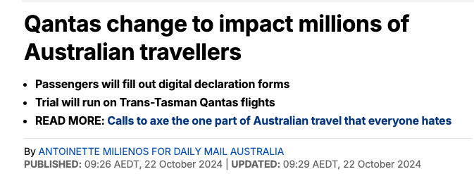 今日话题 入境澳洲,填写纸质入境卡费时费力,很多人都对此感到头疼。不过,好消息是,澳洲即将开始试行数字“澳洲旅行申报”。 ![]() 到时候,乘船、坐飞机进入澳洲,就不需要拿笔填写实体入境卡申报了。 ![]() 率先从澳航的新西兰-澳洲的国际航班上开始实施。 ![]() 具体流程公布。 纸质入境卡被 专家吐槽“过时又尴尬”, 把旅客都吓得不敢来澳洲了。 01 澳洲纸质入境卡要取消了?试点即将开始 入境澳洲,填写纸质入境卡费时费力,很多人都对此感到头疼。 不过,好消息是,澳洲即将开始试行数字“澳洲旅行申报”。 ![]() 到时候,乘船、坐飞机进入澳洲,就不需要拿笔填写实体入境卡申报了。 ![]() 据每日邮报报道,率先从澳航的新西兰-澳洲的国际航班上开始实施。 ![]() 旅客可在抵达前72小时内完成电子申报即可。 ![]() 在澳航的App里填写信息,之后把二维码出示给边检看。 之后这新规将扩大到其他航司,在一段时间内,两种方式会并行。 抵达澳大利亚的旅客必须申报酒精饮料、烟草制品、动物、新鲜食品、植物材料、种子、土壤、肉类和动物产品。 澳洲很早之前是由这些承运公司(一开始只有轮船公司)负责提交入境乘客信息名单的。 ![]() 1954年起,坐飞机来澳洲的人变成需要由本人自己填写一份入境卡。 1965年起,轮船乘客也改为了自己填写。 1972年,飞行乘客和船客的入境卡统一为了一个版本。 ![]() 之后上面新增须声明及申报所携带物品的环节,起初的飞行入境卡的“黄色”设计风格被沿用至今。 对于首次来澳洲的人,填写它时,总是一脸懵! ![]() 除了入境卡,澳洲之前还有着填写出境卡的要求。 ![]() 不过,出境卡已在2017年7月起废除了。 02 遭吐槽“过时又尴尬” 事实上,澳洲是为数不多的仍需海外游客和返乡居民在入境时填写纸质表格的国家之一。 澳媒报道,澳洲商会呼吁联邦政府取消入境卡,这一消息可能让许多旅客感到高兴。 ![]() 有网友吐槽纸质入境卡:“这是有史以来最荒谬的一张纸。像新加坡一样,完全可以在线完成。我理解生物安全的问题,但肯定可以在线完成。” 还有游客称,“去年去了好几个国家,澳大利亚是唯一还在使用这种愚蠢入境卡的国家,这太奇怪了” ![]() (视频截图来源:每日邮报) 商会表示,这张卡片在澳洲旅游业中既过时又尴尬。 据《澳大利亚人报》报道,商会旅游部门的执行主席John Hart表示,这张卡片非常尴尬,会阻止游客再次前往澳洲。 Hart向航空记者Robyn Ironside透露:“我们在疫情期间差点摆脱了它,因为当时引入了一个数字乘客申报系统,但因操作太过糟糕,最终被放弃。” 他说:“如果游客在入境时没有糟糕的体验,他们会更愿意再次访问澳洲。” ![]() (图片来源:澳媒) 他还补充道:“我们通过社交媒体了解到,澳洲在入境卡和旅游退税计划得到了非常负面的评价,游客的回流率也未达到我们的预期。” 不仅是填写表格的过程棘手,在抵达澳洲时找到并出示卡片也会减慢机场通关速度。 ![]() 悉尼机场的一位发言人告诉媒体:“今年第二季度的早高峰时段,国际到达乘客从下飞机到通关,平均花费近一个小时。” 他表示:“时间太长了,我们期待与政府和边防部门合作,改善悉尼机场国际旅客的入境体验。” 03 建议为关键市场提供多次入境签证,并投资人脸识别技术 商会在一份名为《未来游客策略》的报告中提出了改善旅客处理系统的建议,这份报告将递交给新上任的内政和移民部长Tony Burke。 报告建议,为关键市场的旅客提供多次入境签证,并投资人脸识别技术,以替代传统的智能闸门系统。 “面部识别技术已经进行了试验,非常容易实施,并且能取代那些智能闸门机器。这不需要取消闸门本身,但当你接近闸门时,只需面部识别即可通过,非常快捷。” ![]() 尽管技术已经进行了试验,但全面推行尚未得到资金支持,也没有计划进行。 澳洲机场协会(AAA)政策与倡导主管Natalie Heazlewood也表示支持通过采用新技术“为旅客提供无缝便利”。 “尽管这是联邦政府的决策,但任何提高效率、加快旅客通行的措施都会提升旅行体验。边境手续的办理可能会造成入境航站楼的延误,尤其是当边境部队的人员配备出现问题时,因此AAA将欢迎任何用于改善这些流程的额外资金。” ![]() 另一个需要关注的领域是游客退税计划,即游客在提供收据的情况下可以退还在购买点支付的税款。 Hart说:“旅游业是一项太宝贵的资产,我们不能因过时的旅客筛选和处理方法而失去游客,入境游和出境游的花费超过1000亿澳元。我们应当支持自己,发展国际旅游,并吸引回头客。” 今日结语 尤其是初次登陆澳洲的旅客, 纸质入境卡总是让人们一脸懵! 被吐槽: “过时又尴尬”, 受到很多旅客的诟病。 商会呼吁取消纸质入境卡, 如今,真的要取消了! 试点即将开始! 对此,你有什么看法? 欢迎留言评论。 ![]() 今日哥重点推荐阅读 ![]() ![]() Coles和Woolies涉价格欺诈,澳人或得$5000赔偿!数百种商品虚假折扣,先提价后降价,总理发声:别把顾客当傻瓜编辑:Cami 材料来源:每日邮报等 Ref: https://sydney.aichixiu.com/content-1024534468623006?lang=zh-CN https://mp.weixin.qq.com/s/iIYeMWoUPFUTZBAI8UEprA |