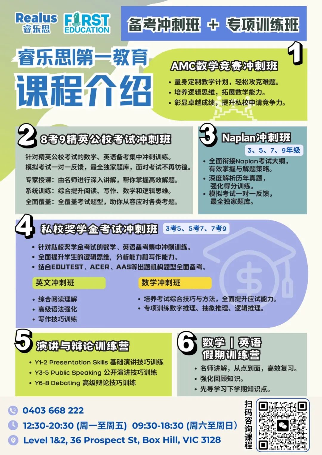 即便在澳大利亚 教育也一直是家长最为关注的话题之一 据澳大利亚辅导协会估算 整个辅导行业的价值已高达15亿澳元 许多家庭不惜花费数千澳元 为孩子报名参加各种奖学金考试辅导 以提升他们进入顶尖学校的机会 ![]() UTS副教授Christina Ho曾表示: "进入精英中学是移民父母确保孩子在新国度有美好未来的关键策略之一。" 他们举全家之力 也要把孩子送到精英学校 为孩子的未来铺就一条康庄大道 ![]() 无论是本地家长还是移民父母 家长的期望都是孩子能考得优异成绩 赢得美好的未来 为了实现这一目标 许多家长都将目光投向了补习机构 在众多补习机构中 第一教育一直以出众的成绩而闻名 凭借多年的教学经验和优秀的师资团队 帮助了无数学子实现他们的名校梦 ![]() 值得一提的是, 第一教育现在正在进行招生优惠活动 ![]() ![]() ![]() ![]() ![]() ![]() ![]() ![]() ![]() ![]() ![]() 向下滑动查看99+高分榜 向下滑动查看学员报喜 ![]() ![]() ![]() ![]() ![]() ![]() ![]() ![]() ![]() ![]() ![]() ![]() ![]() ![]() ![]() ![]() ![]() ![]() ![]() ![]() ![]() ![]() ![]() ![]() ![]() ![]() ![]() ![]() ![]() ![]() ![]() ![]() ![]() ![]() ![]() ![]() ![]() ![]() ![]() ![]() ![]() ![]() ![]() ![]() ![]() ![]() ![]() ![]() ![]() ![]() ![]() ![]() ![]() ![]() ![]() ![]() ![]() ![]() ![]() ![]() ![]() ![]() ![]() ![]() ![]() ![]() ![]() ![]() ![]() ![]() ![]() ![]() ![]() ![]() ![]() ![]() ![]() ![]() 更多优异成绩和同学们对老师的感谢 由于篇幅有限 无法一一展示 但老师们的辛勤付出和睿乐思科学的教学方式 已经在学生们的好成绩和深深的谢意中 得到了最好的体现 ![]() ![]() ![]() 在十五周年庆典上 Nick校长与多位议员合影留念 议员们鼓励全体师生 继续追求卓越 共同为推动教育进步 贡献力量 ![]() 这不仅展现了 议员们对睿乐思发展的关注 也传递了他们对教育事业的支持 与对睿乐思学员们的殷切期望 ![]() 自由滑动直击15周年现场活动照片 点击查看维州议员们对睿乐思学员的鼓励 ![]() ![]() ![]() ![]() 01 02 03 04 05 ![]() ![]() ![]() ![]() ![]() ![]() ![]() ![]() ![]() ![]() ![]() ![]() ![]() ![]() ![]() ![]() 左右滑动解锁更多AMC证书展示 ![]() ![]() ![]() ![]() ![]() ![]() ![]() ![]() ![]() ![]() ![]() ![]() ![]() ![]() ![]() ![]() ![]() 学员爆料!这家机构的效果竟然这么好?! 💗#第一教育睿乐思 “这儿的老师不仅超级专业,还总能让我秒懂难题,考试再也不怕了!” 睿年乐月思日 05:21 ![]() 赞 ![]() 评论 秀小米:旅游是一种情绪消费。远离居住地的旅游愈发成为人们舒缓心境的重要目的… ![]() ![]() ![]() ![]() ![]() ![]() ![]() ![]() ![]() ![]() ![]() ![]() ![]() ![]() ![]() ![]() 左滑解锁学生和家长的真实好评 ![]() ![]() ![]() ![]() ![]() ![]() ![]() ![]() ![]() ![]() ![]() ![]() ![]() ![]() ![]() ![]() ![]() ![]() ![]() ![]() ![]() ![]() ![]() 左滑解锁家长对学管老师们的肯定 ![]() ![]() ![]() ![]() ![]() ![]() ![]() ![]() ![]() ![]() 滑动解锁更多校区场景 ![]() ![]() ![]() ![]() ![]() ![]() ![]() ![]() 滑动解锁更多上课场景 ![]() ![]() ![]() ![]() Glen Waverley 校区 电话|0468489668 ![]() Box Hill 校区 电话|0403668222 ![]() First Edu 我们2025年的长期班课 正火热招生中! ![]() ![]() ![]() ![]() (本文由客户提供,文章内容和信息仅针对澳大利亚) |