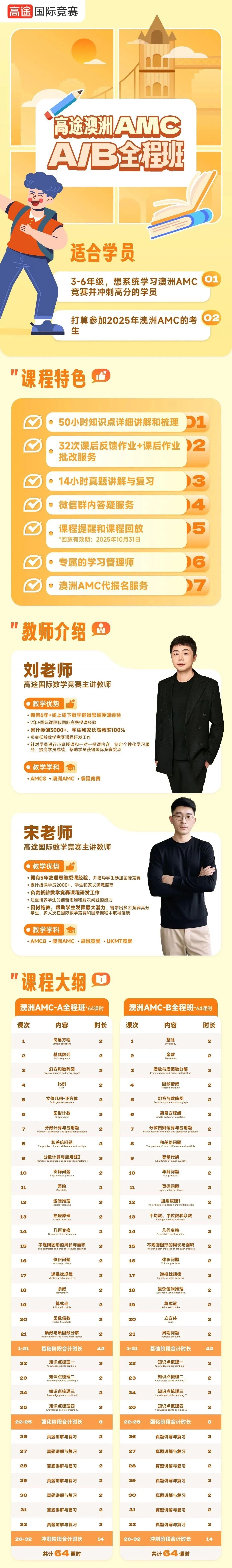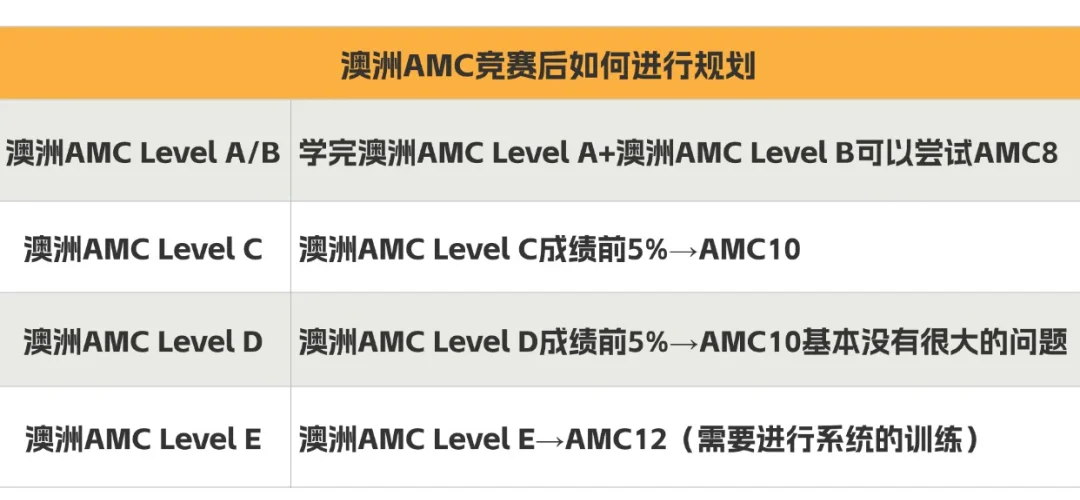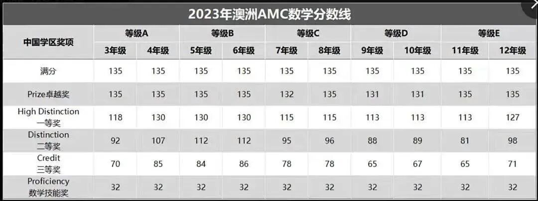 本文为大家介绍:澳洲AMC查分时间、澳洲AMC获奖分数线、澳洲AMC奖项设置、澳洲AMC报名、澳洲AMC课程培训 等内容。 AMC数学竞赛课程 扫码进行咨询 澳洲AMC评分标准 澳洲AMC数学竞赛有levelA、levelB、levelC、levelD、levelE共5个级别,分别对应G3-4、G5-6、G7-8、G9-10、G11-12的学生参加。 澳洲AMC竞赛每个级别的考试都是30道题目,其中25道是选择题,还有5道需要整数答案的题(应用题)。 总分为135分,其中1-10每题3分;11-20每题4分;21-25每题5分;最后5道题,26-30题,各为6、7、8、9、10分(不答或答错不扣分)。 而此竞赛的成绩及奖项的决定因素在于最后10道题目的发挥。因为前20题较为简单,多是可能或介于学校大纲与竞赛数学之间,而21题起,属于挑战题。 澳洲AMC奖项设置 澳洲AMC竞赛分为全球奖和中国区奖项,澳洲AMC分数线就是根据获奖比例对应的分数计算得出的,大家可以先确定自己想要拿到的奖项,再为之进行努力。 *每个难度级别分年级单独评奖,例如等级A包含了小学三年级和四年级同学,则报名三年级的同学和报名四年级的同学分开按照比例评奖,不跨年级混合评比。 澳洲AMC成绩查询流程/时间 一般澳洲AMC考试结束后2个月,将公布最终成绩。澳洲AMC成绩查询流程如下: 微信小程序 1.登录微信-小程序“阿思丹国际理科测评” 2.进入“我的报名” 3.点击对应项目 4.点击“分数查询”即可查看分数 官方网站 1.进入官网:http://www.seedasdan.asia/en/amc-en/ 2.找到查询入口,点击“澳洲AMC”进行查询。 3.进入后跳转页面,输入报名时的手机号,验证后即可查询成绩! 澳洲AMC获奖分数线 2023年澳洲AMC竞赛分数线: 2022年澳洲AMC竞赛分数线: 2021年澳洲AMC竞赛分数线: 从近三年的分数线可以看出,澳洲AMC各奖项的分数线其实是逐年上涨的,要想获得三等奖至少需要70分以上,随着越来越多的人了解国际竞赛,了解澳洲AMC,竞争也就越来越激烈了。 澳洲AMC考后规划 澳洲AMC竞赛按照年级分为 5 个难度级别,难度对标国内数学3-12年级的水平 比较建议3-4年级的学生参与,很多家长让孩子参加澳洲AMC来提升小升初的竞争力,积累竞赛经验,培养数学思维,提升孩子学习数学的自信心。后续进阶AMC8竞赛打基础! 澳洲amc课程培训 了解澳洲AMC竞赛课程安排、费用等 可咨询鹏鹏 长摁二维码添加 |