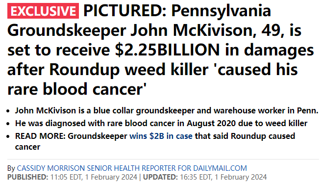 ![]() ![]() 为什么澳洲人特别是华人对于购房情有独钟,必须还是别墅至少也是townhouse呢? 拥有一个属于自己的院子,等于有了自己的一方小天地! ![]() 在这里种花,布置,可以打造出自己最喜欢的休闲空间。 ![]() 有了院子以后,想要保证院子整洁干净,除了勤打扫之外,还有一个是必不可少的, 那就是大家都会头疼的除草! ![]() 澳洲野草的生命力相信大家深有感触,只要不除就会肆意疯长。有些时候甚至可以长到半人高的程度。 所以,有后院的家庭, 很多都常备除草剂! ![]() 澳洲超市也会专门给除草剂留下一个地方,货架上满满都是各类型除草剂。 可是,这个很多华人家庭都会常备的东西,竟然被爆出可能存在巨大问题! 可能会致癌! ![]() 澳洲有数百人针对除草剂Roundup发起了一项集体诉讼, 诉讼这款热门除草剂,有致癌风险! ![]() Roundup除草剂可以说是澳洲最热门的除草剂之一,很多华人都喜欢购买。 但是没人想到,它竟然与癌症扯上了关系... 数百名已经患癌的澳洲人表示,Roundup除草剂之中还有一种名叫草甘膦的成分, 这种成分,就是他们患癌的罪魁祸首! ![]() 整整800多名澳洲人啊,他们全都是非霍奇金淋巴瘤患者,他们都认为是长期接触除草剂才让自己患上了癌症。 于是他们选择集体诉讼的方式,将生产Roundup的Monsanto公司告上了法庭。 ![]() 又因为Bayer公司在2018年完成了对Monsanto的收购,现在这800多名澳洲人的起诉对象也就成了Bayer公司。 旗下产品可能致癌,这对于任何一个公司都是致命丑闻,所以Bayer公司也积极应诉。 ![]() Bayer公司表示,含草甘膦的除草剂已在数百项研究中经过严格测试, 科学证实按照指示使用时草甘膦是安全的! ![]() 联邦法院法官Michael Lee将会在近期对这起案件进行裁定。 判决核心点就在于: 草甘膦是否具有致癌性! ![]() 如果确认致癌,它是否能够导致人类患上非霍奇金淋巴瘤。 一位名叫Kelvin McNickle昆士兰40岁男子表示,自己从小就跟随父亲使用Roundup喷洒杂草,成年后工作中也经常接触,直到2018年被诊断出患有非霍奇金淋巴瘤。 ![]() 他用自己的亲身经历证明,Roundup除草剂真的有危害,长期接触可能会导致患人们癌症。 如果最终裁定产品致癌,Bayer公司恐面临天价赔偿,毕竟这可是一起涵盖800多人的集体诉讼案,要进行赔偿也是对所有人进行赔偿... 墨小编每天第一时间跟大家分享墨尔本最新的大事小事,记得关注墨尔本生活资讯,接下来那些吃喝玩乐奇闻趣事跑不了的! ▼长按这个二维码▼ 墨尔本新闻抢先知道! ![]() 致癌性较低并非不致癌 已有类似案件被裁定 其实关于草甘膦是否致癌这一点,一直都有广泛争论,就连中国官方都进行过回应: 有致癌性,但致癌性较低! ![]() 中国官方对于草甘膦的回应是,因为日常我们接触草甘膦的机会非常少,所以风险可以接受。 但是如果大量接触的话,风险可能会成倍增加。 大部分中国居民和澳洲居民不同,住房结构的差异性让澳洲人对于除草剂的依赖更大,所以澳洲人接触除草剂的次数更多。 ![]() 所以从几率上分析,澳洲人容易被草甘膦影响的概率也更大。 其次,还有一个事情大家可能需要警惕,在美国,Bayer公司旗下产品Roundup除草剂已经被确定会致癌... ![]() 美国法院裁定,Bayer公司因为旗下产品Roundup除草剂致癌问题, 被判赔偿22.5亿美金! ![]() 起诉Bayer公司的是宾夕法尼亚州一名场地管理员John McKivison,他在2020年被检测出患有非霍奇金淋巴瘤。 在过去的20年时间里,他因为工作原因频繁接触除草剂,也正是因为这一点,他患上了癌症。 ![]() 最终,经过长时间审理,法院裁定Bayer公司赔偿John McKivison 22.5亿美金。 这其实并非Bayer公司第一次因为Roundup被判定进行巨额赔偿。 2019年,旧金山法院裁定Bayer公司向多名非霍奇金淋巴瘤进行8600万美金巨额赔偿。 截止2024年的2月份,仅在加利福尼亚州就有4732起针对Roundup的诉讼案还没有结案。 ![]() 这么多的诉讼案也可以看得出Roundup除草剂这款产品或许真的存在问题。 而澳洲这800多名患癌者或许真的可能与除草剂有关,如果这些人也诉讼成功,Bayer公司在澳洲可能也要支付巨额赔偿了。 虽然目前还没有完全确认,不知道Roundup除草剂是否真的致癌,大家还是尽可能少接触吧,没有风险才是最安全的! 关于我们 Perfect Lover——作为澳洲新西兰最大的华人婚恋交友平台之一,不定期在各大城市举办各类主题的线上线下交友活动。 ![]() ![]() ![]() 澳洲上万人线上线下首选脱单平台——70后、80后、90后、00后优质单身男女聚集地。 ![]() ![]() ![]() ![]() Perfect Lover公众号 每周都会推荐 优质单身男/女 ![]() 如果你正好在 澳洲或新西兰 如果你 年龄在20-45岁 如果你是 单身 ![]() 脱单添加小红娘微信 ![]() 说出你的要求和条件 为你匹配Perfect Lover! (本文图片均来自网络) ![]() ![]() ![]() ![]() ![]() ![]() ![]() 告诉大家一个了解墨尔本生活资讯的小诀窍。现在只要点亮一个小星星🌟,每天就能在第一时间看到各种最新鲜的资讯!墨尔本哪里打折💰,哪里有好玩的活动🎉,哪里的餐厅最实惠🍰,哪里有同乡聚会👬,还有墨尔本各种政策福利、隐藏技能,全都知道啦! ![]() ![]() ![]() 冰雹!100km/h狂风!今天墨尔本人却不按常理出牌,让全世界见识了什么叫优雅!![]() 刚刚!澳洲街头被亿万大军染红!气势汹汹爬向海边!壮观场面震撼全世界!看得华人都兴奋了…![]() 澳洲女老师确诊新冠2天内去世!7岁女童确诊3天去世,