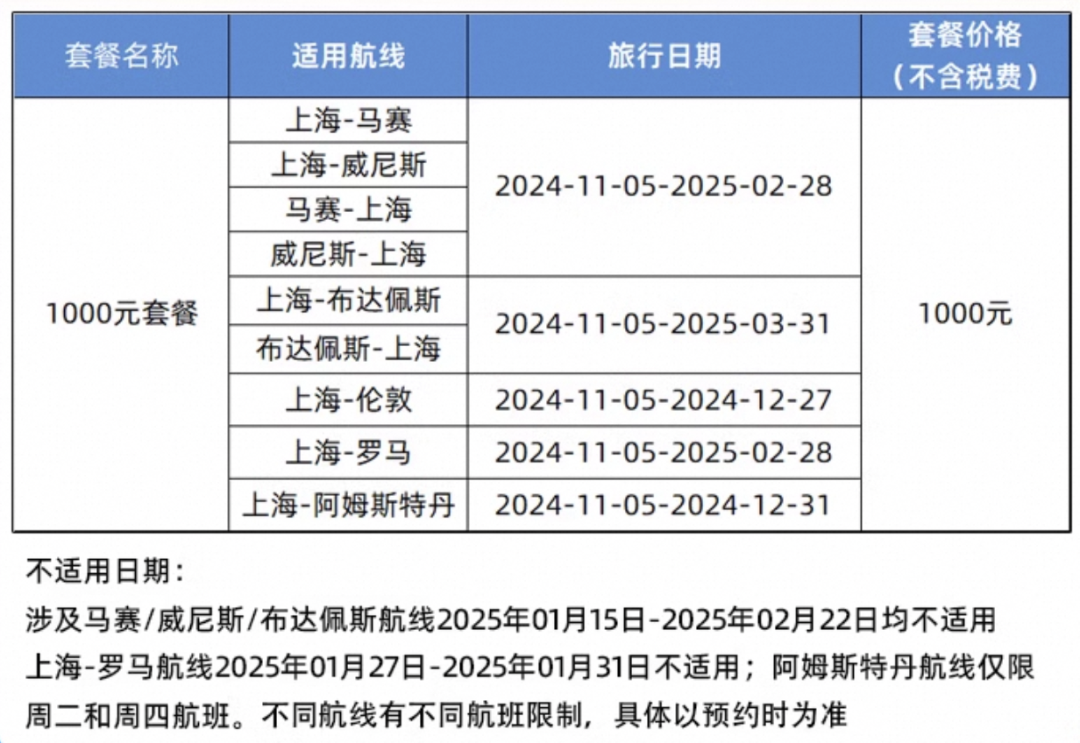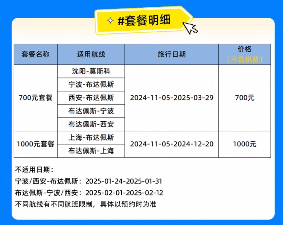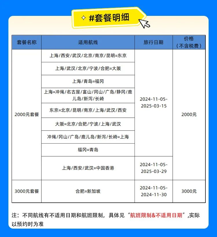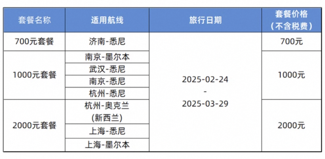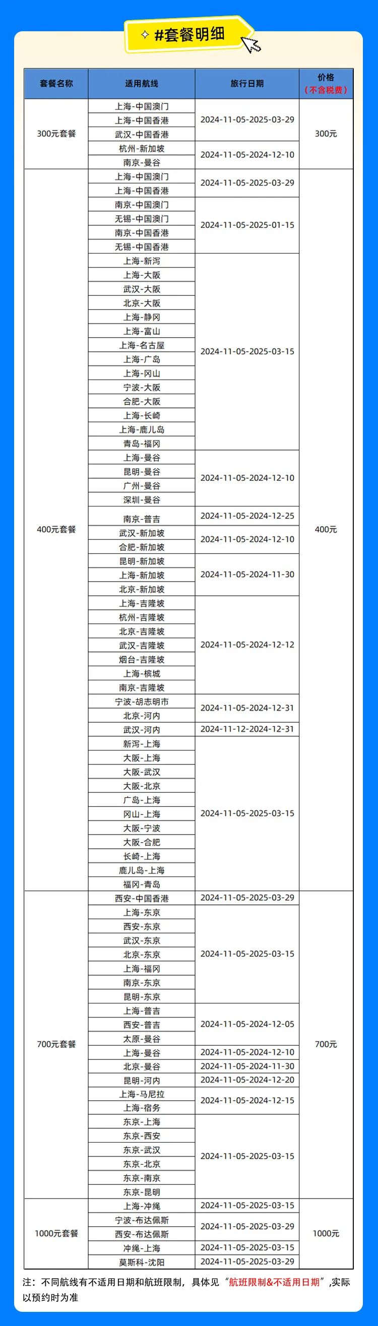 具体来看看吧: ▼▼▼▼▼ 东方航空 往返澳大利亚/新西兰=700元起(不含税) 预约有效期至:24年11月11日 旅游日期至:25年3月29日 复制口令,打开飞猪/淘宝: 98¥ CZ0016 2EgP3pXJ5ek¥ https://m.tb.cn/h.gzZZxsF 旅行就上飞猪 ![]() 国内东航飞澳洲,税费在2000元左右,加上后,江浙沪飞澳洲3000元左右往返!非常划算了! 澳新是南半球,我们冬天的时候,他们正是夏天!去度假一个反季旅行吧! 东方航空 上海飞欧洲 单程=1000元起(不含税) 预约有效期至:24年11月11日 旅游日期至:25年3月31日 复制口令,打开飞猪/淘宝: 67¥ CZ3460 T3n23pXtj4w¥ https://m.tb.cn/h.gzZXow0 旅行就上飞猪 ![]() 注意,这是一个单程的机票,往返在适用航线内可以购买两张!马赛、威尼斯、布达佩斯都可以往返(需要拍两份),伦敦、罗马、阿姆斯特丹都是单程,上海出发~ 往返税费参考的话,欧洲差不多都在3000元左右! 东方航空 国际经济舱单程次卡-欧洲=700元起(不含税) 预约有效期至:24年11月11日 旅游日期至:25年3月29日 复制口令,打开飞猪/淘宝: 18¥ CZ3460 VLe63mYbobJ¥ https://m.tb.cn/h.gwgcI2X 旅行就上飞猪 ![]() 单程税费(供参考): 沈阳→莫斯科:1117,宁波/西安/上海→布达佩斯:1319 东方航空 国际经济舱往返次卡=300元起(不含税) 预约有效期至:24年11月11日 旅游日期至:25年3月29日 复制口令,打开飞猪/淘宝: 87¥ HU9046 ANta3mYgf1t¥ https://m.tb.cn/h.gExEn9f 旅行就上飞猪 ![]() 下滑查看更多 东方航空 国际公务舱往返次卡=2000元起(不含税) 预约有效期至:24年11月11日 旅游日期至:25年3月29日 复制口令,打开飞猪/淘宝: 58¥ CZ3452 7j5J3mYTvyC¥ https://m.tb.cn/h.gExDZ49 旅行就上飞猪 ![]() 东方航空 境内经济舱单程机票卡=199元起(不含税) 预约有效期:至24年12月28日 旅行有效期:至24年12月31日 复制口令,打开飞猪/淘宝: 27¥ CZ3452 Etse3nugLj3¥ https://m.tb.cn/h.gxnzuk4 旅行就上飞猪 ![]() 下滑查看更多 东航飞国内的机票次卡!上海、武汉、昆明、南昌、西安、北京、南京等地出发的宝子可以看看这个! ▼▼▼▼▼ 如果想要知道更多的好货信息,可以时刻关注飞猪公众号、直播间和社群哦~ 加飞猪公众号编辑部社群👇 双11时间较长,文章篇幅有限, 很多第一手的信息,我们都会私信、群内告知, 不想错过的,加我们小编的微信吧~ ![]() |