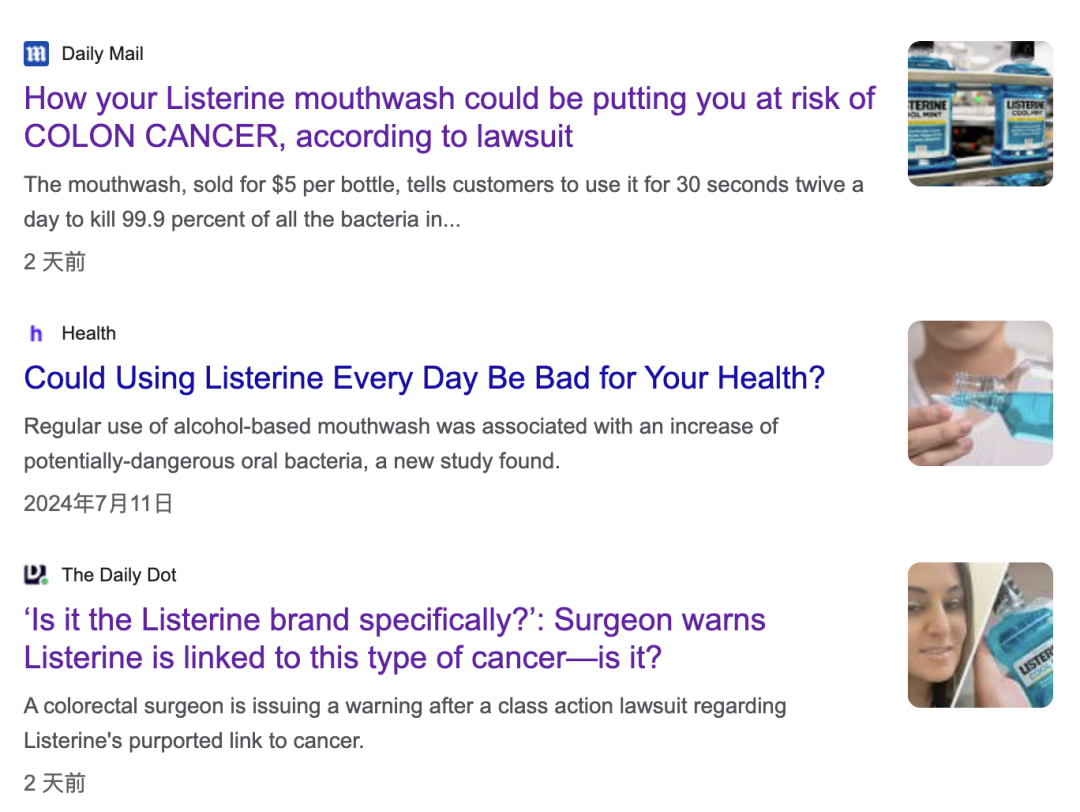 ![]() ![]() 最近,一款畅销全球的日用品 被曝出含有致癌风险 消息瞬间冲上各国新闻版面! ![]() 澳洲人家中常备 洗漱用品有患癌风险! 漱口水一直被大家认为是改善口腔卫生、解决牙齿问题的好帮手,更是很多人家中常备的用品,每天都在使用。 然而,一份研究结果却令所有人破防了: 一款畅销全球的Listerine漱口水 可能含有致癌的风险! ![]() Listerine的消费者目前正在起诉其生产商强生公司,声称该产品使他们面临患癌的风险。 这款漱口水在 澳洲超市、药店随处可见, 可以说是一款家家常用的畅销品... ![]() ![]() Listerine品牌声称,漱口水能够在30秒内杀死口腔中99.9%的细菌,推荐用户每日使用两次。 但是效果却截然相反, 用了漱口水后, 口腔里的细菌反而更多了… ![]() 在一项早期研究中发现: 薄荷口味的Listerine漱口水 将会增加与咽喉癌 和结肠癌相关的细菌水平! 如果大家频繁使用Listerine漱口水,可能会导致细菌增加: ![]() 核梭杆菌(Fusobacterium nucleatum)和咽峡链球菌(Streptococcus anginosus)的水平上升,这两种细菌与食管癌及结肠癌存在关联。 同时,使用漱口水会导致口腔内一种有益细菌,放线菌(Actinobacteria)的减少,放线菌对于减少炎症、保护人体免受癌症侵袭方面具有重要作用。 这起集体诉讼的原告Paige Vasseu从2019年到2024年2月一直定期购买该产品。 她声称:如果早知道潜在的风险,她不会选择购买! Vasseu认为,Listerine应在瓶身上附加“可能致癌”的警告标志,并寻求赔偿产品购买费用。 近年来,年轻人群体中结肠癌 和喉癌的发病率迅速上升! ![]() 预计到2030年,20至34岁之间的年轻人中,早发性结肠癌的诊断率将比2010年上升90%。 医生认为,肥胖、食品添加剂及肠道菌群失调等因素都可能是导致癌症高发的原因。 此外,喉癌发病率的上升则与一种常见的性传播疾病——人乳头瘤病毒(HPV)感染密切相关。 因此,大家想要避免癌症风险,还是一定要关注生活中的细节。 ![]() 在今年9月初,这份长达35页的诉讼文件已经提交至加利福尼亚州中央区联邦地方法院。 目前,强生公司尚未对此最新诉讼作出回应。 同时,专家提出建议: 做好这两件事, 比使用漱口水更有效! 昆士兰生活资讯每天第一时间跟大家分享昆士兰最新的大事小事,记得关注昆士兰生活资讯,接下来那些吃喝玩乐奇闻趣事跑不了的! ▼长按这个二维码▼ 昆士兰新闻抢先知道! ![]() 专家建议: 不要依赖漱口水! 英国牙科协会健康科学委员会主席Mick Armstrong博士表示: 漱口水并不能替代正确的刷牙, 尤其是含有酒精或氯的产品! ![]() 这类成分旨在杀菌,但也会消灭有益于口腔健康的“友好菌”,而这些菌正是口腔生态的守护者。 过度使用漱口水可能 会带来潜在的危害! Armstrong博士强调:漱口水无法清除食物残渣或细菌滋生的基质,过度使用可能导致牙齿酸蚀或更易染色。 ![]() 专家建议:大家应该正确护理口腔,避免过度依赖漱口水。 那么到底如何正确护理口腔, 下面两点一定要注意! 01 刷牙:彻底清洁更有效 ![]() 刷牙是口腔清洁的基础,使用正确的刷牙方法可以有效去除牙齿表面的细菌、食物残渣和牙菌斑。 许多人习惯性刷牙只花不到两分钟,甚至有时候会忽略到牙齿的某些部位,这样的清洁并不彻底。 专家建议每天至少刷牙两次, 每次持续两分钟! 确保牙刷能够覆盖到所有牙齿的表面,特别是后牙等容易忽略的区域。 此外,选择含氟牙膏可以进一步增强牙齿对酸性物质的抵抗力,帮助预防蛀牙。 02 牙线:深入清洁牙缝,预防牙龈炎 ![]() 刷牙可以清洁大部分牙齿表面,但牙刷难以触及的牙缝是细菌和食物残渣的藏身之地,长期堆积会引发牙龈炎和牙周病。 使用牙线可以深入清洁牙缝, 去除牙刷难以清除的 牙菌斑和食物残留物! 研究显示,定期使用牙线可以有效降低牙龈出血、牙龈炎等问题的发生率,进而有助于预防口腔疾病的产生。 因此,建议每次刷牙后都使用牙线清洁牙缝,保证牙齿和牙龈的健康。 关于我们 Perfect Lover——作为澳洲新西兰最大的华人婚恋交友平台之一,不定期在各大城市举办各类主题的线上线下交友活动。 ![]() ![]() ![]() 澳洲上万人线上线下首选脱单平台——70后、80后、90后、00后优质单身男女聚集地。 ![]() ![]() ![]() ![]() Perfect Lover公众号 每周都会推荐 优质单身男/女 ![]() 如果你正好在 澳洲或新西兰 如果你 年龄在20-45岁 如果你是 单身 ![]() 脱单添加小红娘微信 ![]() 说出你的要求和条件 为你匹配Perfect Lover! (本文图片均来自网络) ![]() ![]() ![]() ![]() ![]() ![]() ![]() ![]() 昆州人都爱看的 昆士兰生活资讯 ![]() 澳洲女士半夜遭重创,老鼠正在啃食她的眼球!婴儿被咬的血肉模糊,饥饿的老鼠已经把人当成了食物![]() 因为两只猫头鹰,澳洲1.53亿的大项目直接停摆,就在华人区!所有人都惊呆了!![]() 很快,澳洲宠物猫要被完全圈禁!一旦走出家门就会被重罚!竟然是为了挽救4亿澳洲生灵!![]() 澳洲四步防疫计划被骂惨!第一步就错了!撤侨航班翻倍、把新冠当流感对待,会死很多人的…![]() 你敢信?澳洲政府为了挽救昆州经济,专门制定了一个全新签证!华人返澳又多了一个新途径![]() 昆州将成澳洲经济中心!从悉尼墨尔本抢走8.6万人!原因曝光,全是重大利好!![]() 102岁华人奶奶被骗37.5万!一群犯罪分子盯上了澳洲华人,一封邮件就能骗走全部身家![]() 澳洲危险了!新变异病毒出现,能逃过核酸检测,已感染8人全部